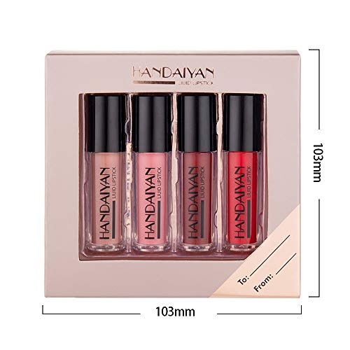 Introducing the HANDAIYAN Matte Liquid Lipstick Collection - Set of 4 Stunning Shades! ???? ?? Vibrant Red: Stand out from the crowd with the enchanting beauty of our iconic ?? Enchanting Ruby shade. ?? Soft and Elegant: Embrace a touch of warmth with our versatile mauve lipstick, ?? Captivating Mauve, suitable for all occasions. ?? Bold and Daring: Command attention and unleash your inner charisma with the daring berry color of our ?? Daring Berry lipstick. ? Timeless Beauty: Achieve a sophisticated and effortlessly chic look with our classic nude shade, ?? Timeless Nude. ?? Long-lasting and Transfer-proof: Our matte liquid lipsticks stay on for hours, ensuring a ?? flawless finish and no need for touch-ups.