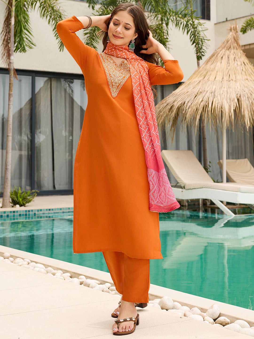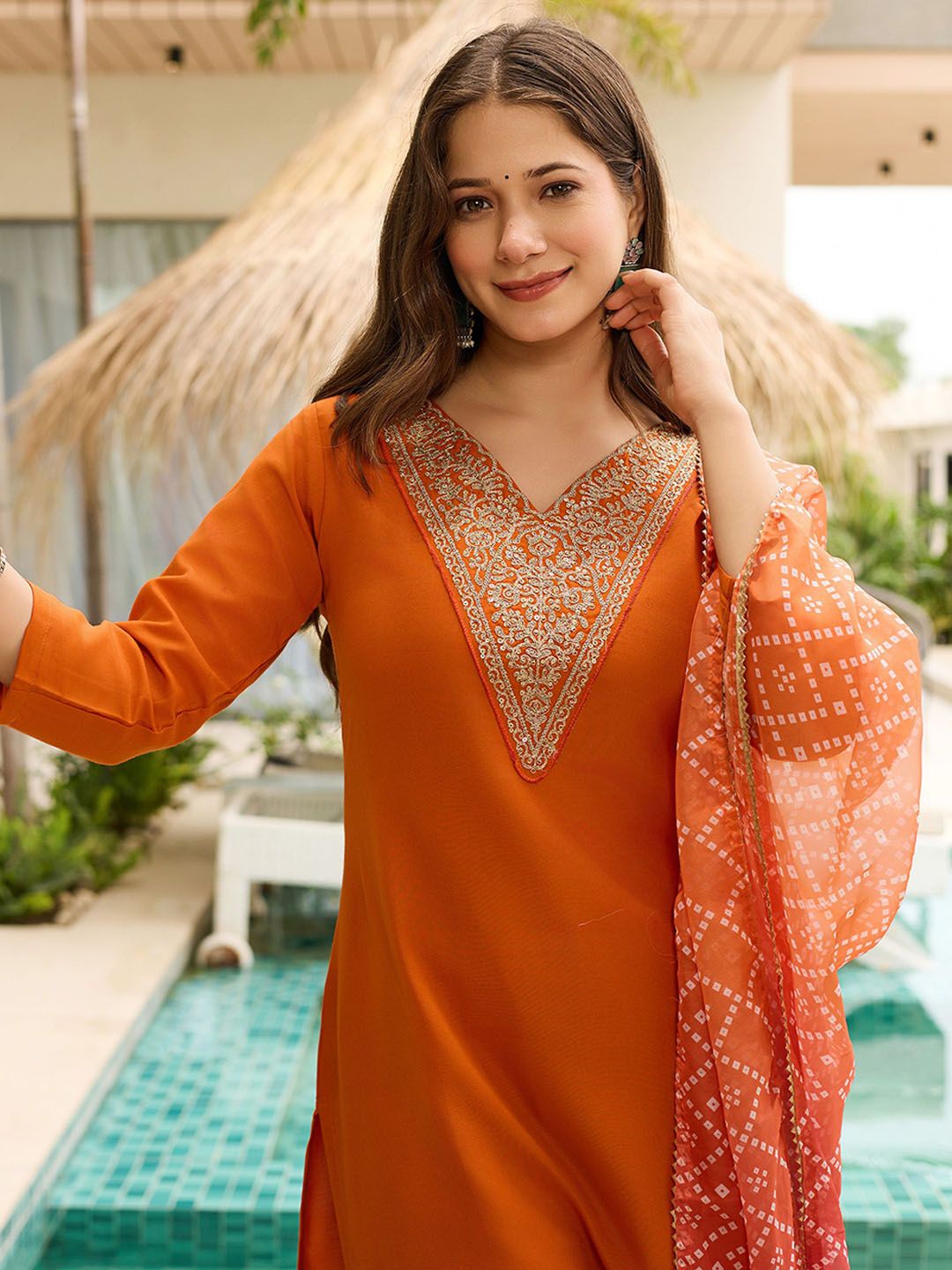 KALINI Ethnic Motifs Embroidered Round Neck Sequinned Kurta With Trousers & Dupatta