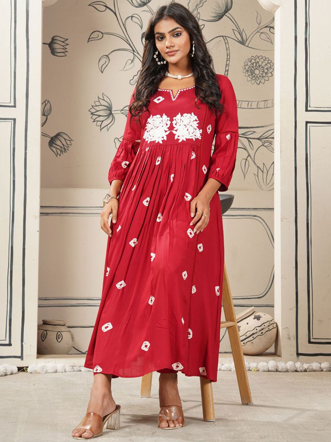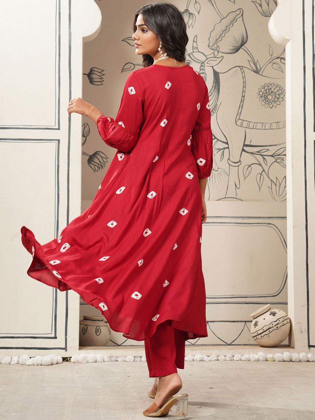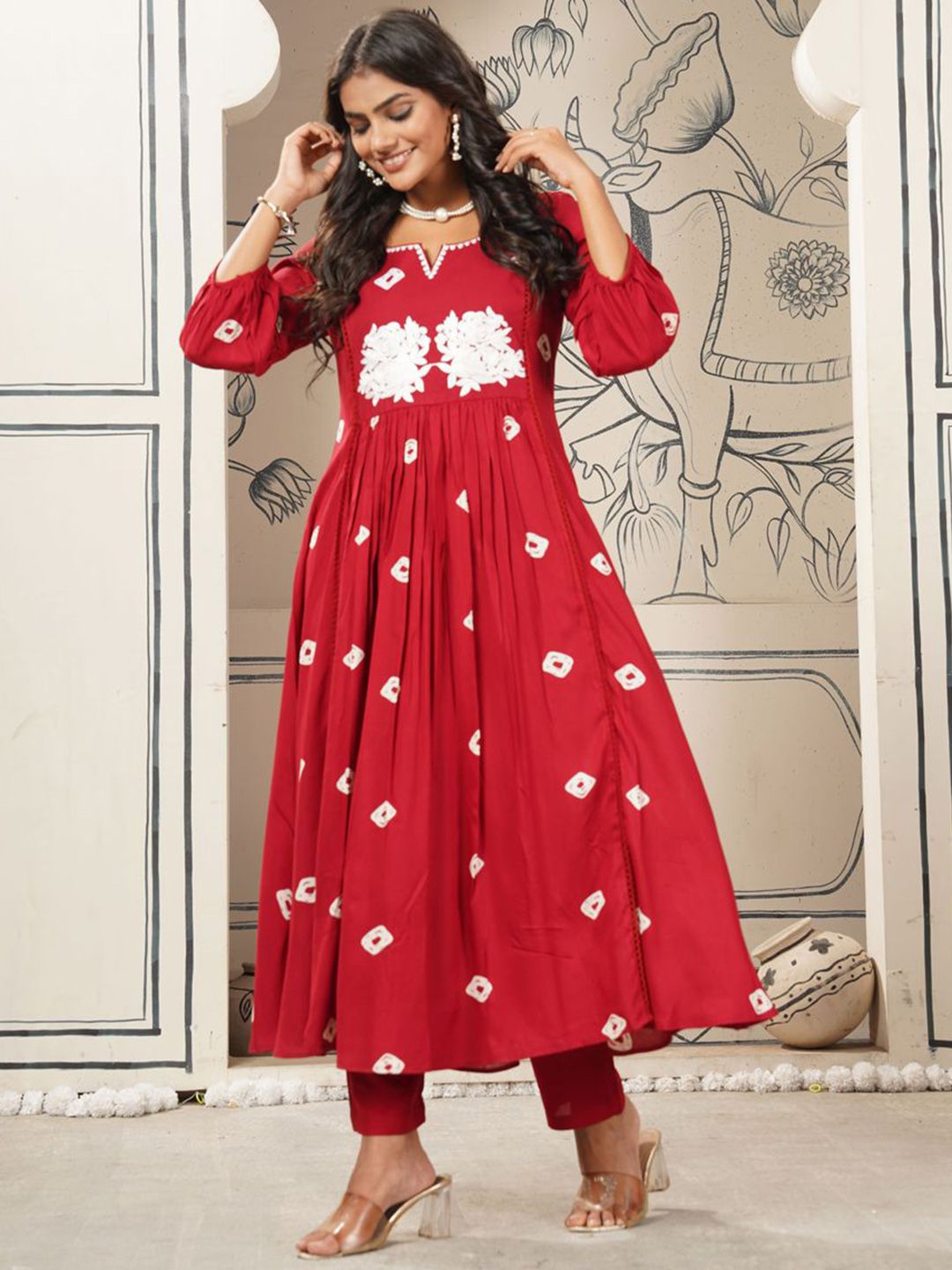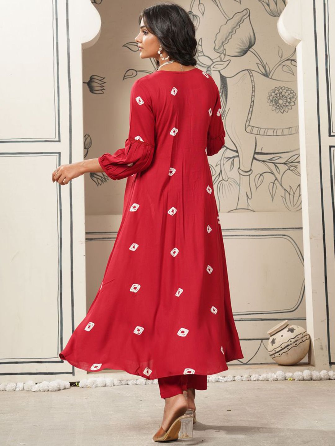KALINI Bandhani Printed Notch Neck Anarkali Kurta With Trousers