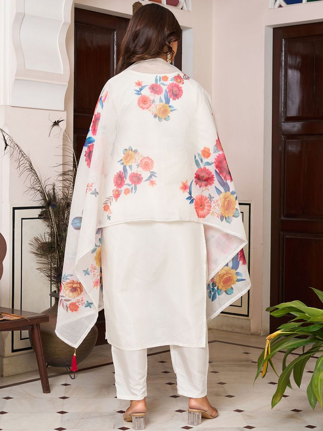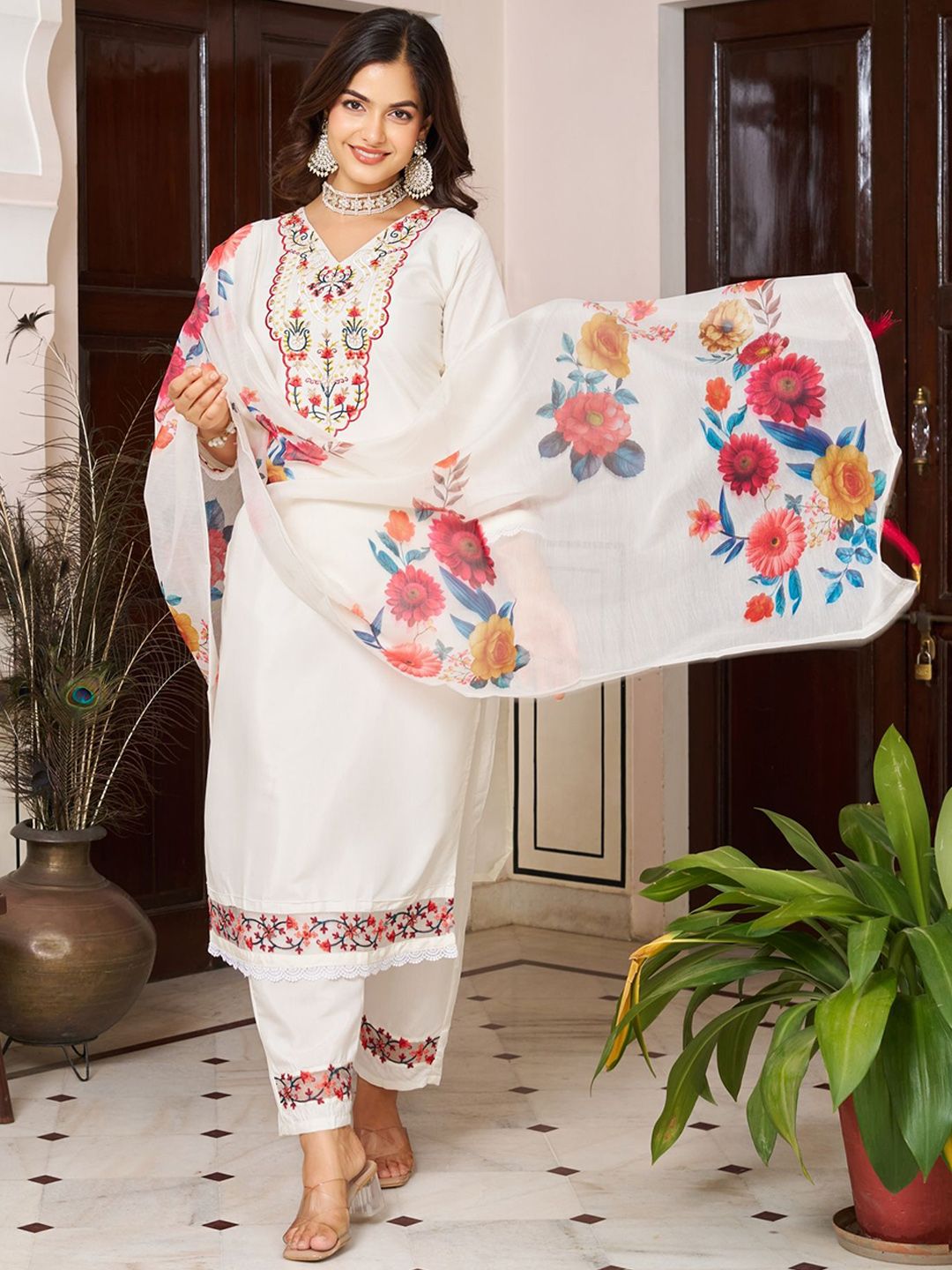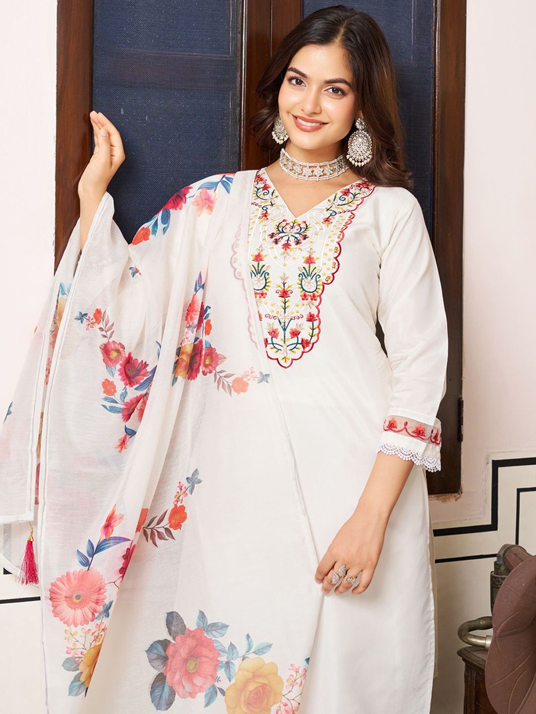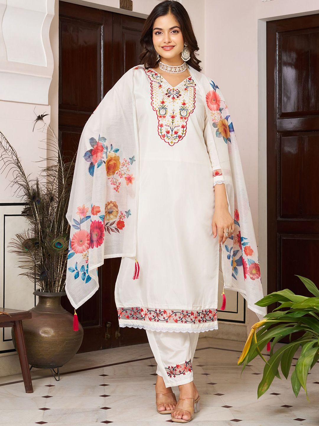 KALINI Embroidered Straight Thread Work Chanderi Silk Kurta With Trousers & Dupatta
