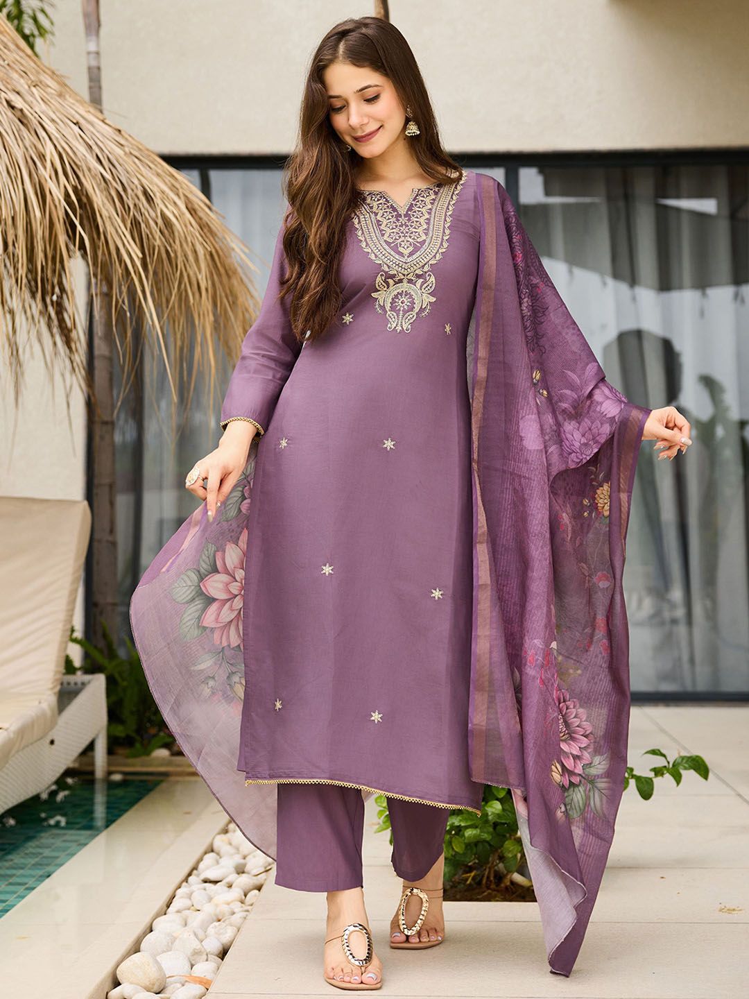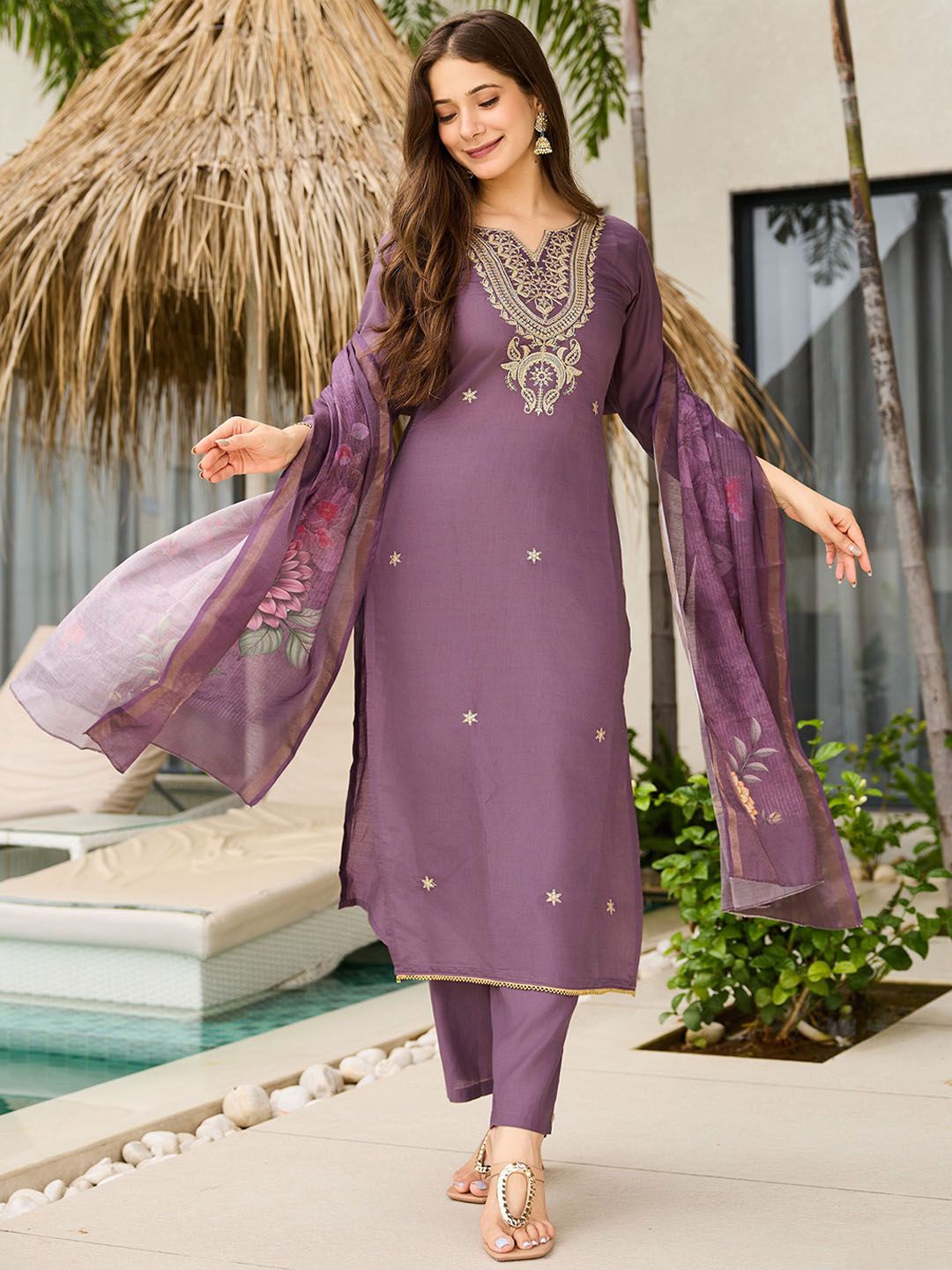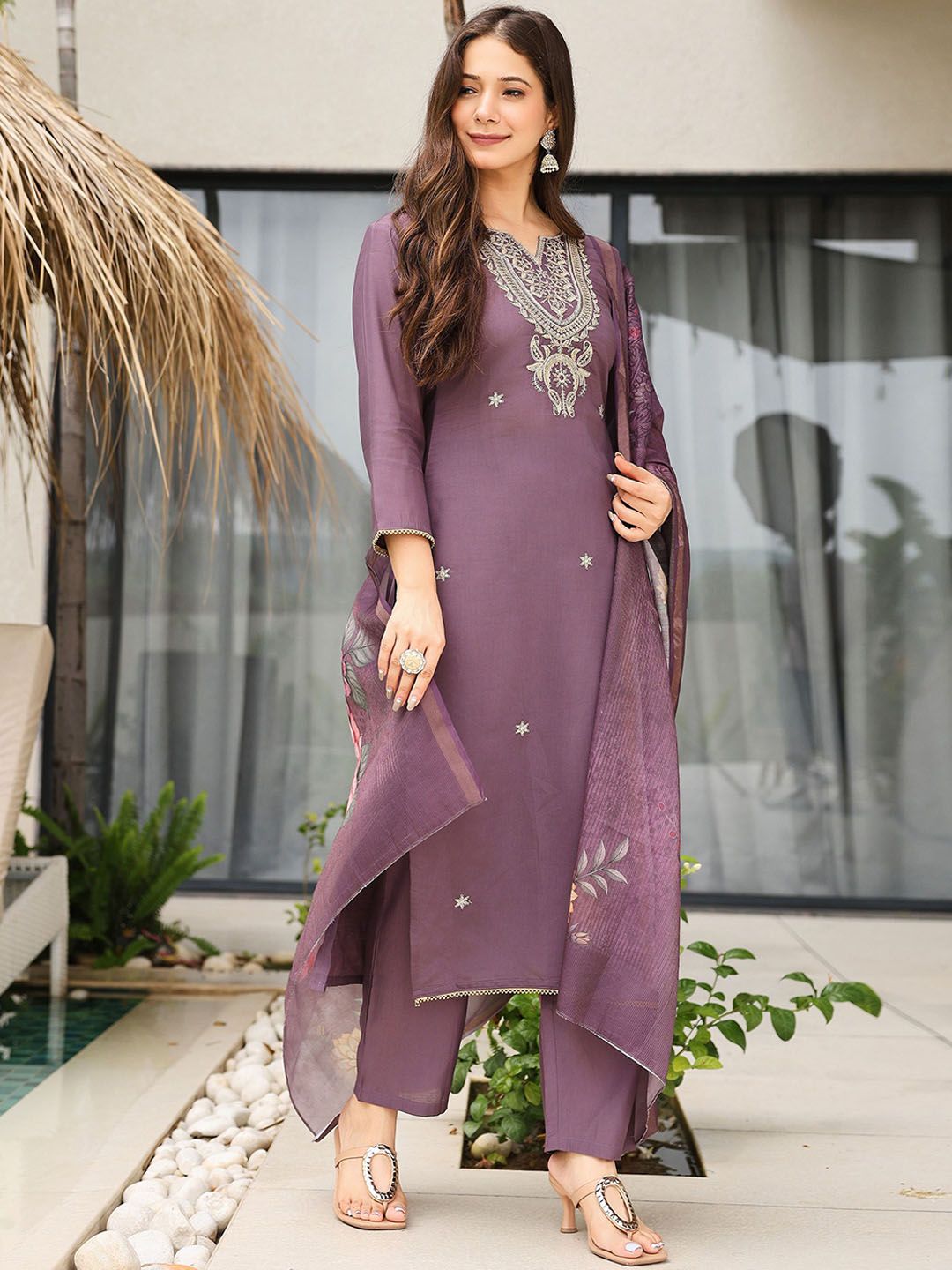 KALINI Ethnic Motifs Embroidered Notch Neck Zari Straight Kurta With Trousers & Dupatta