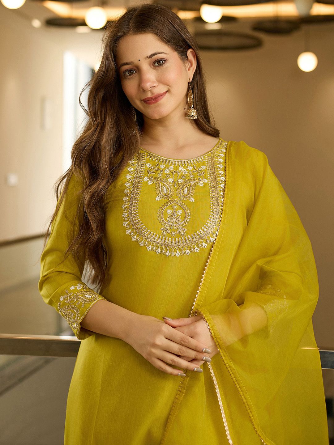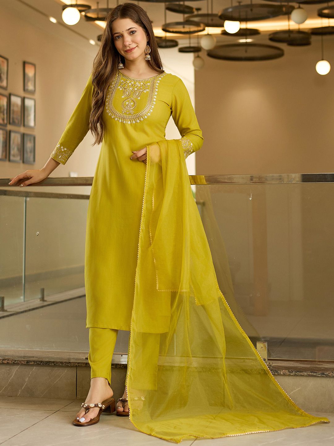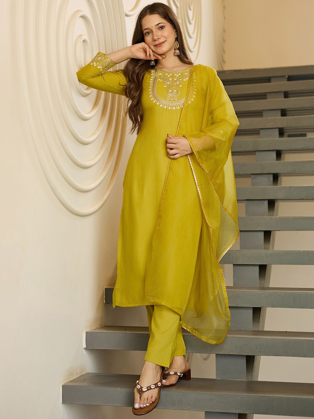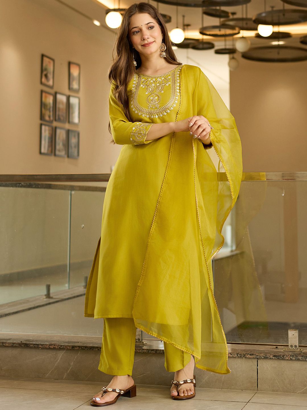 KALINI Ethnic Motifs Embroidered Straight Thread Work Kurta With Trousers & Dupatta