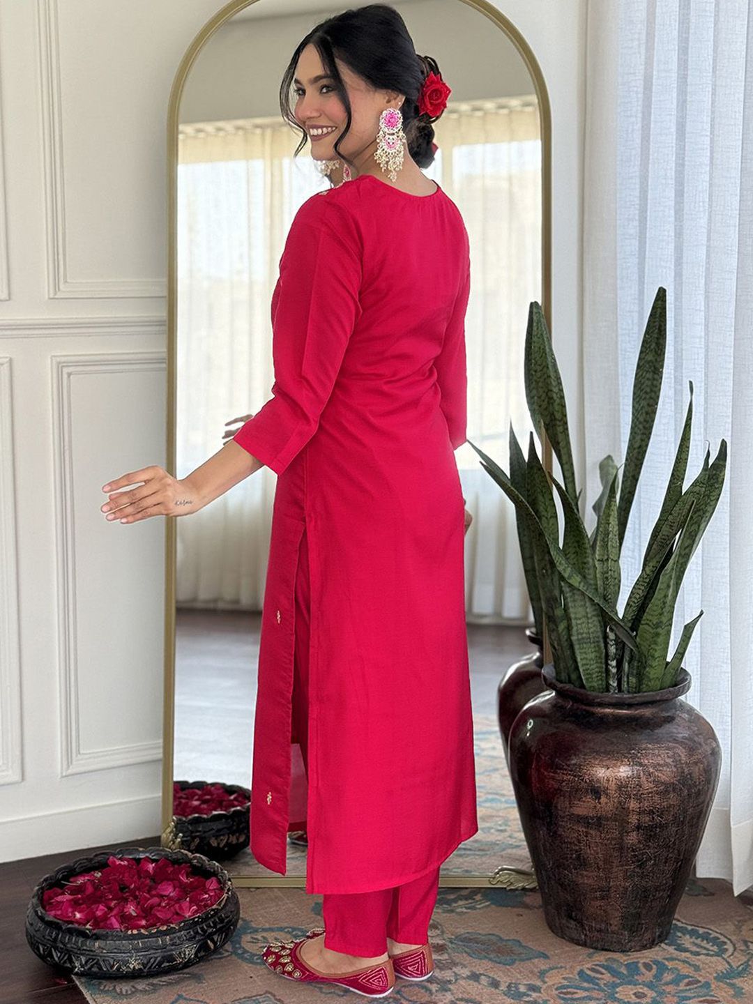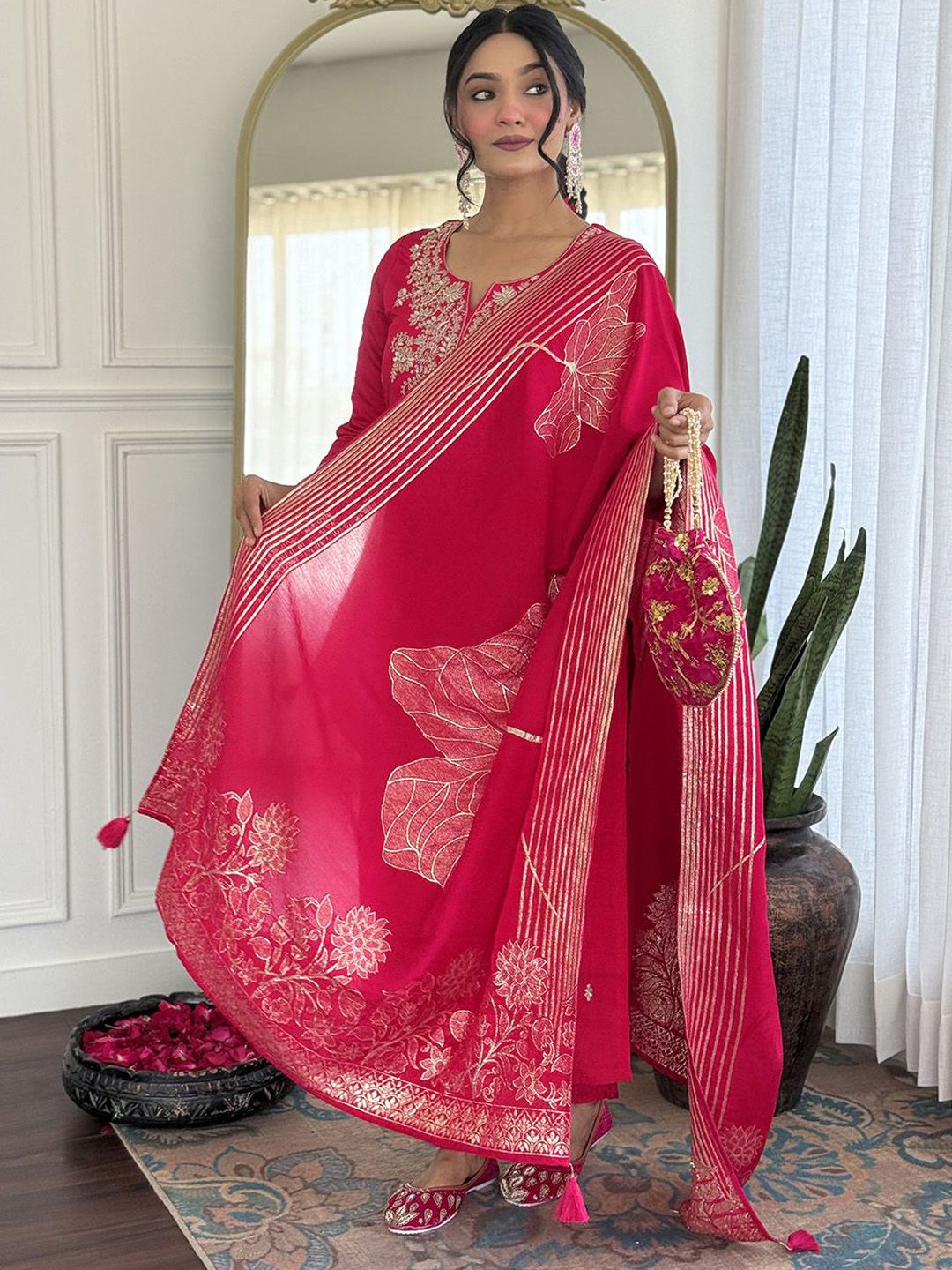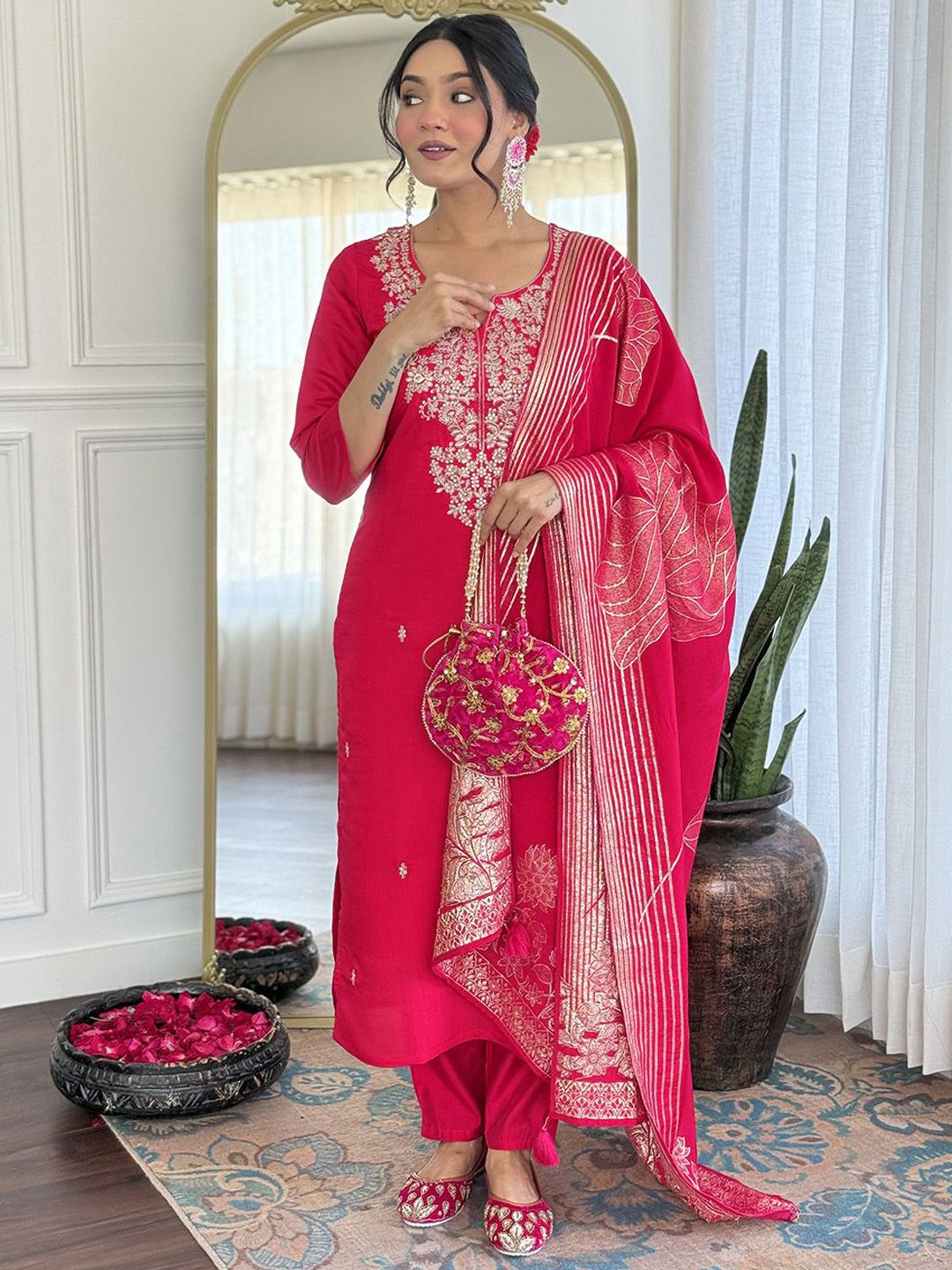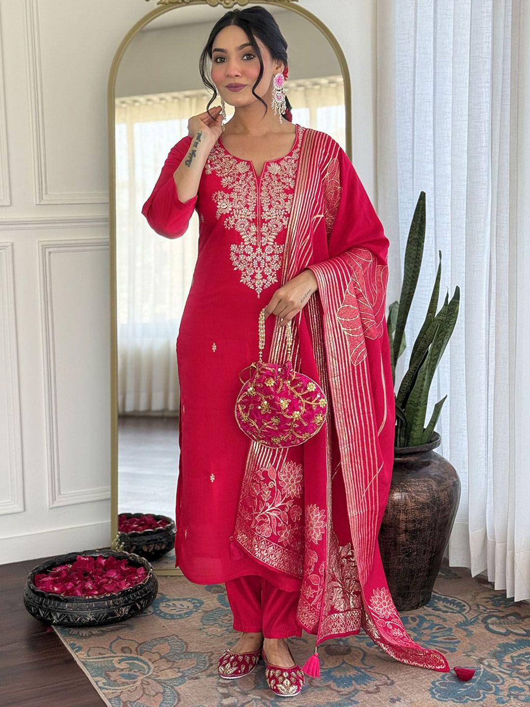 KALINI Ethnic Motifs Embroidered Straight Thread Work Kurta With Trousers & Dupatta