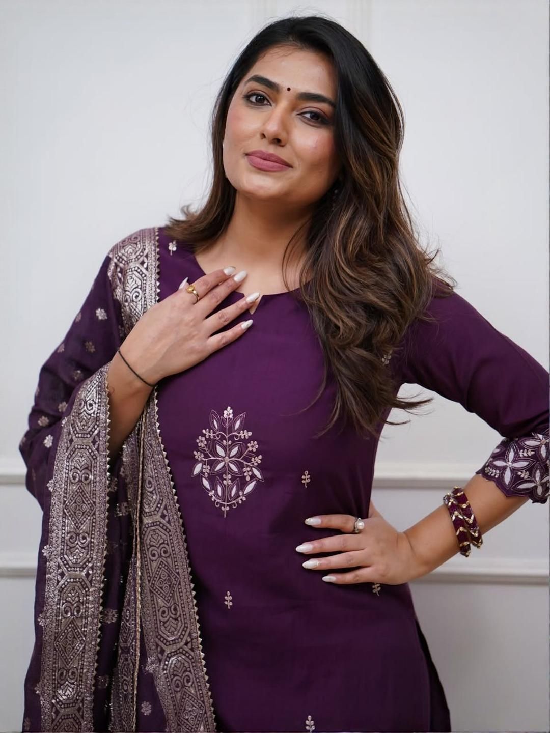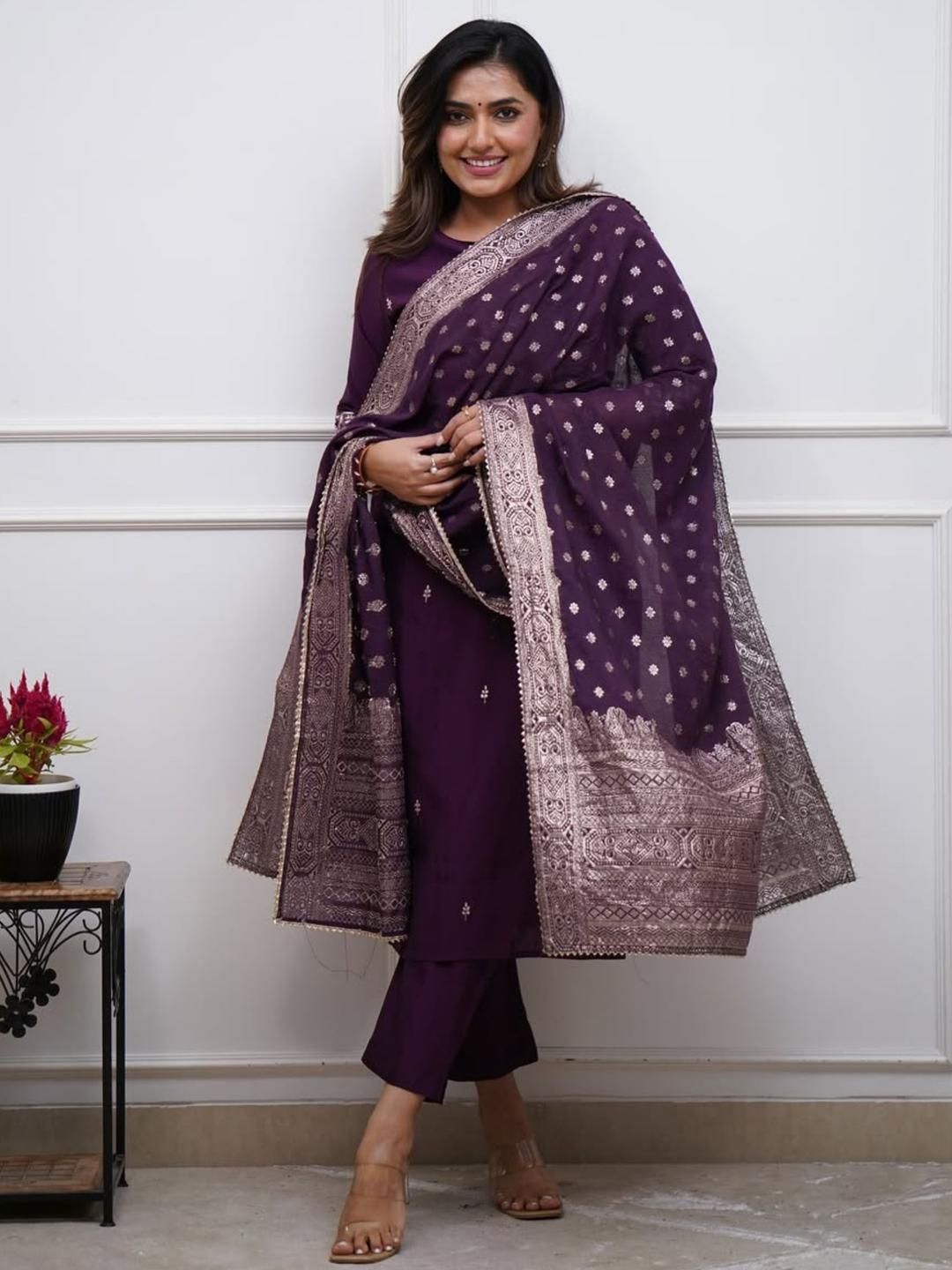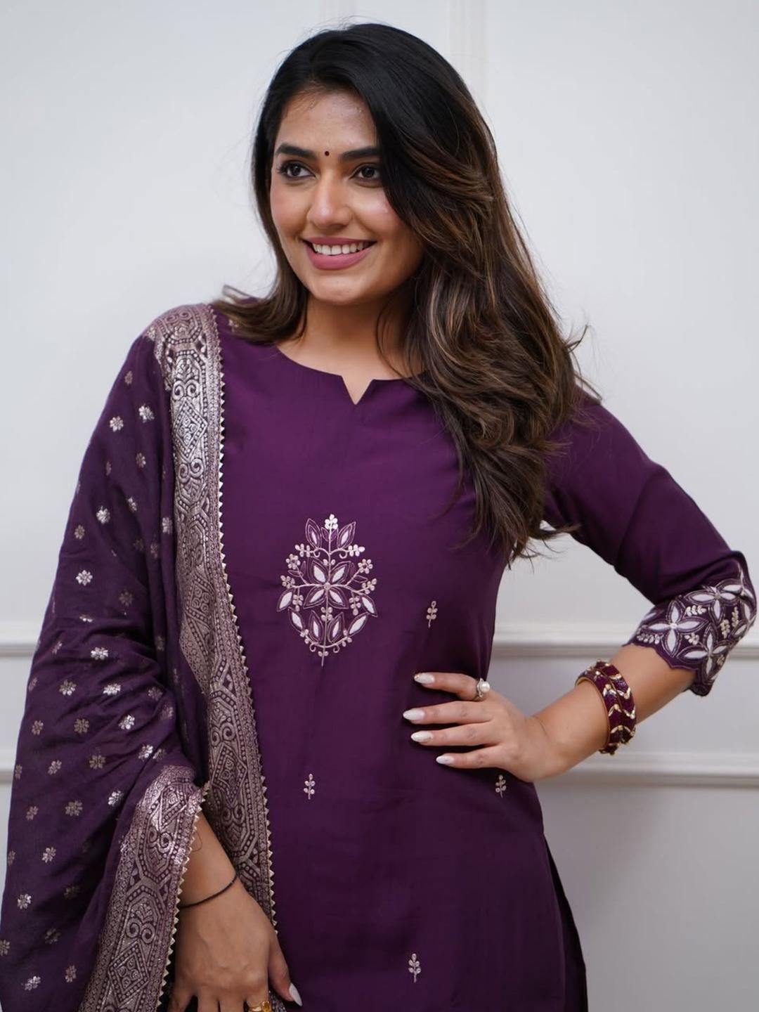 KALINI Floral Embroidered Chanderi Silk Kurta with Trousers & Dupatta