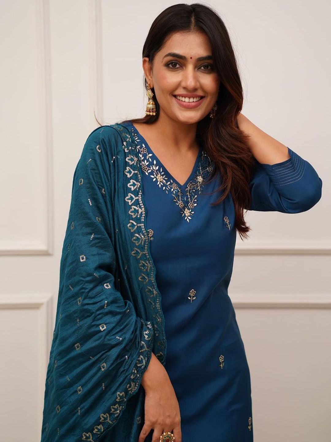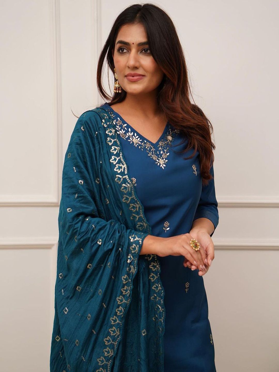 KALINI Floral Embroidered Chanderi Silk V-Neck Straight Kurta With Trousers And Dupatta