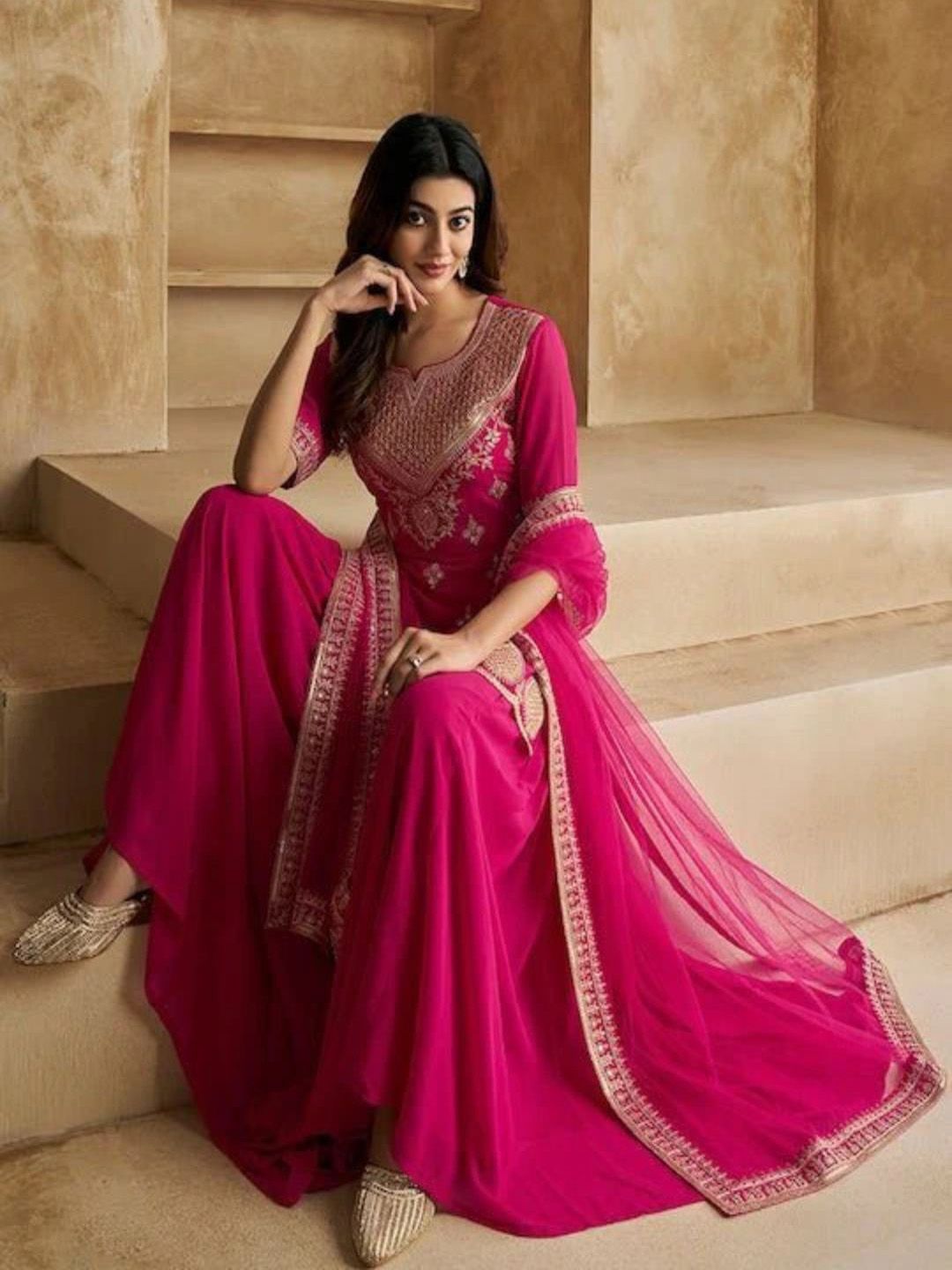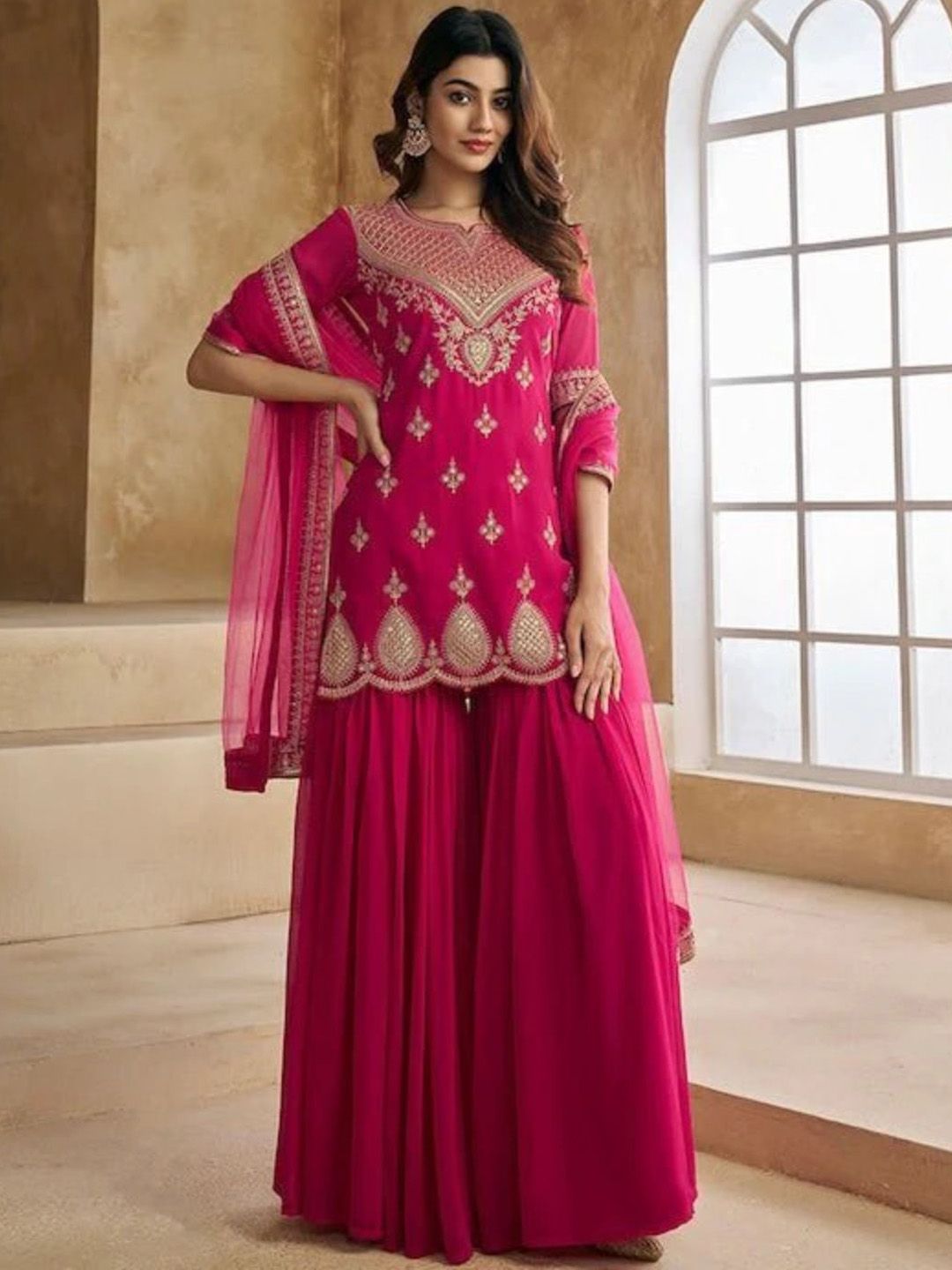 KALINI Floral Embroidered Notch Neck Sequinned Georgette Kurta With Sharara & Dupatta