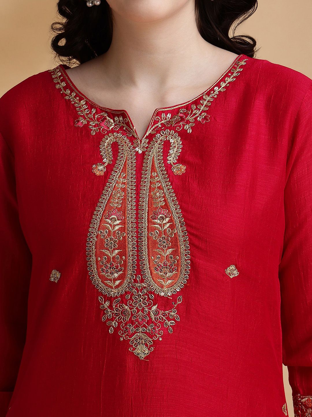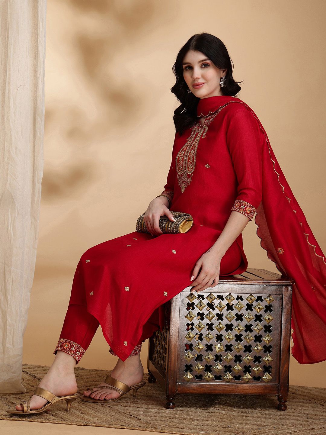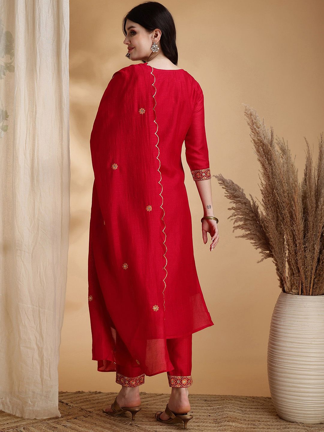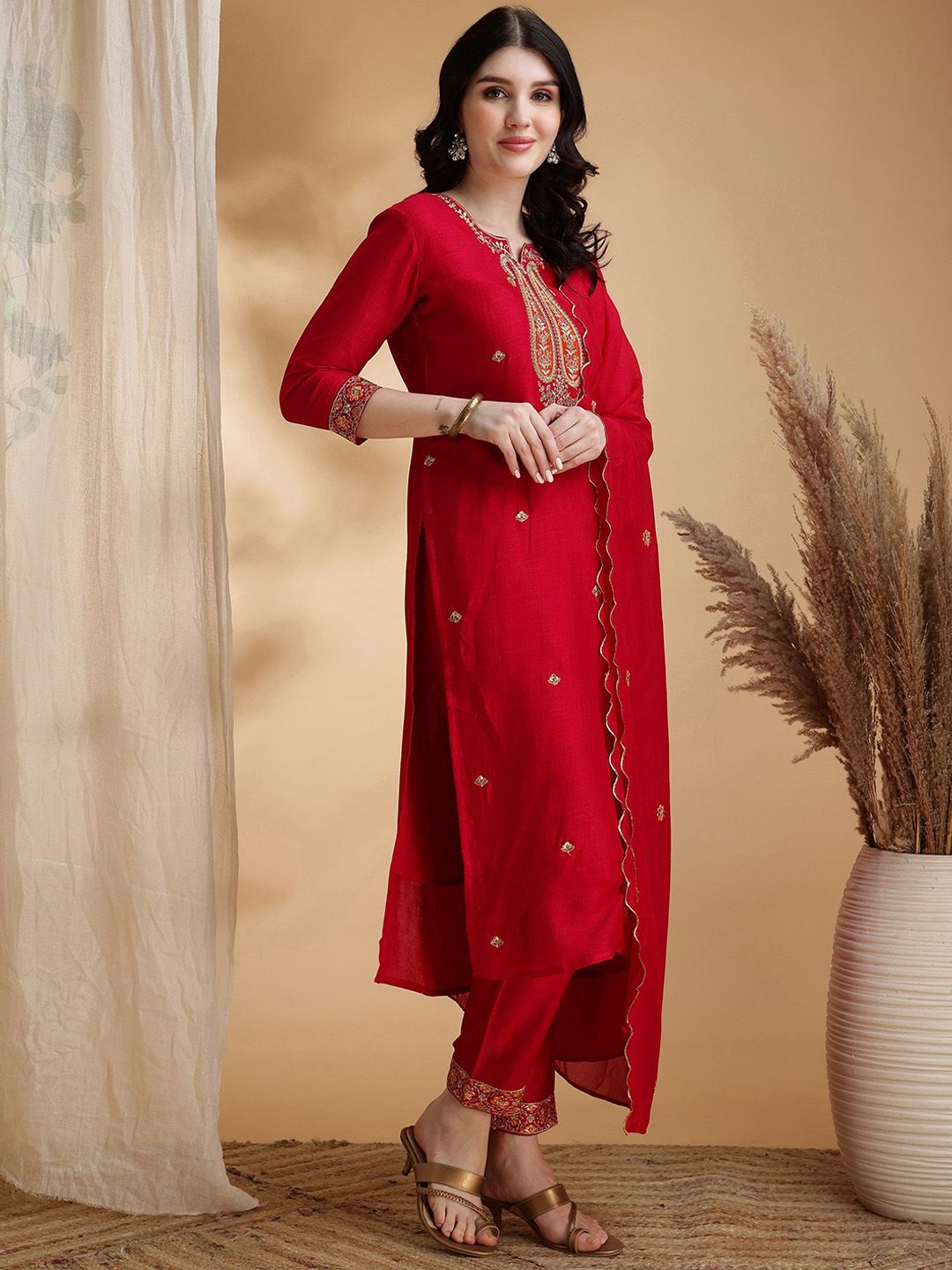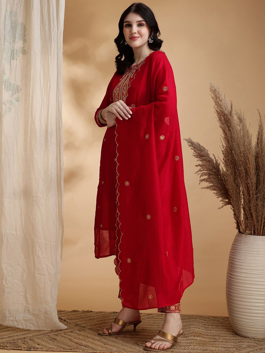KALINI Floral Embroidered Notch Neck Straight Kurta With Trouser & Dupatta