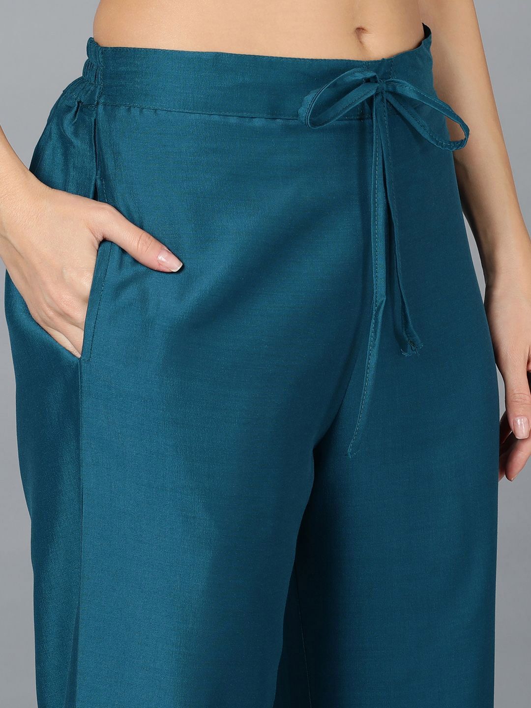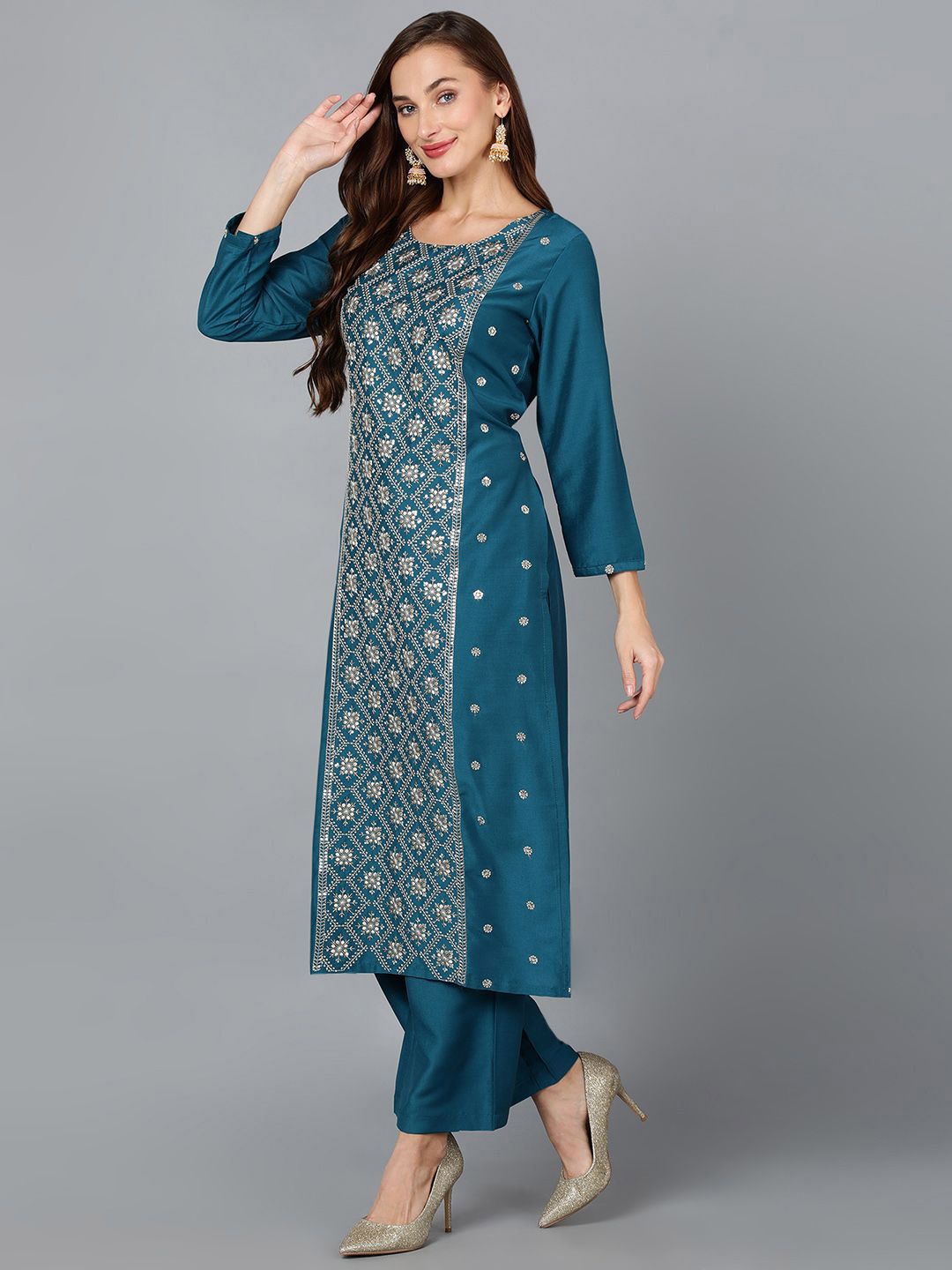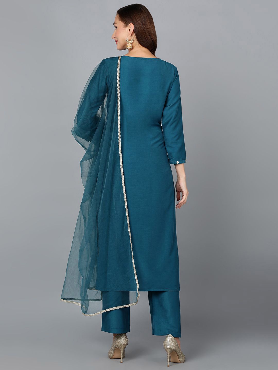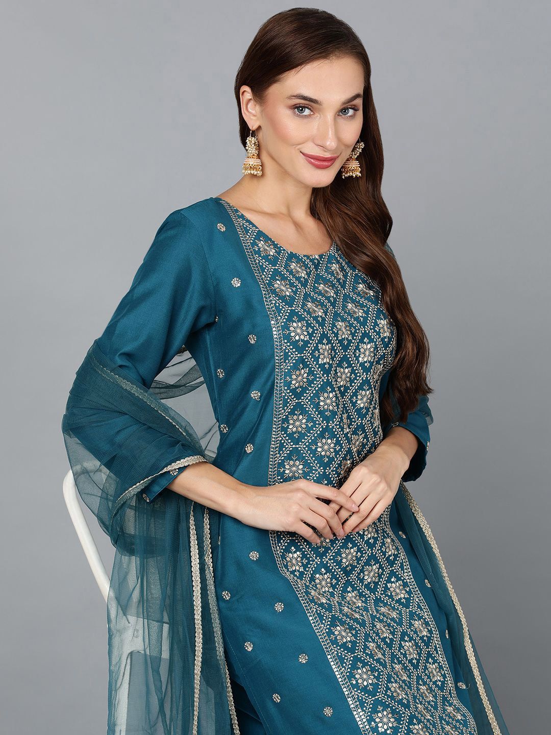 KALINI Floral Embroidered Round Neck Zari Straight Kurta & Trousers With Dupatta