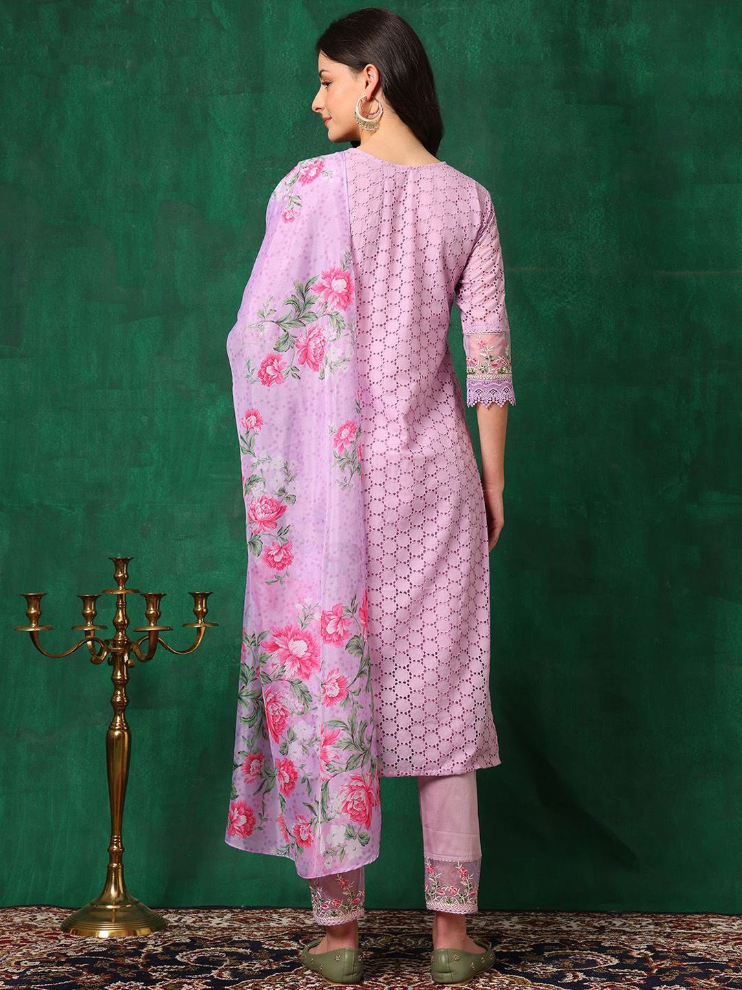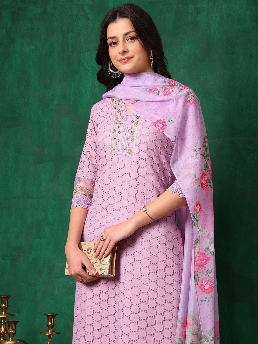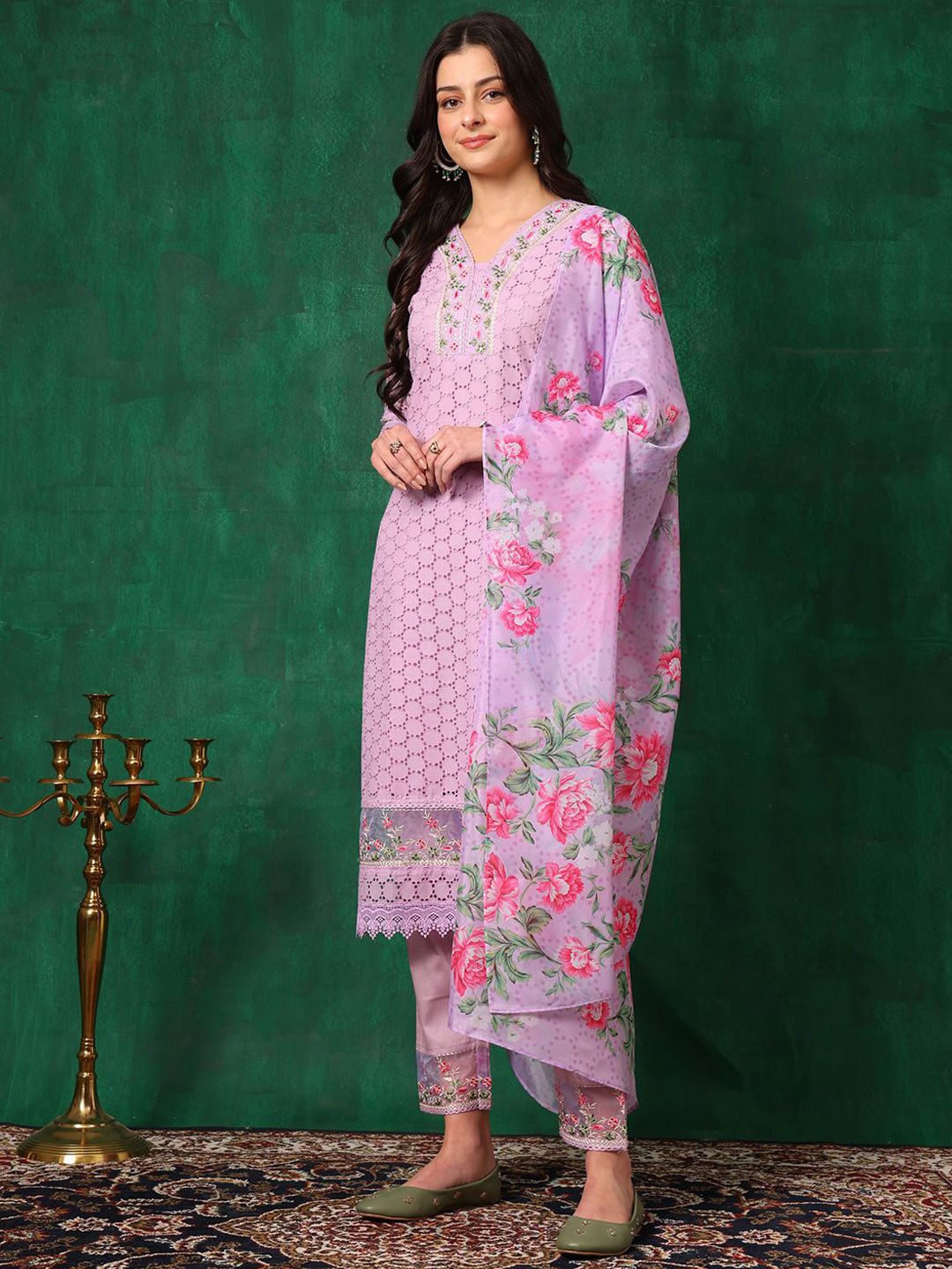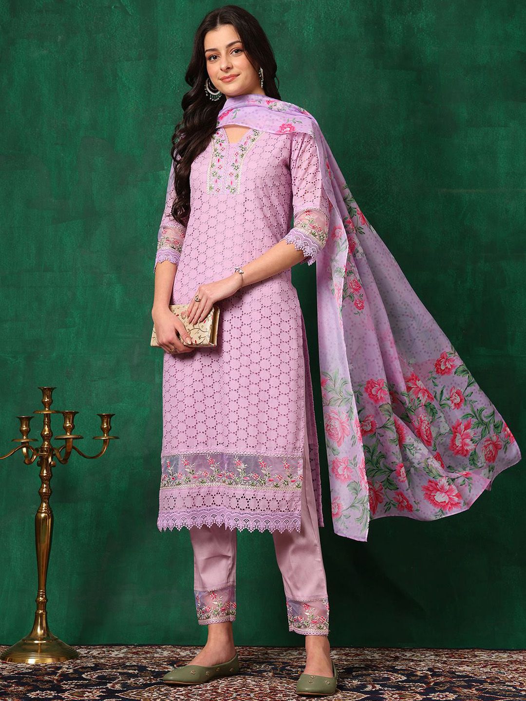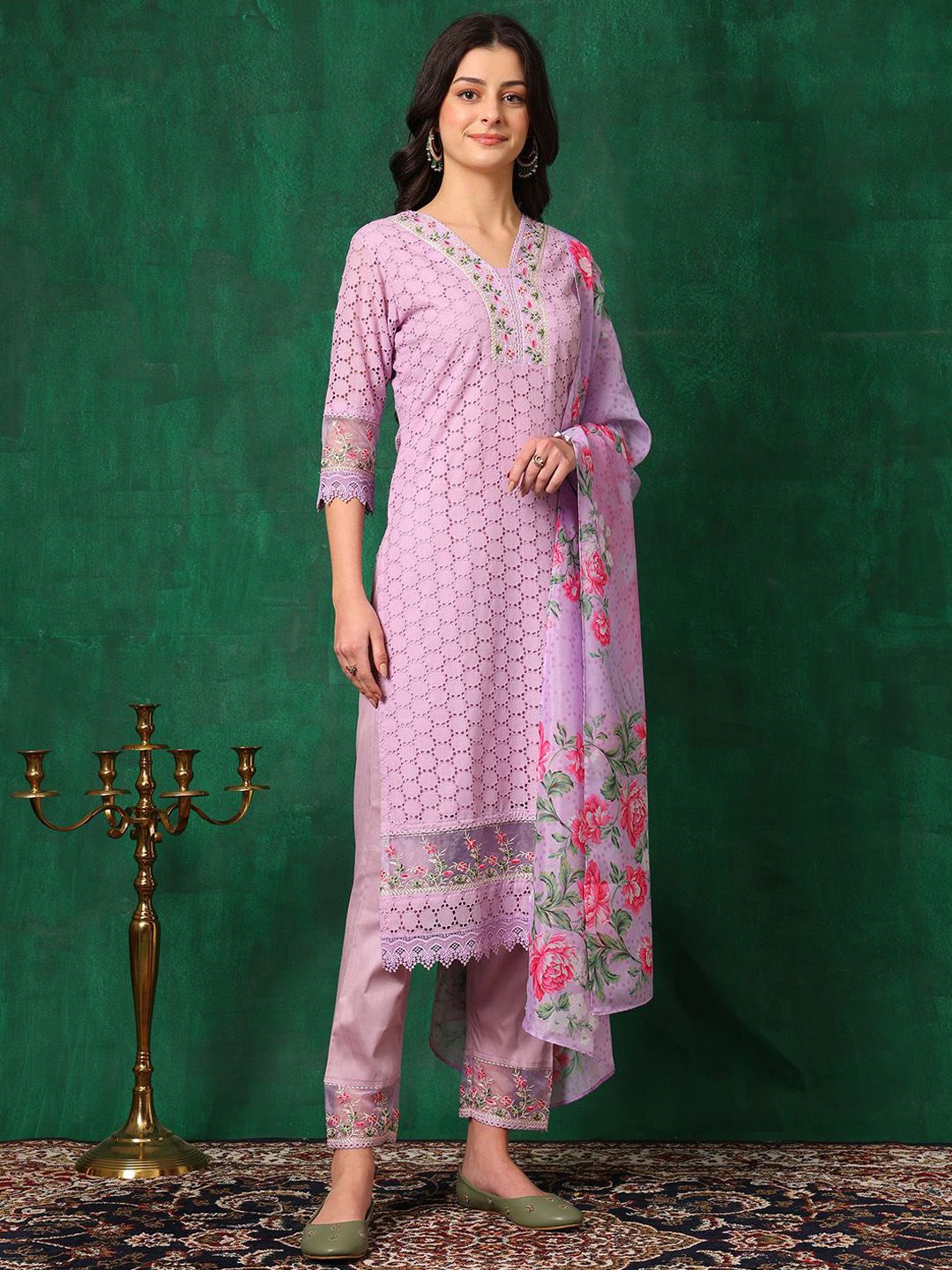 KALINI Floral Embroidered Straight Chikankari Pure Cotton Kurta With Trousers & Dupatta