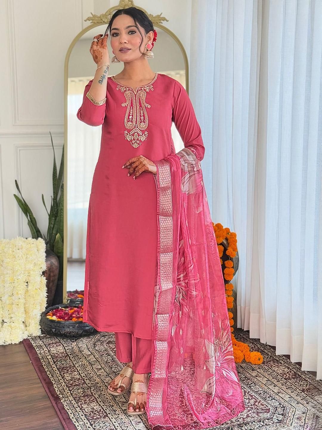 KALINI Floral Embroidered Straight Sequinned Chanderi Silk Kurta With Trousers & Dupatta