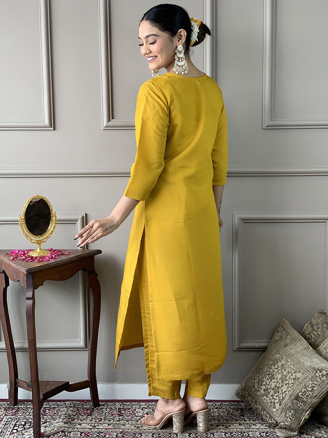 KALINI Floral Embroidered Straight Thread Work Chanderi Silk Kurta With Trousers & Dupatta