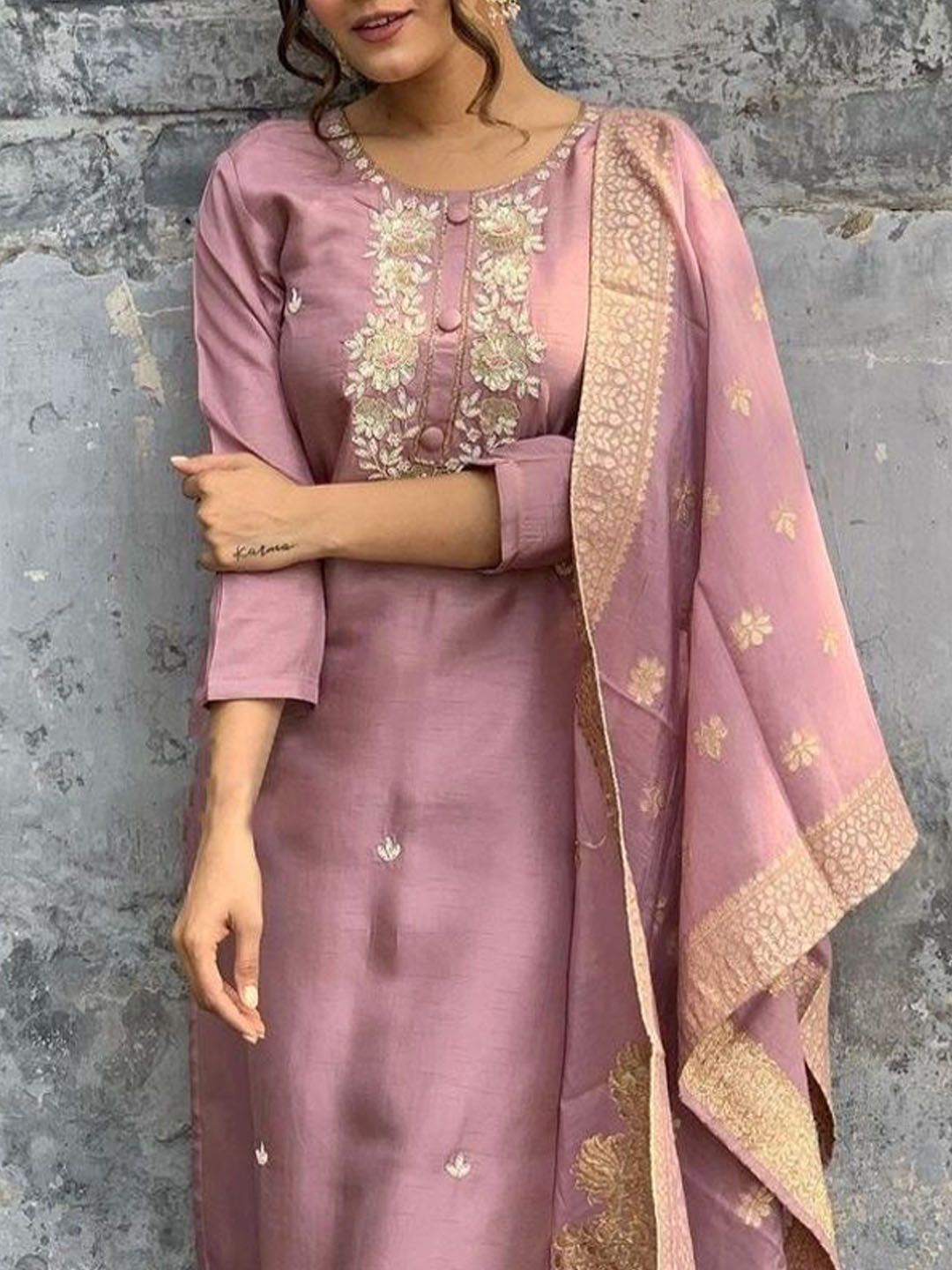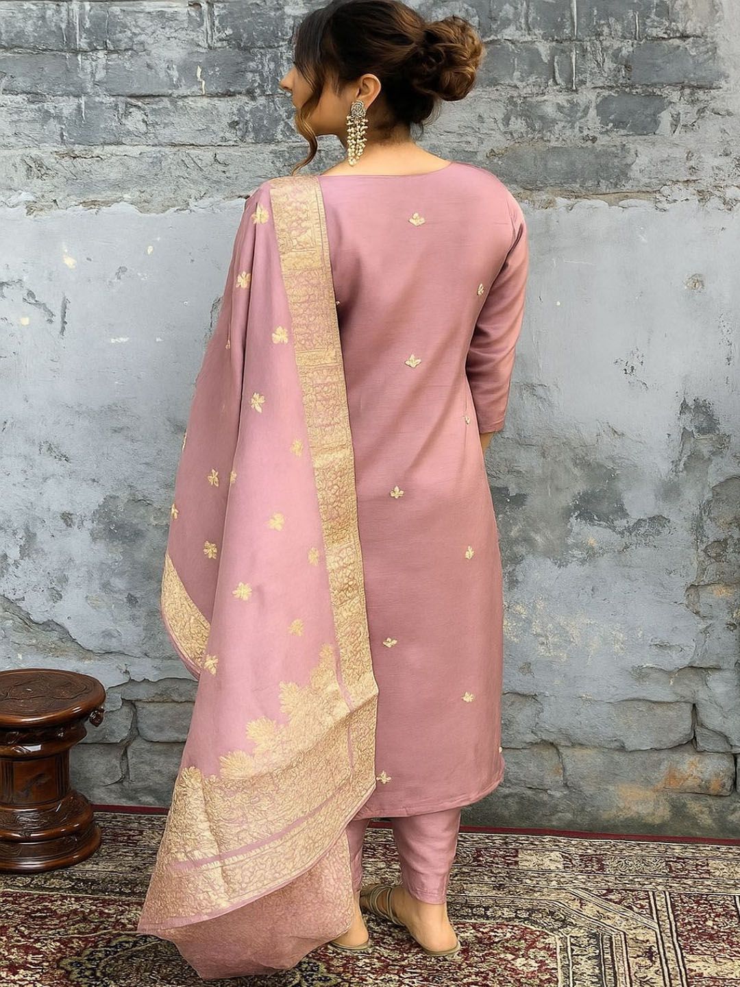 KALINI Floral Embroidered Thread Work Chanderi Silk Kurta With Trousers & Dupatta