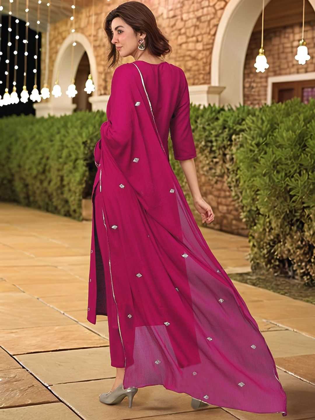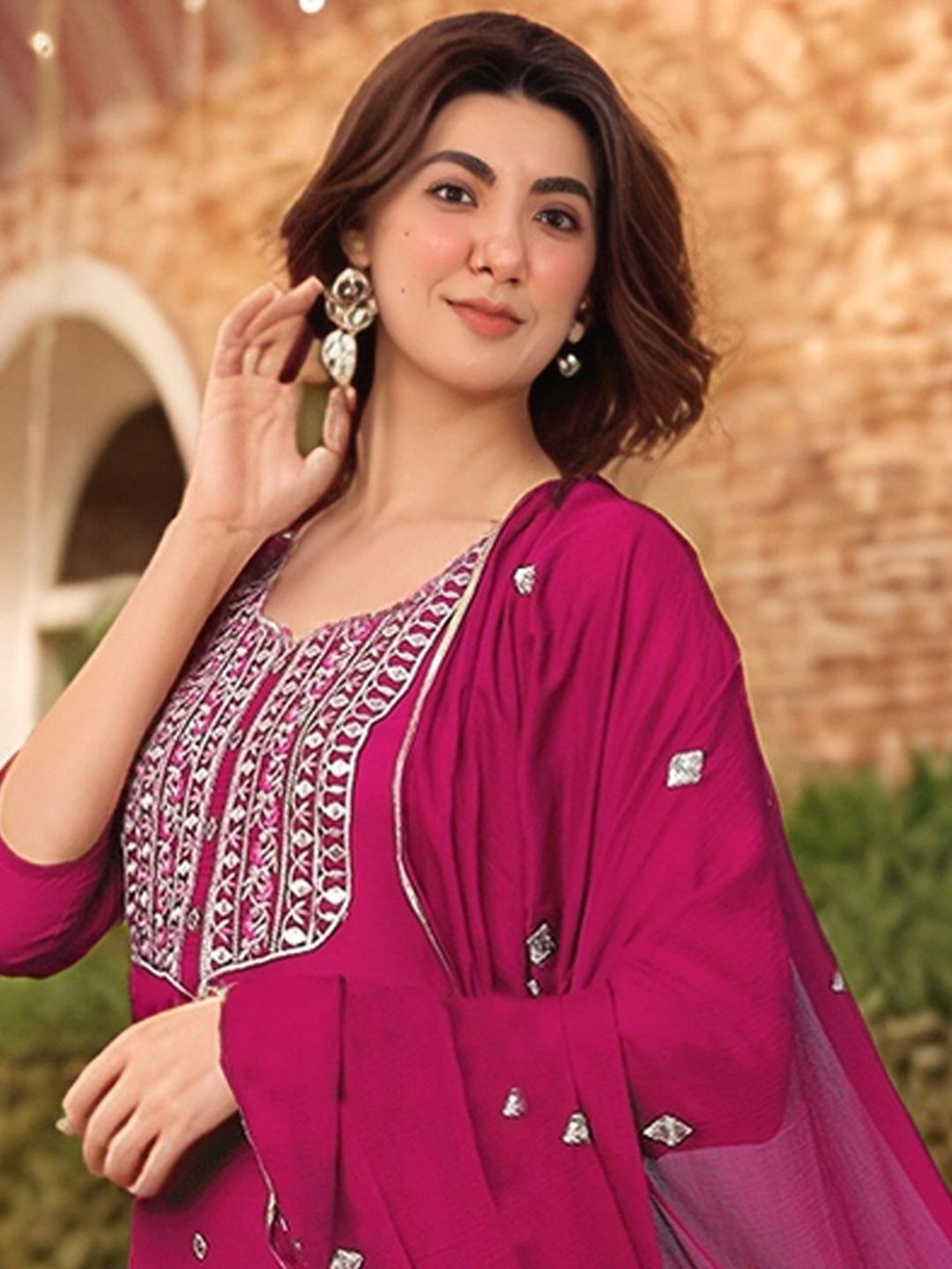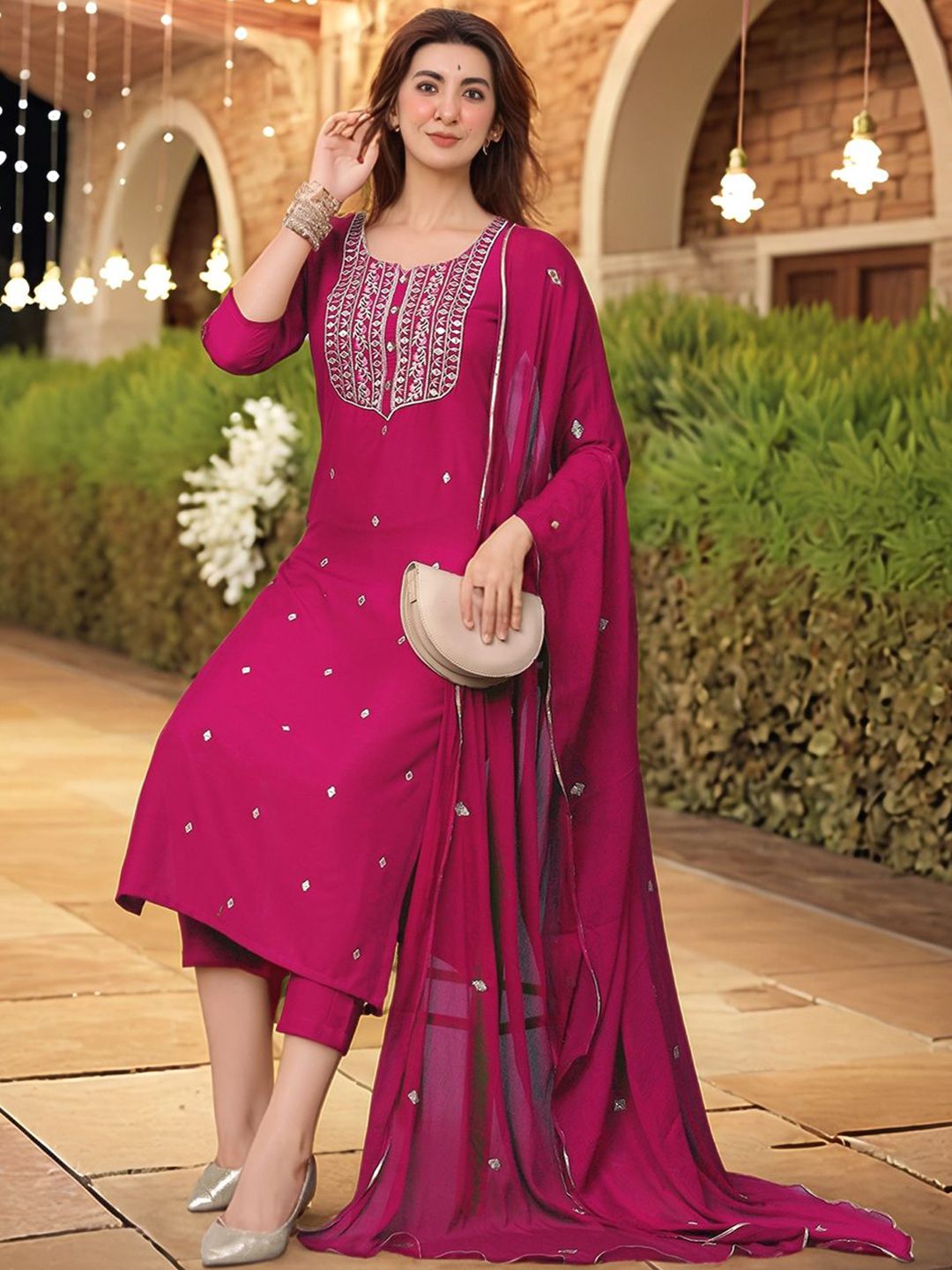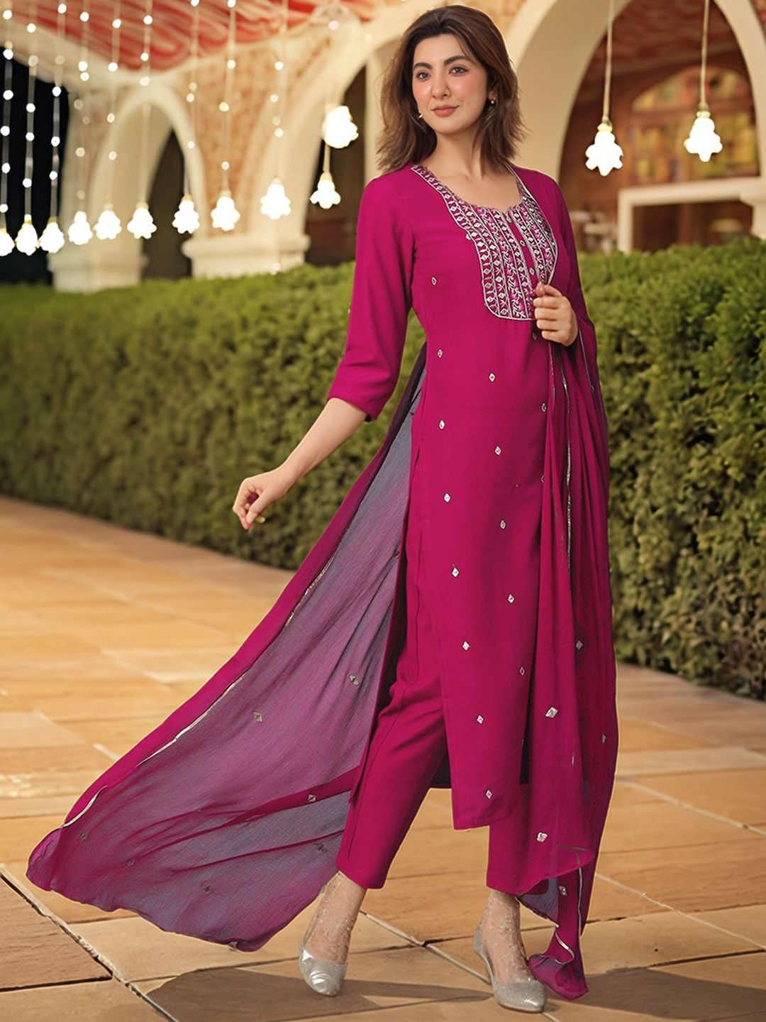 KALINI Floral Embroidered Thread Work Round Neck Straight Kurta With Trousers & Dupatta