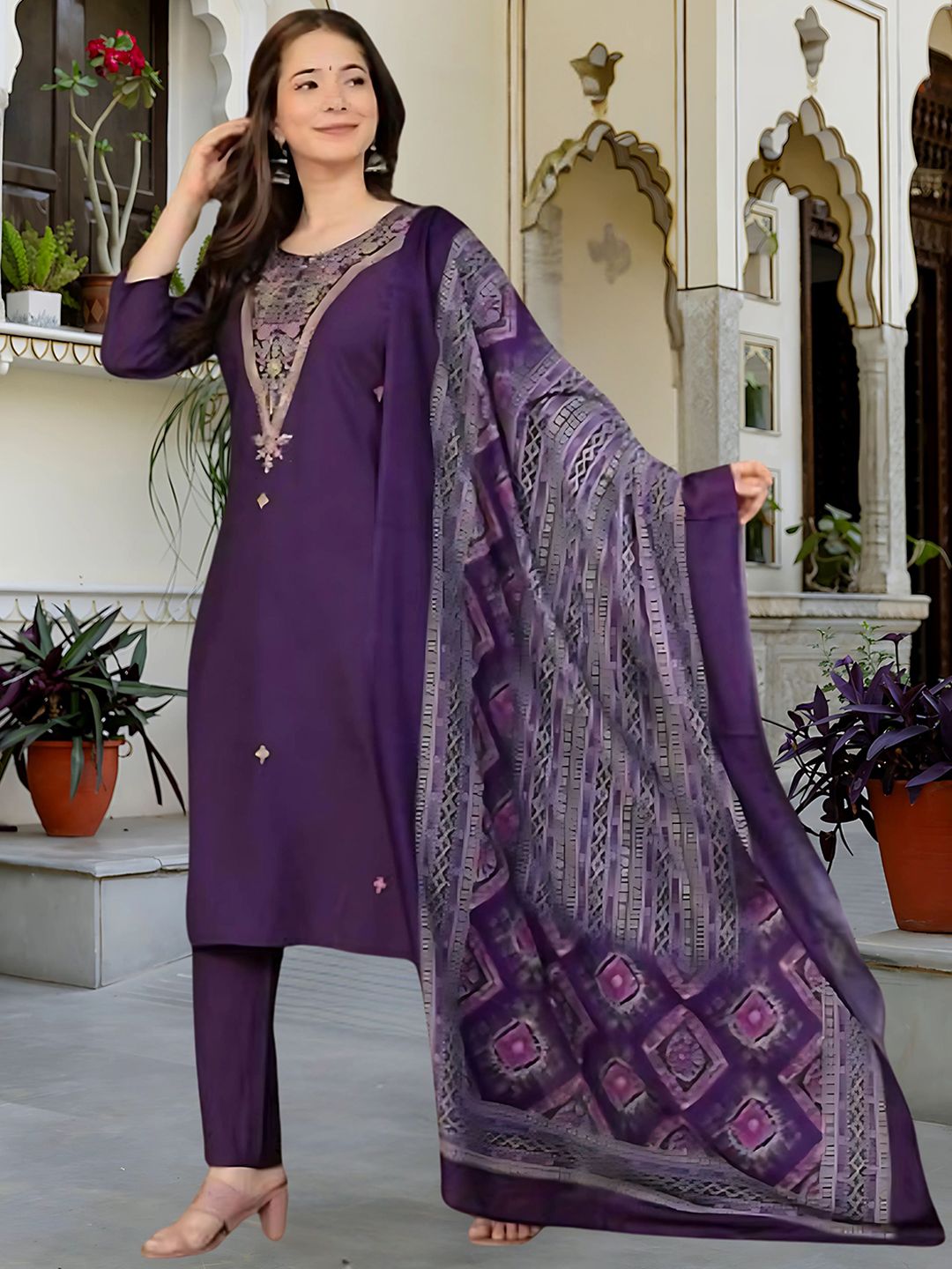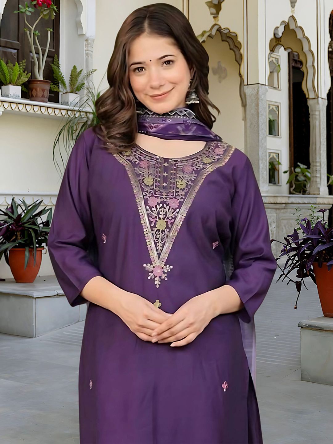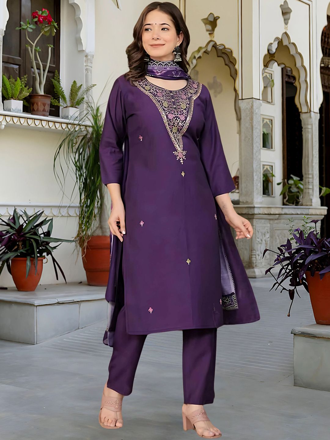 KALINI Floral Embroidered Thread Work Round Neck Straight Kurta With Trousers & Dupatta