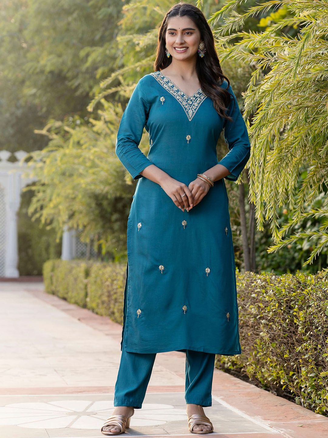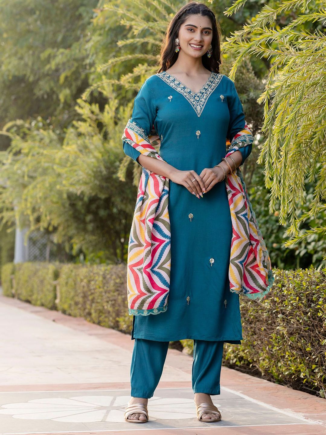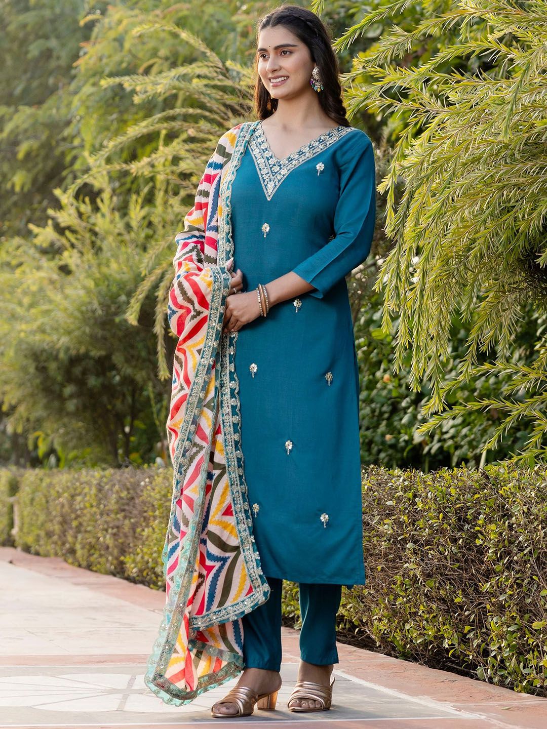 KALINI Floral Embroidered Thread Work V-Neck Straight Kurta With Trousers & Dupatta
