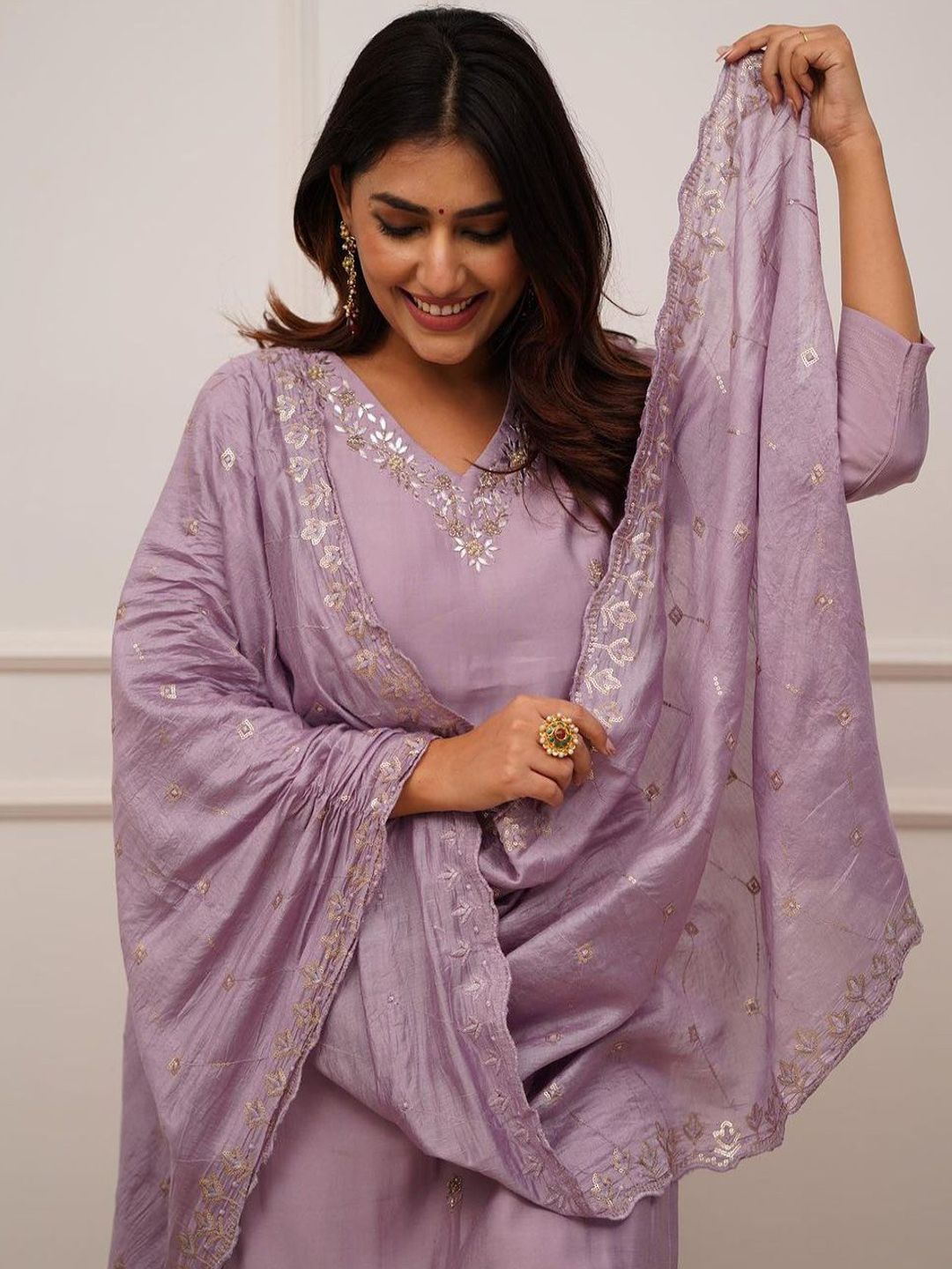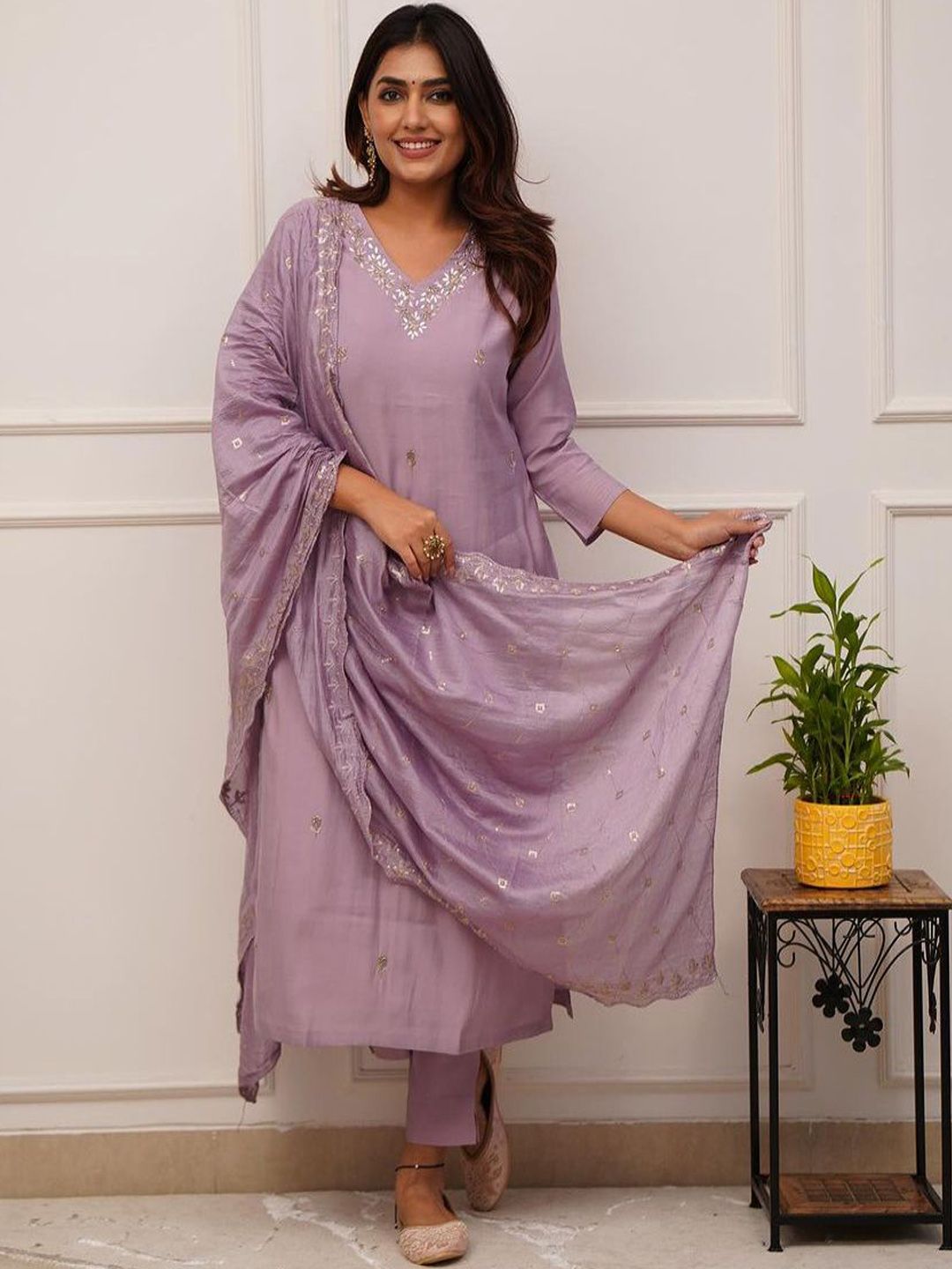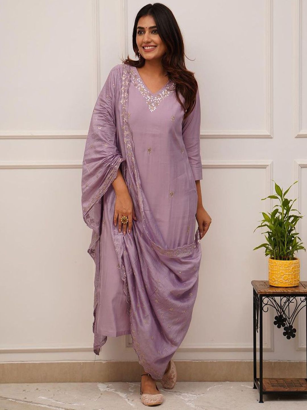 KALINI Floral Embroidered V-Neck Thread Work Chanderi Silk Kurta With Trousers & Dupatta
