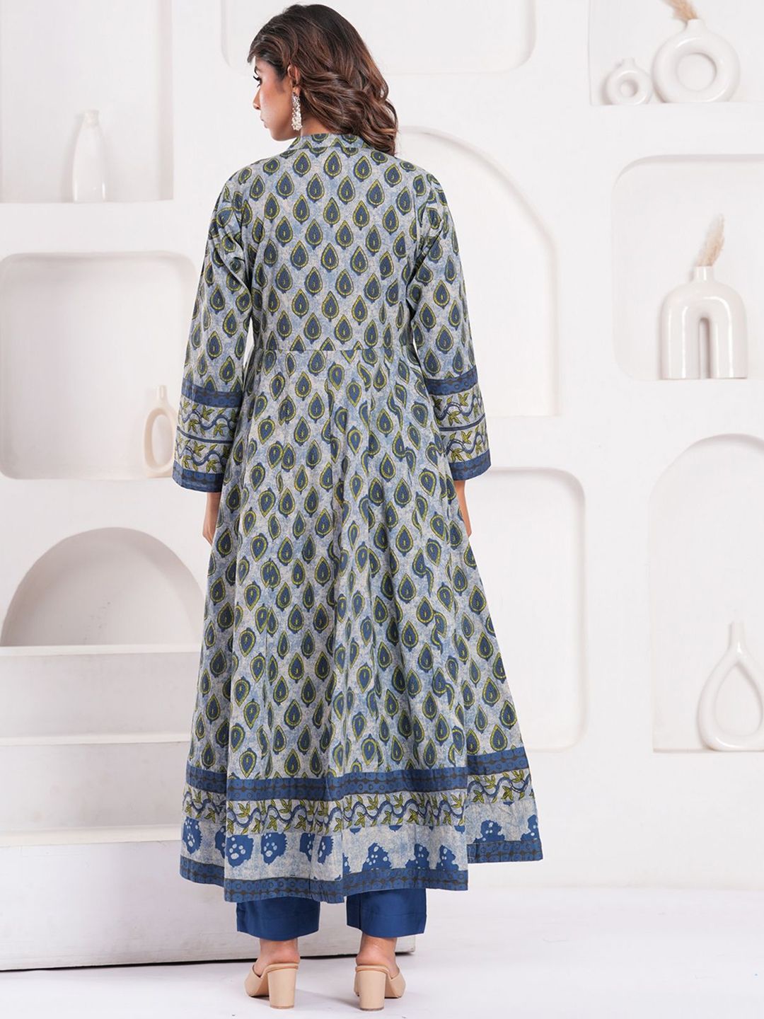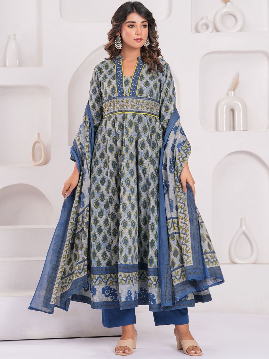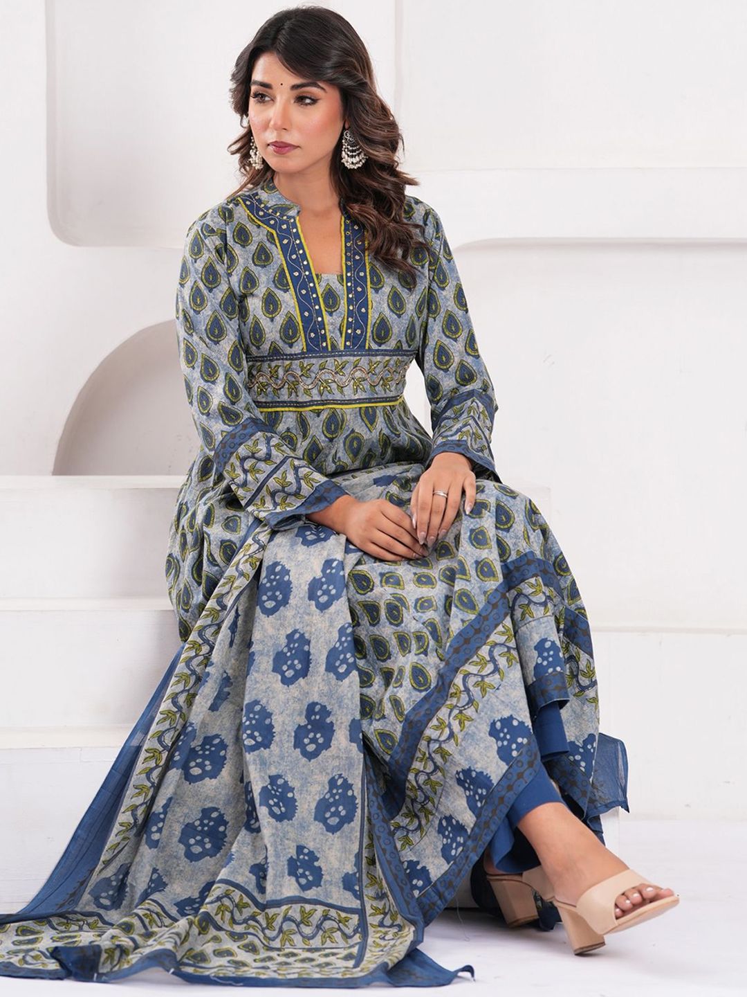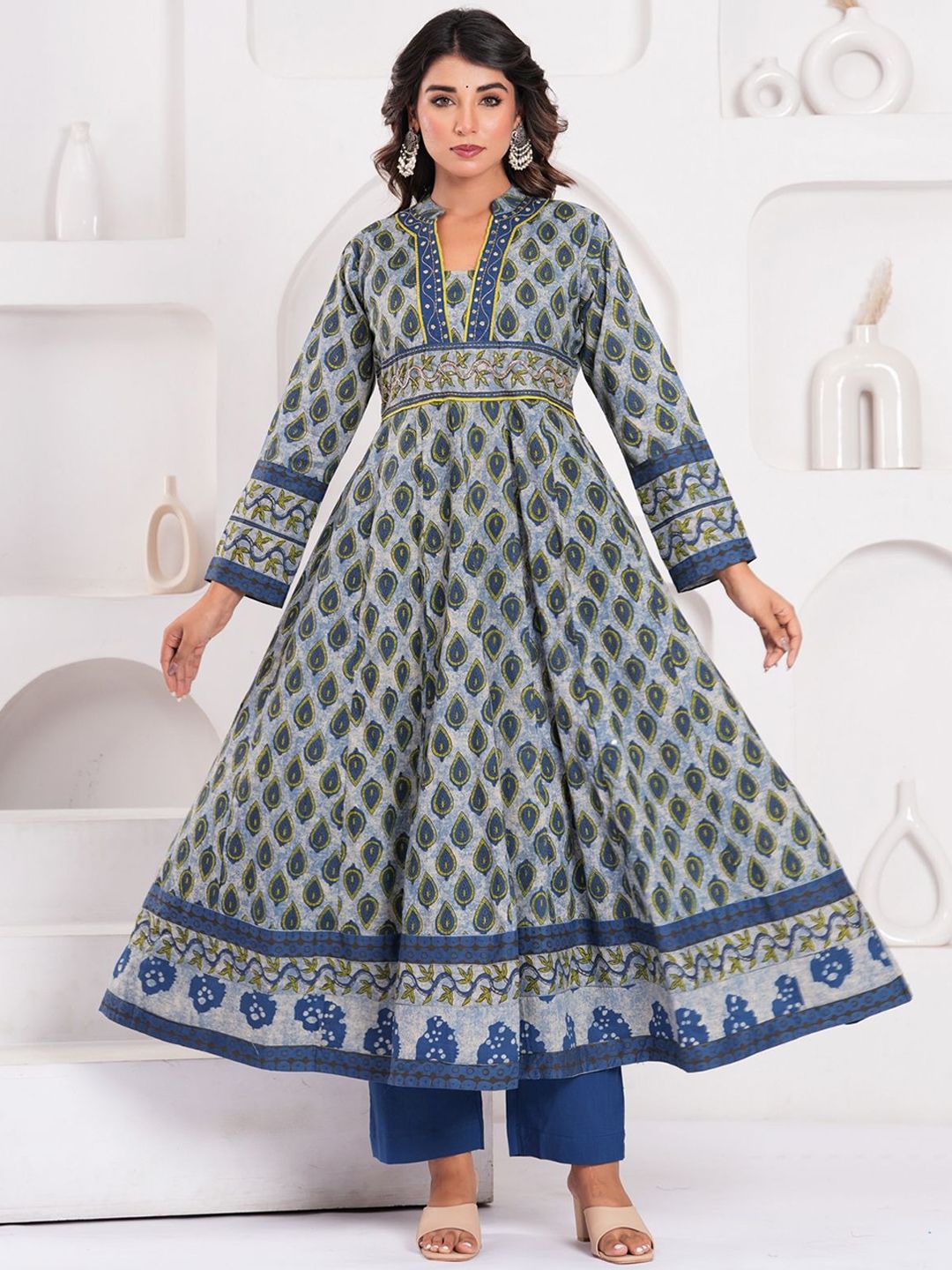 KALINI Floral Printed Anarkali Beads and Stones Pure Cotton Kurta With Trouser & Dupatta