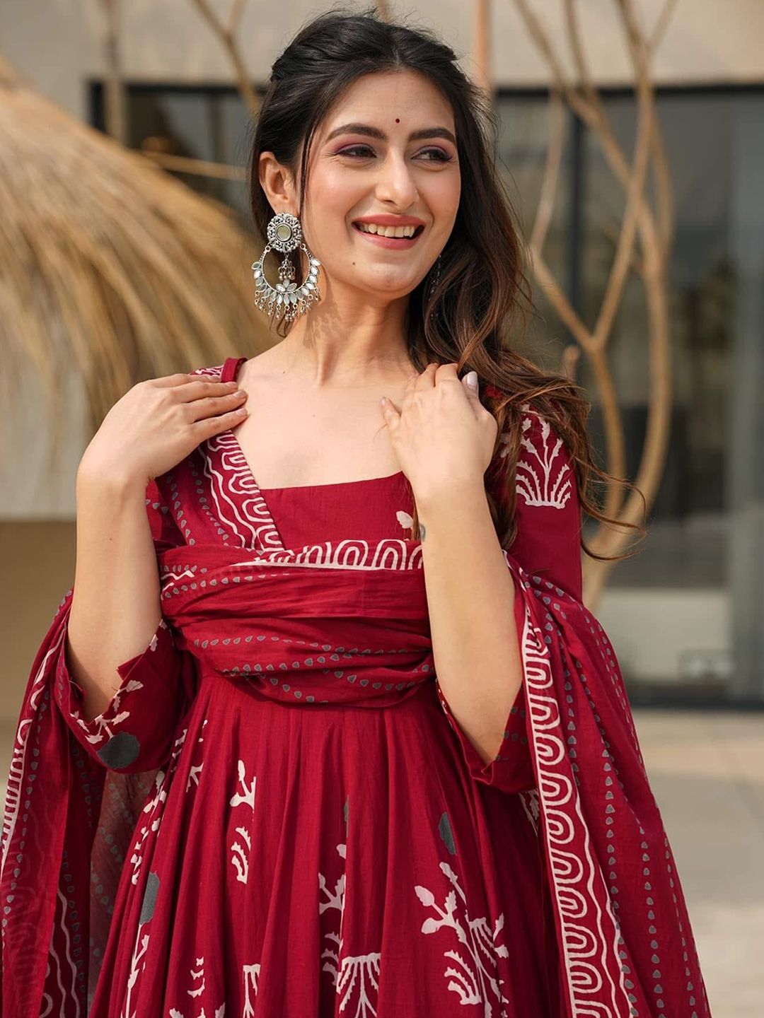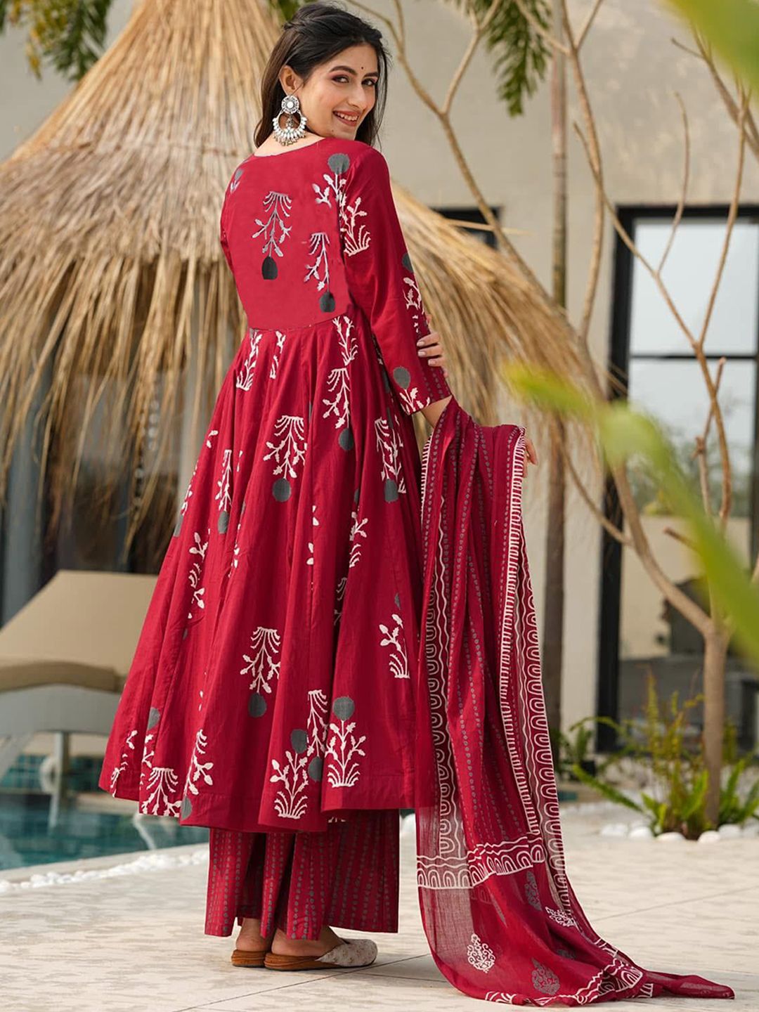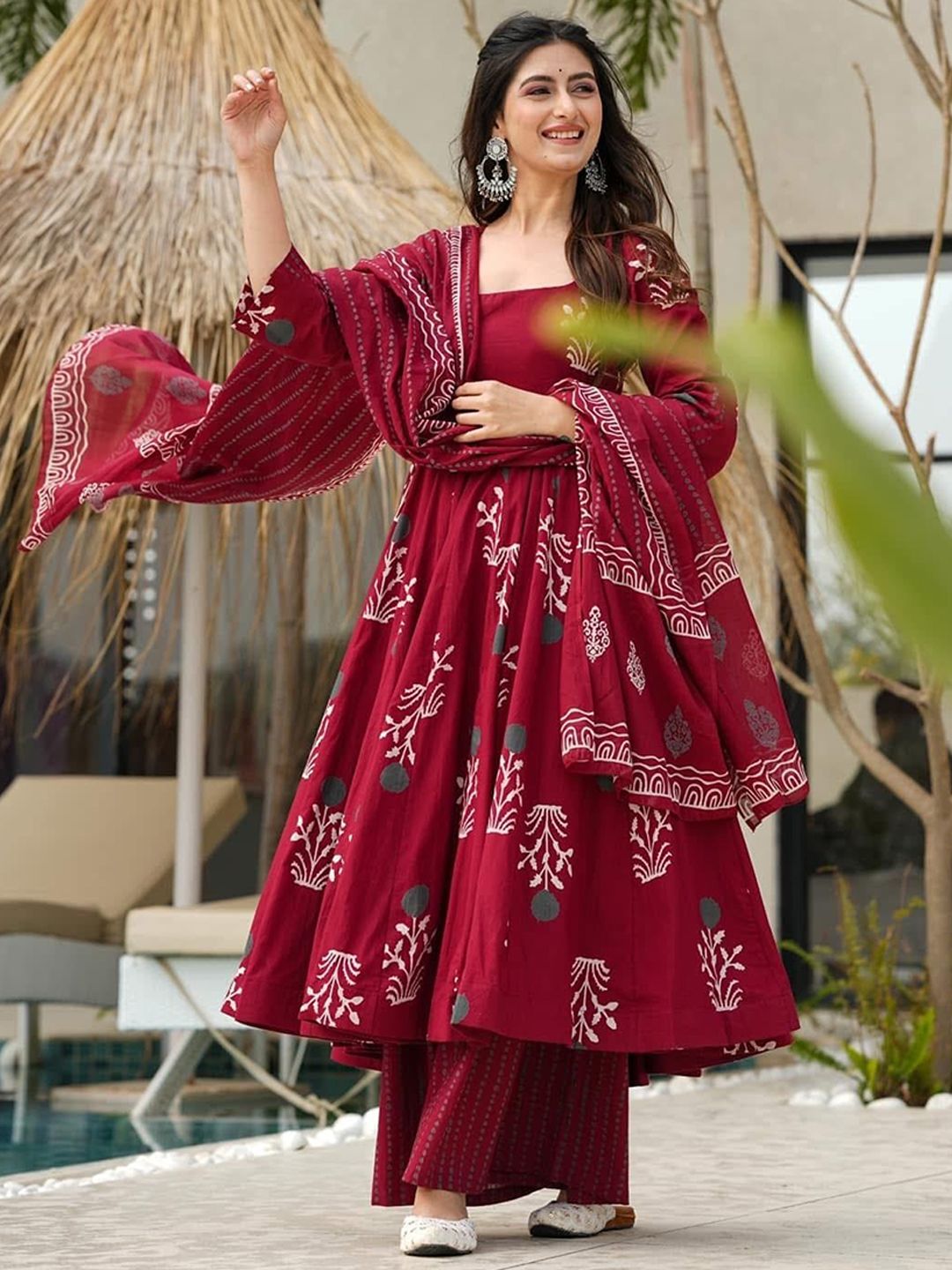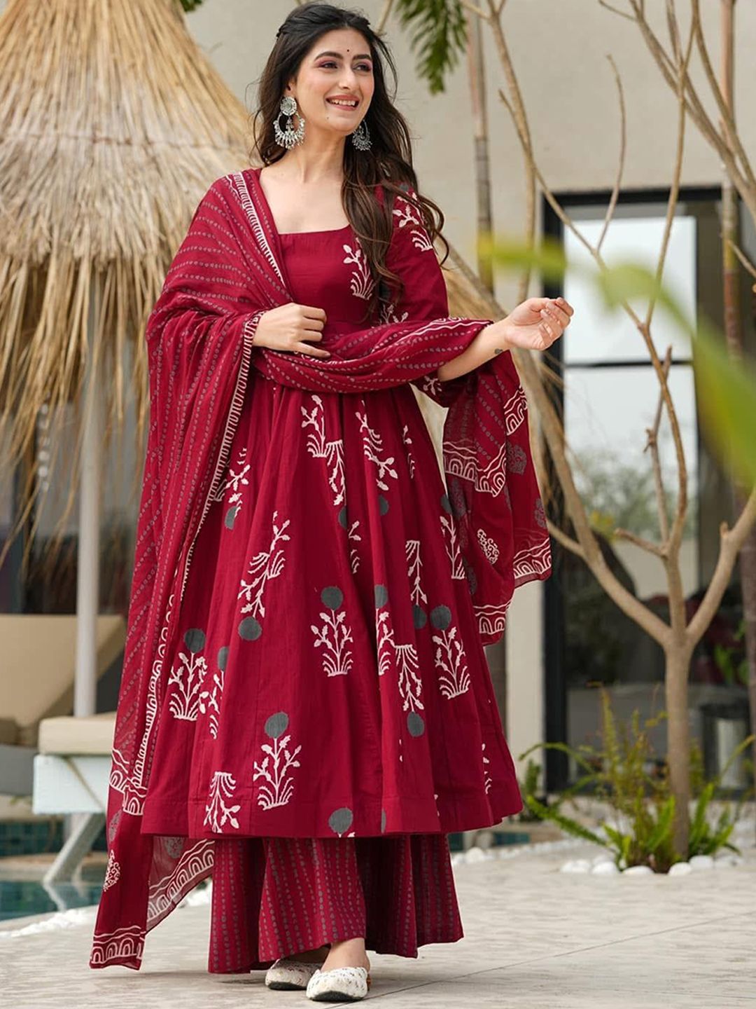 KALINI Floral Printed Empire Square Neck Anarkali Kurta With Palazzos & Dupatta