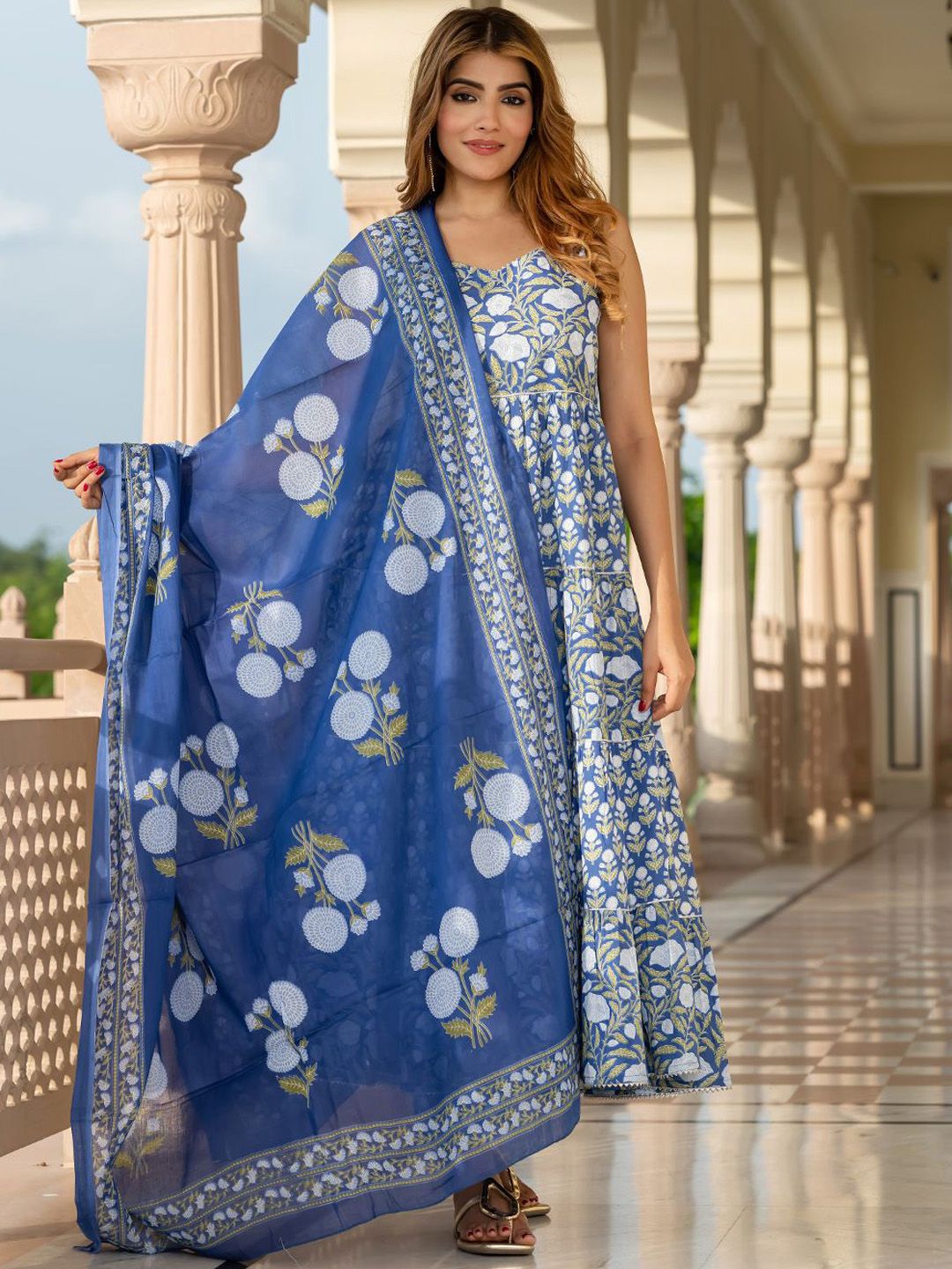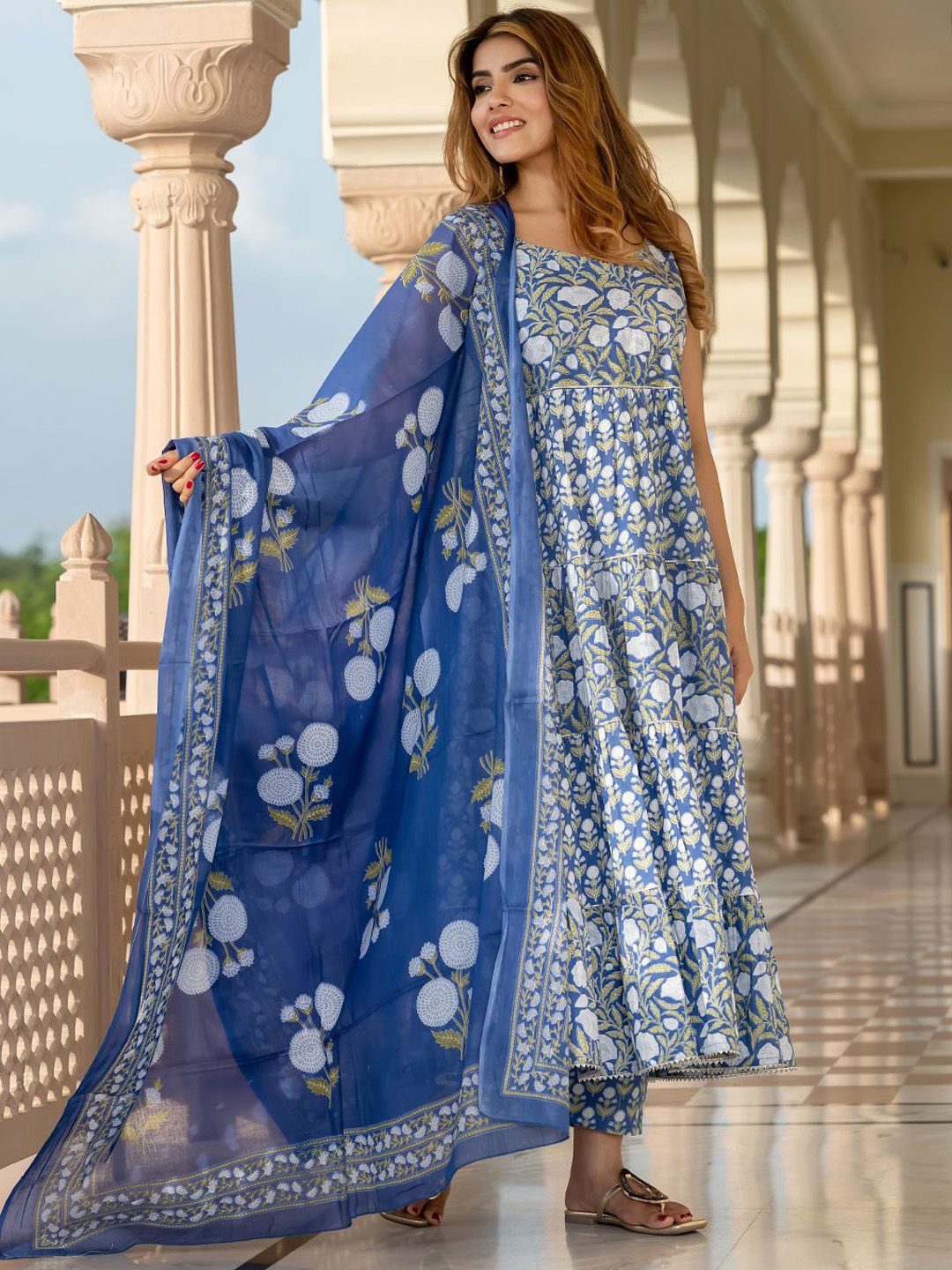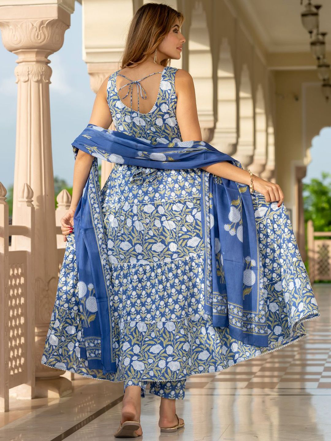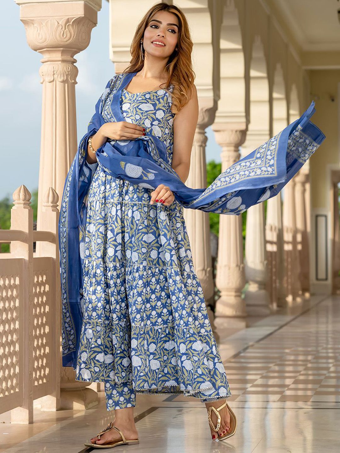 KALINI Floral Printed Gotta Patti Pure Cotton Anarkali Kurta With Trousers & Dupatta
