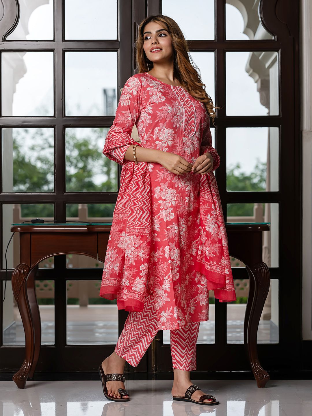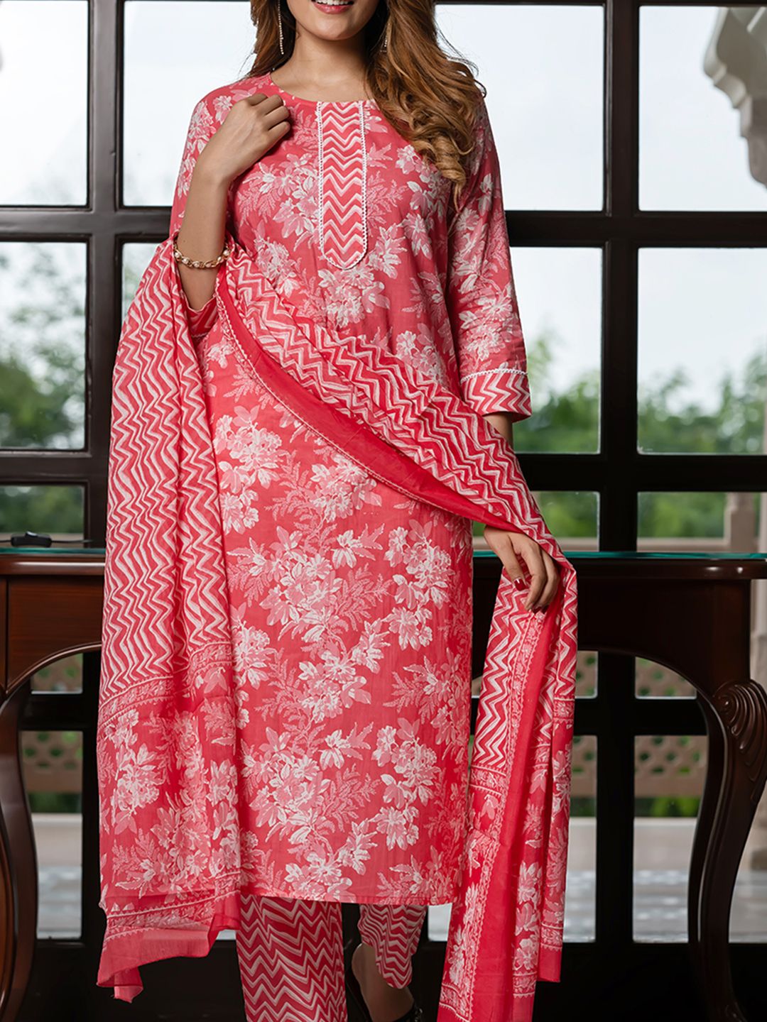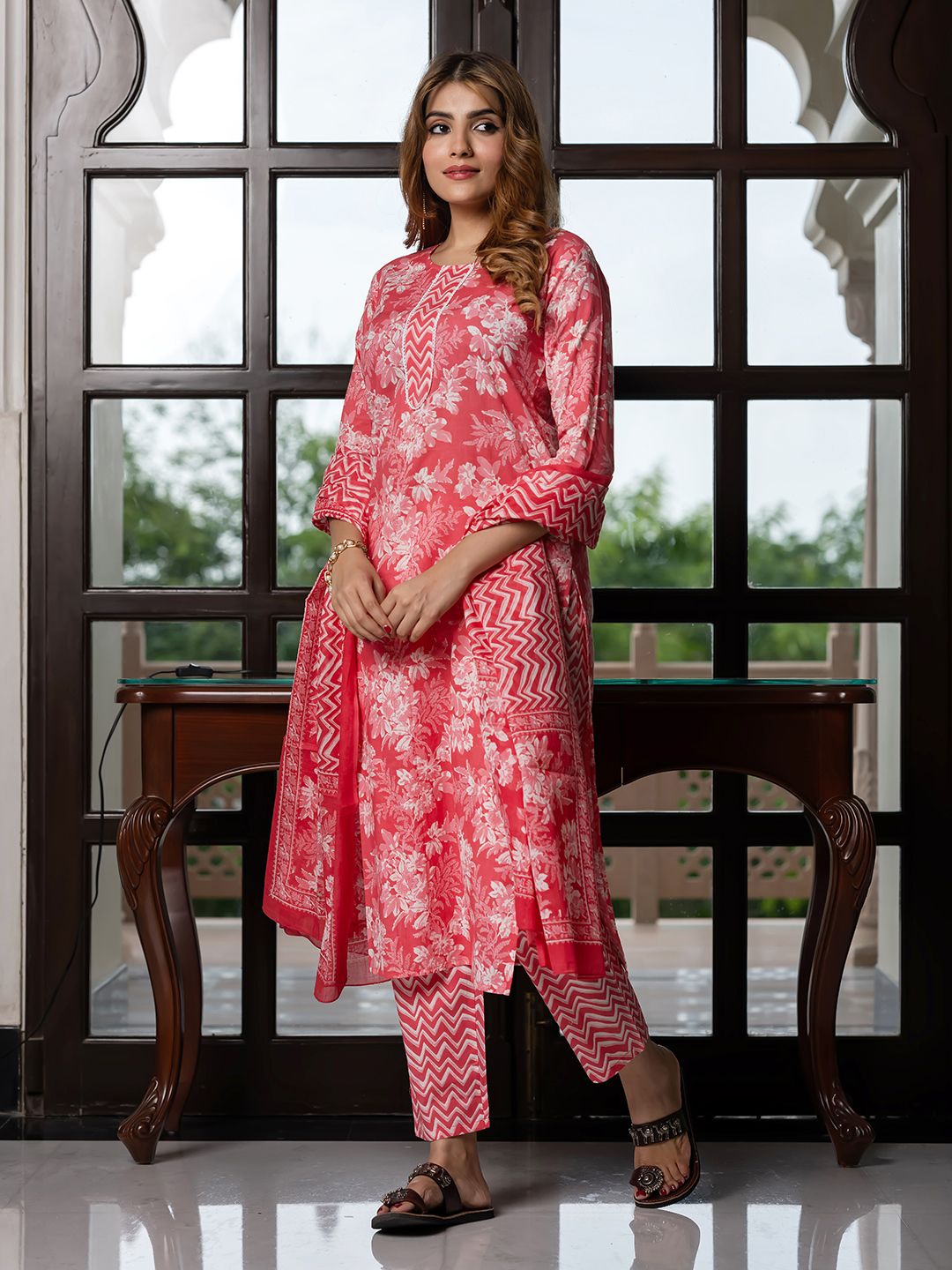 KALINI Floral Printed Notch Neck Pure Cotton Straight Kurta With Trousers & Dupatta