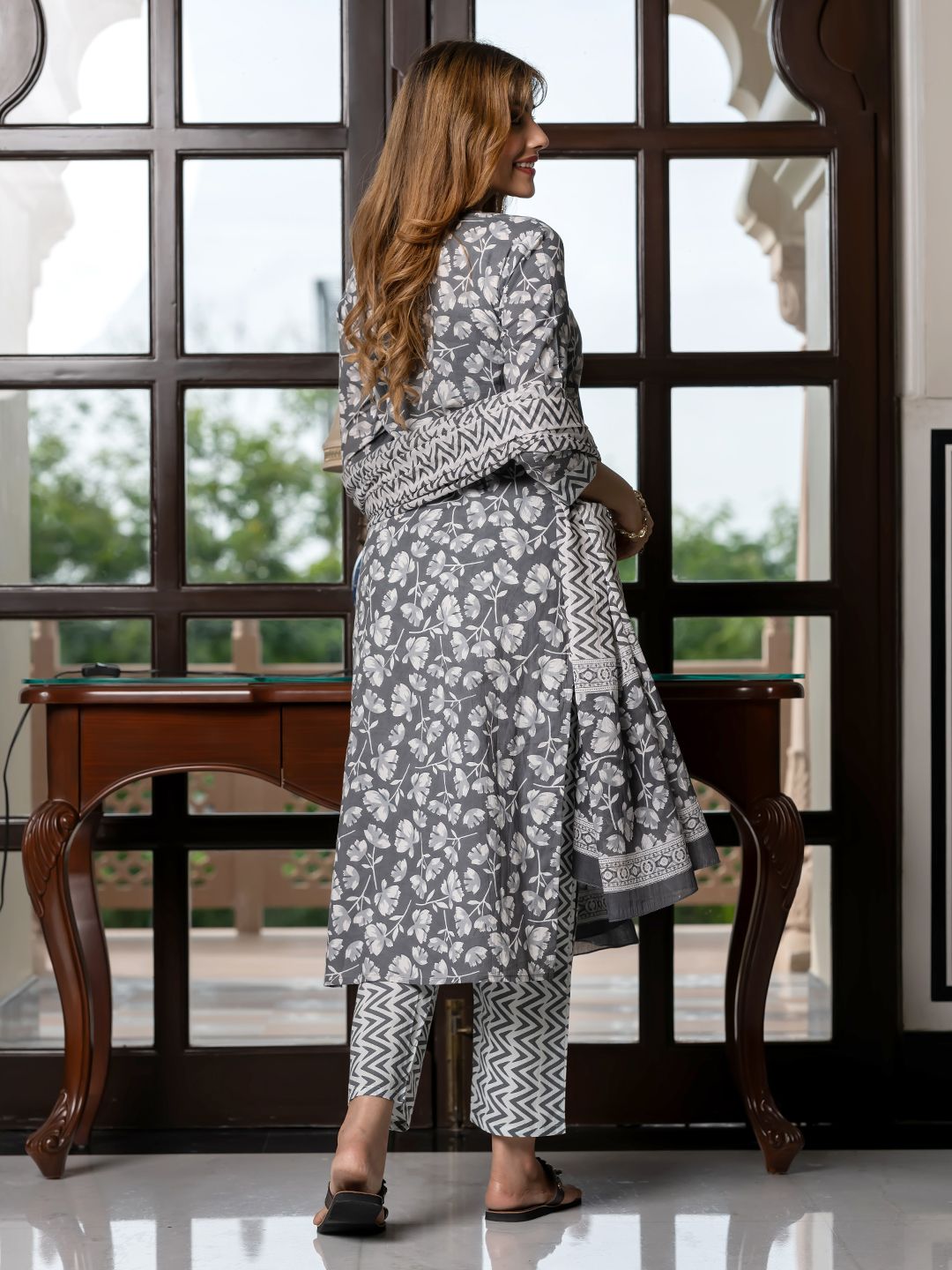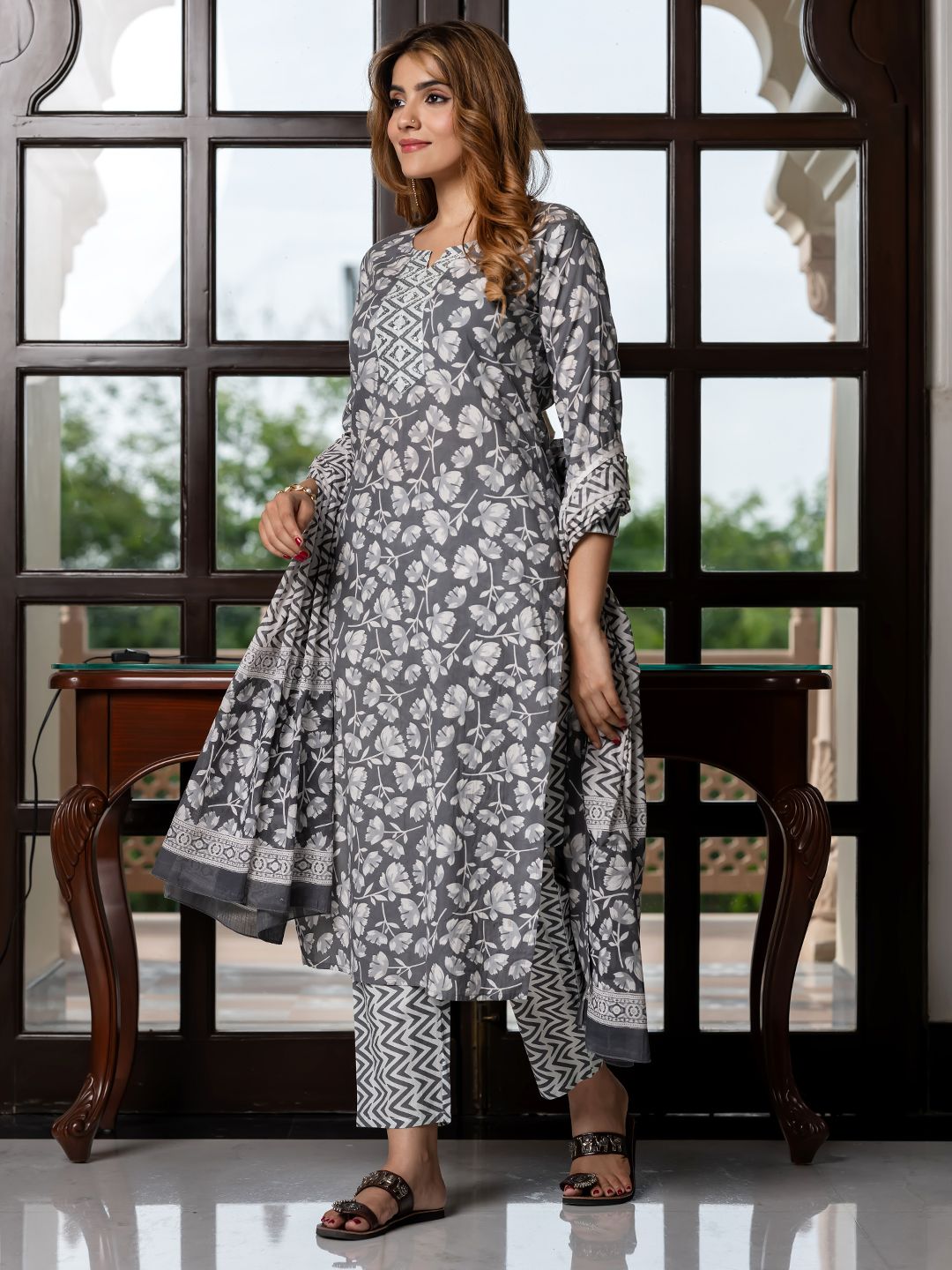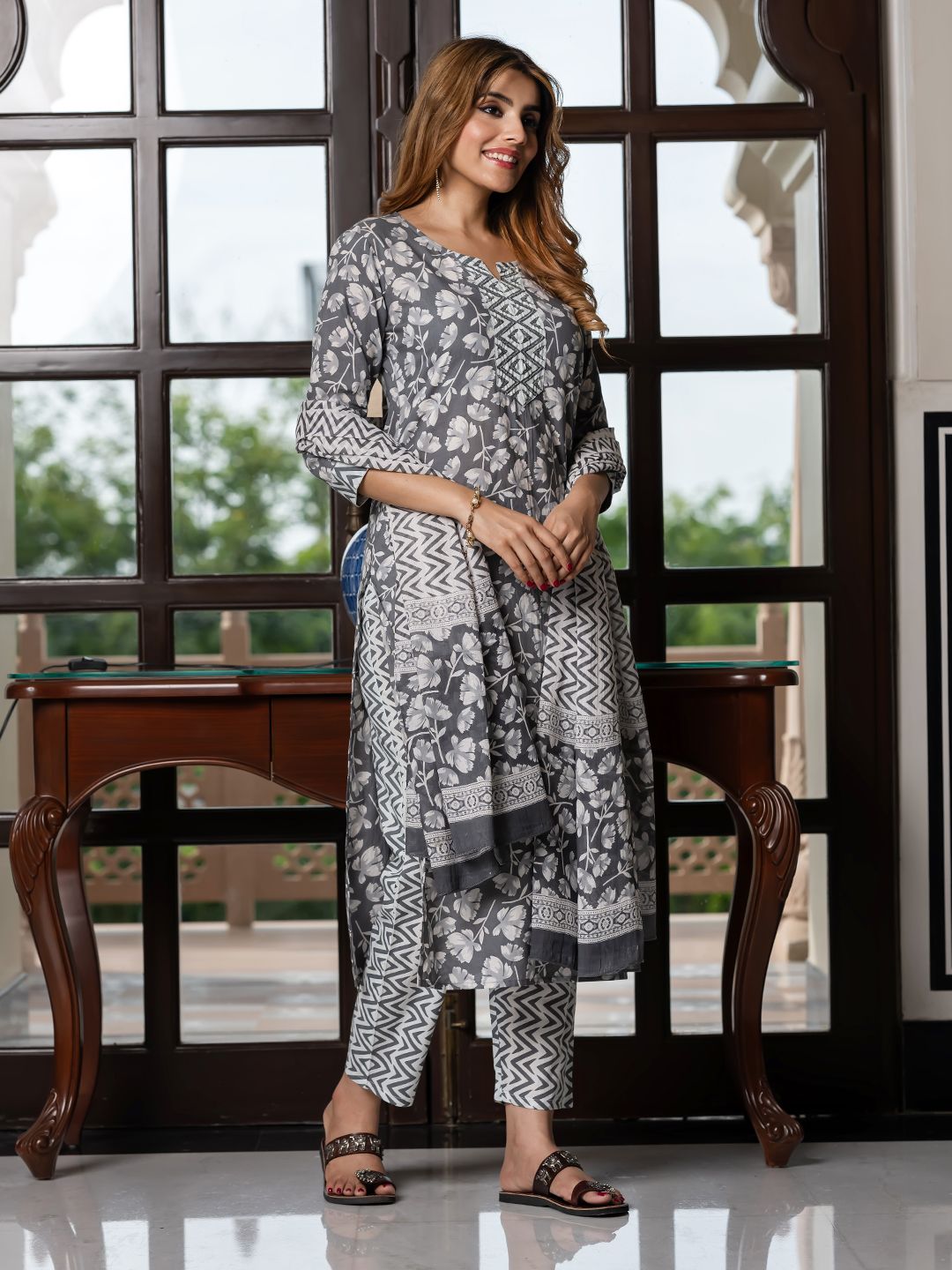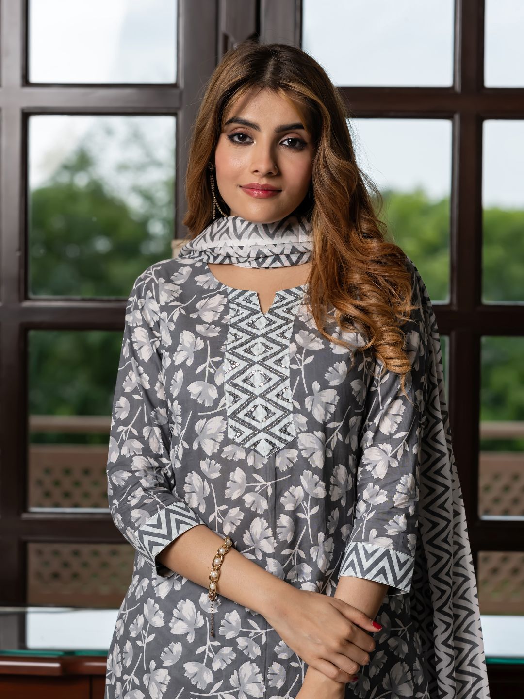 KALINI Floral Printed Notch Neck Sequinned Pure Cotton Kurta With Trousers & Dupatta
