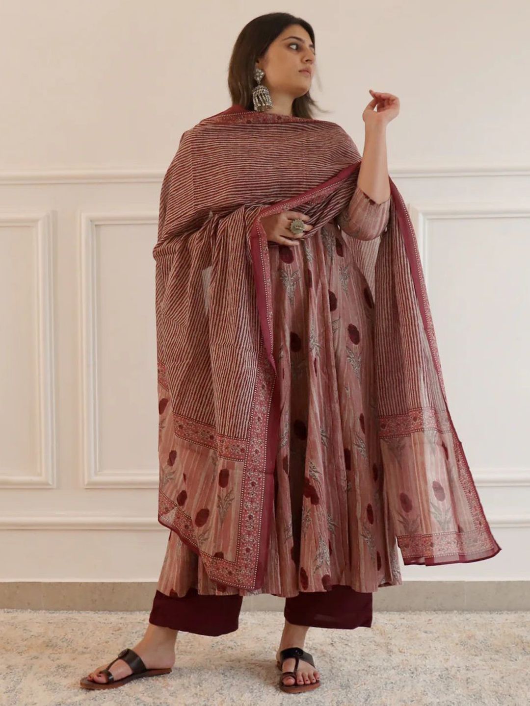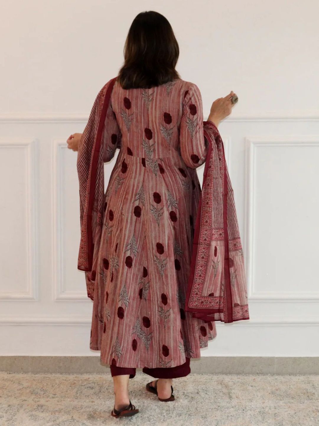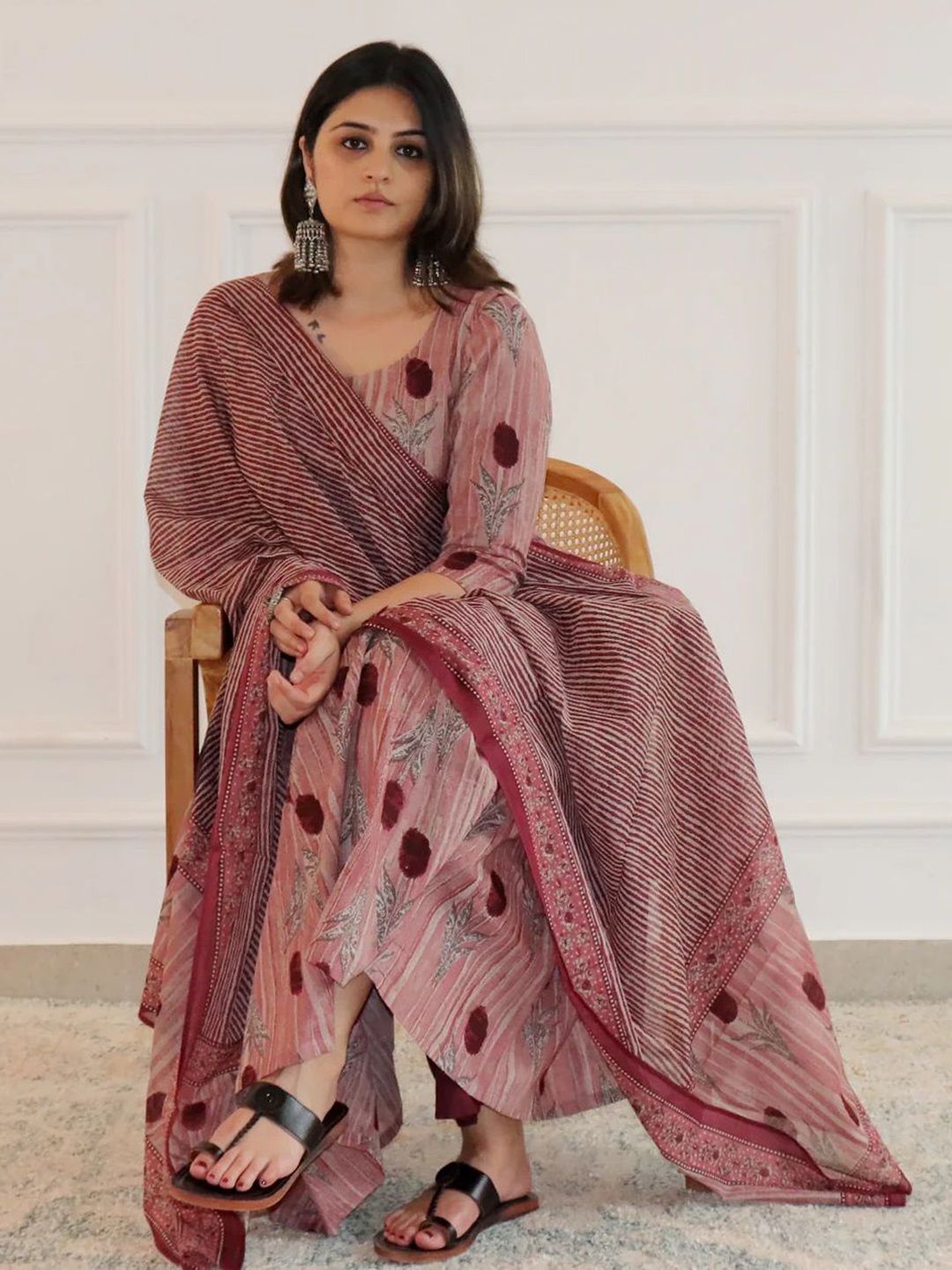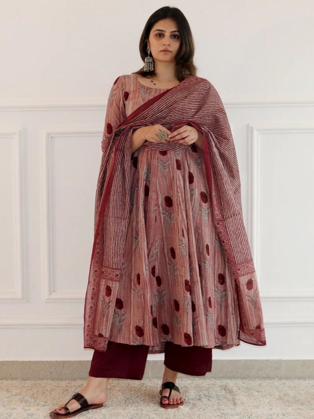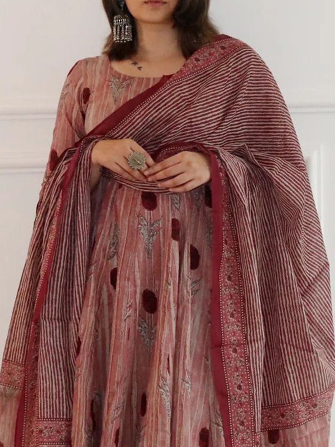 KALINI Floral Printed Round Neck Anarkali Kurta With Trousers & Dupatta