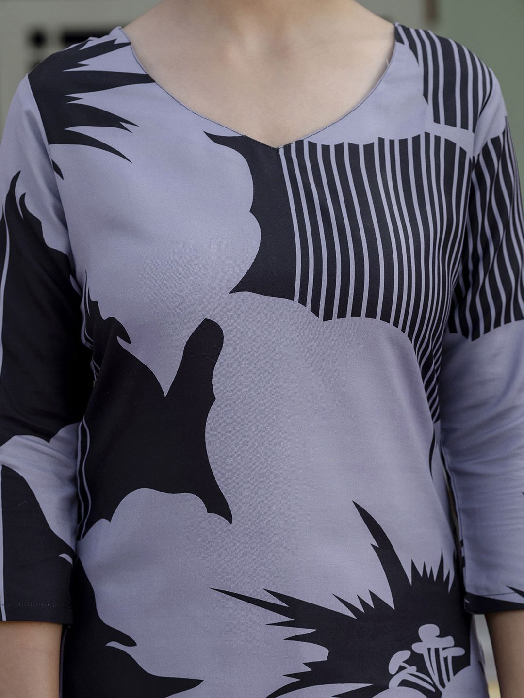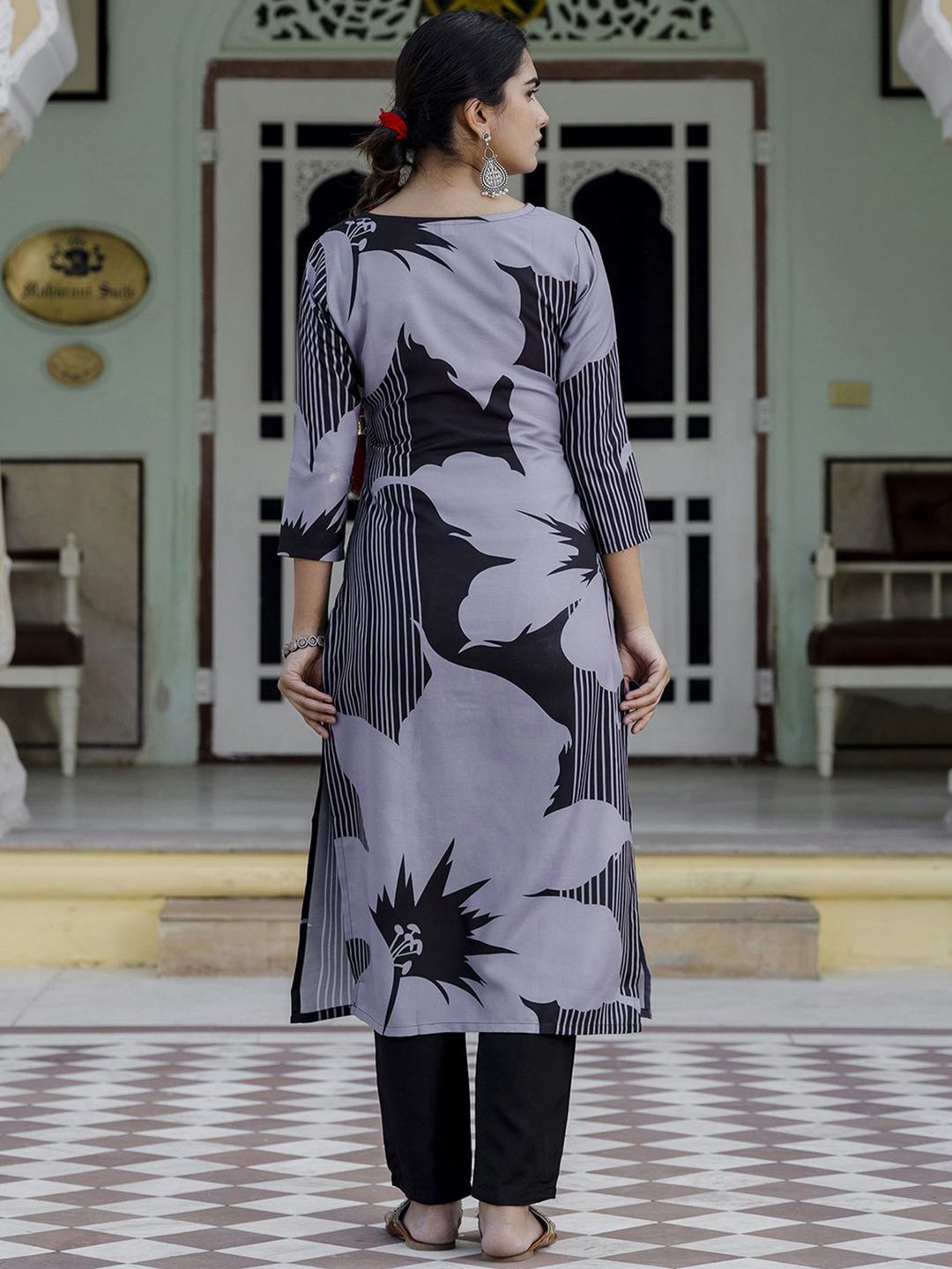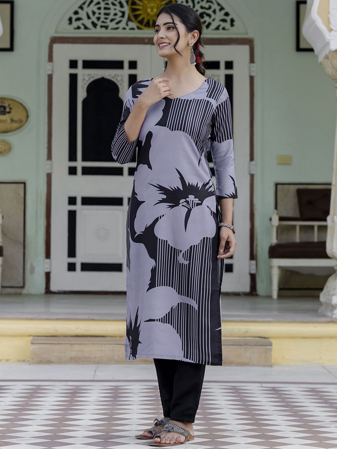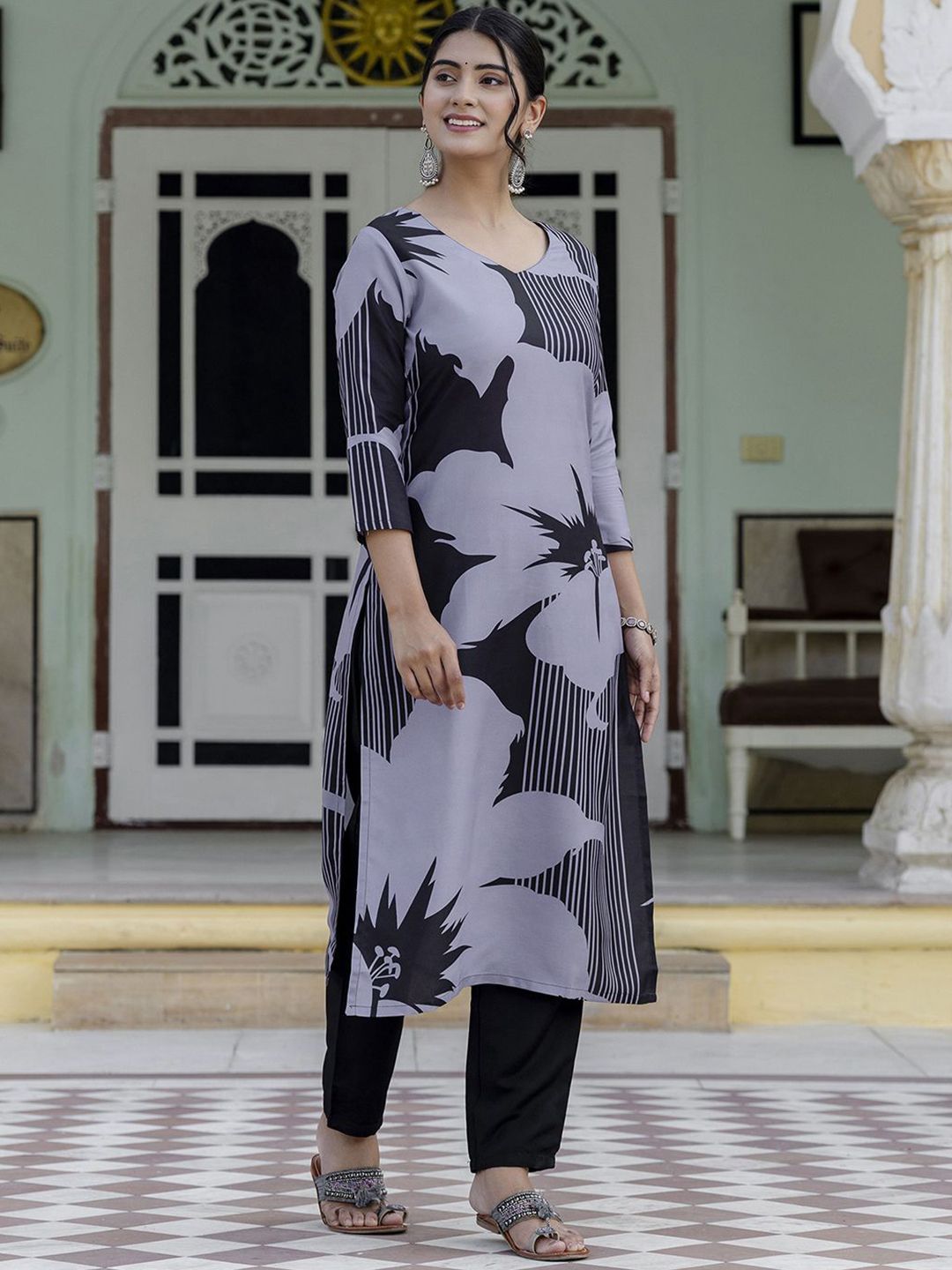 KALINI Floral Printed Round Neck Straight Kurta With Trousers