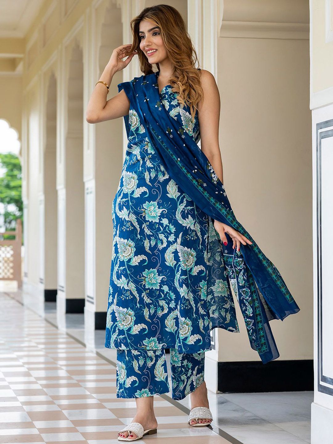 KALINI Floral Printed Straight Pure Cotton Kurta With Palazzos & Dupatta