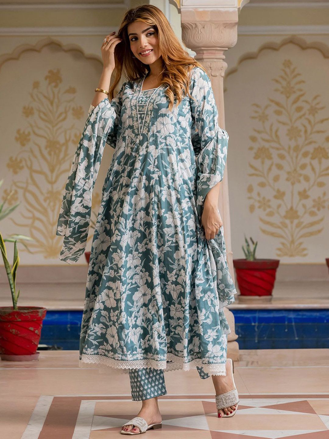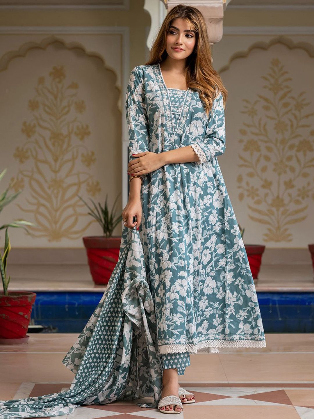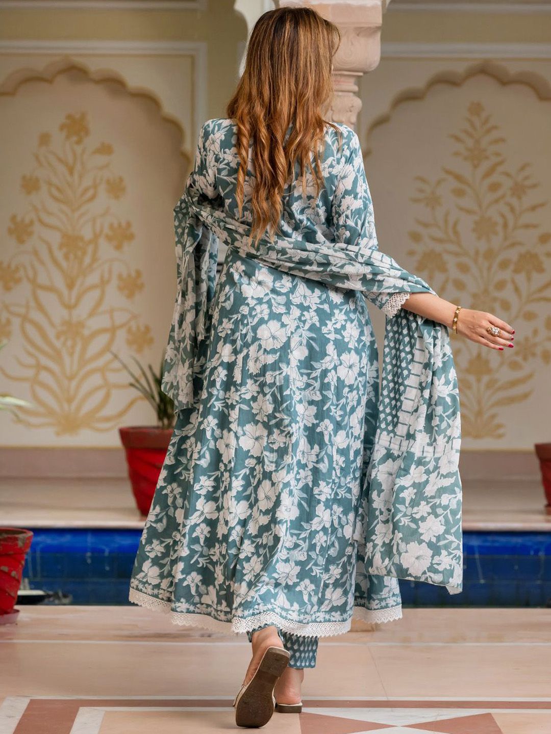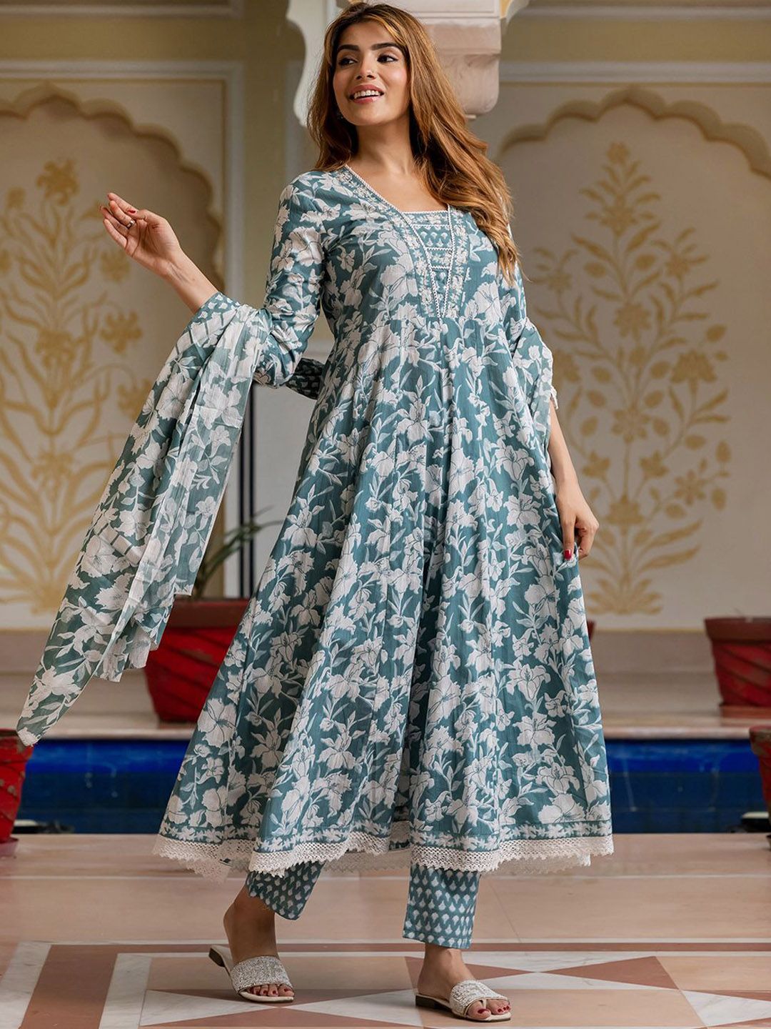 KALINI Floral Printed V-Neck Anarkali Pure Cotton Kurta With Trousers & Dupatta