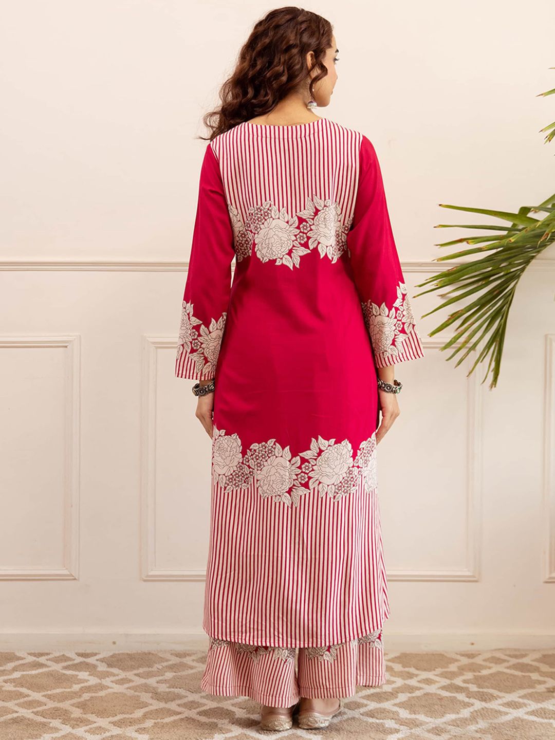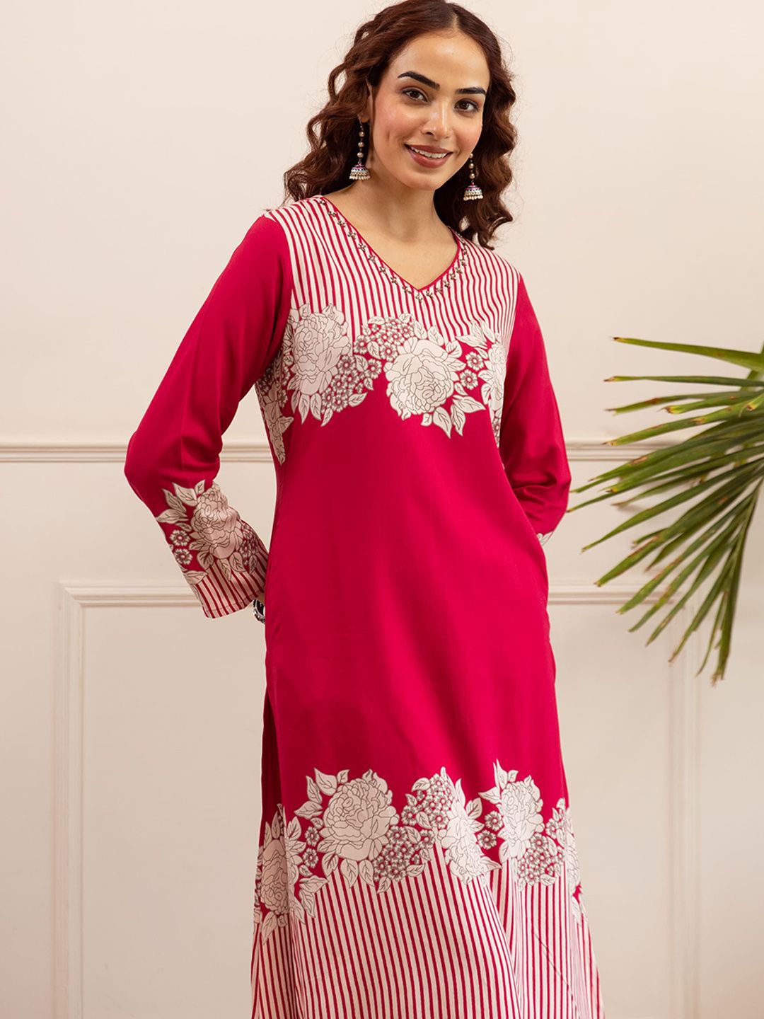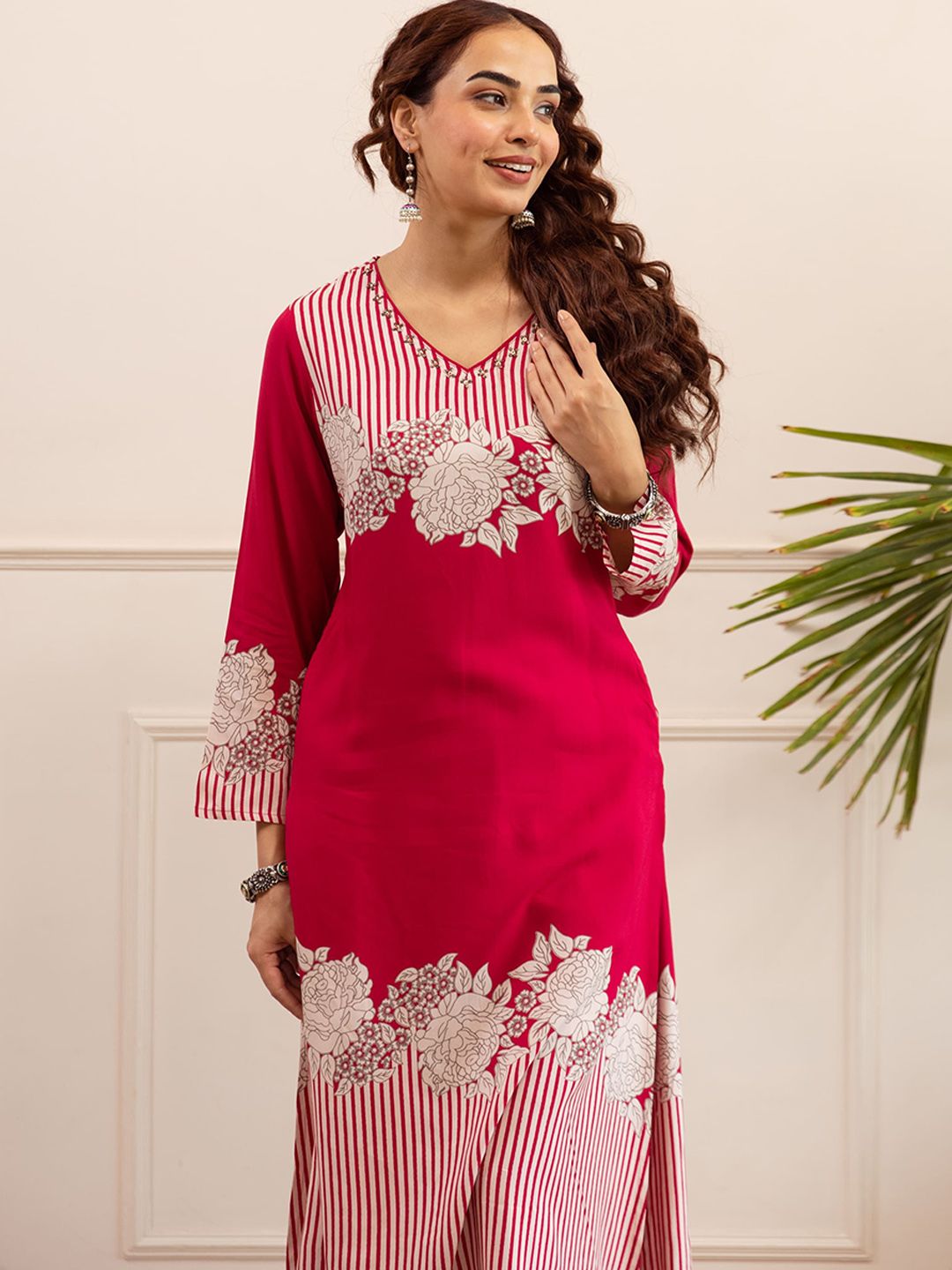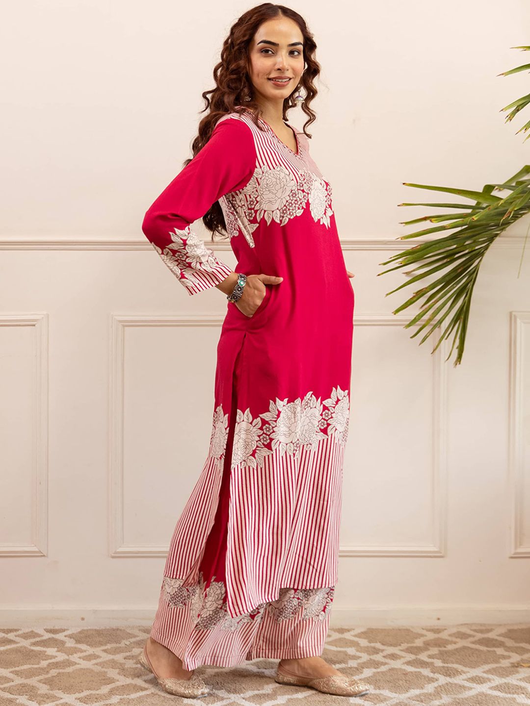 KALINI Floral Printed V-Neck Straight Kurta With Palazzo