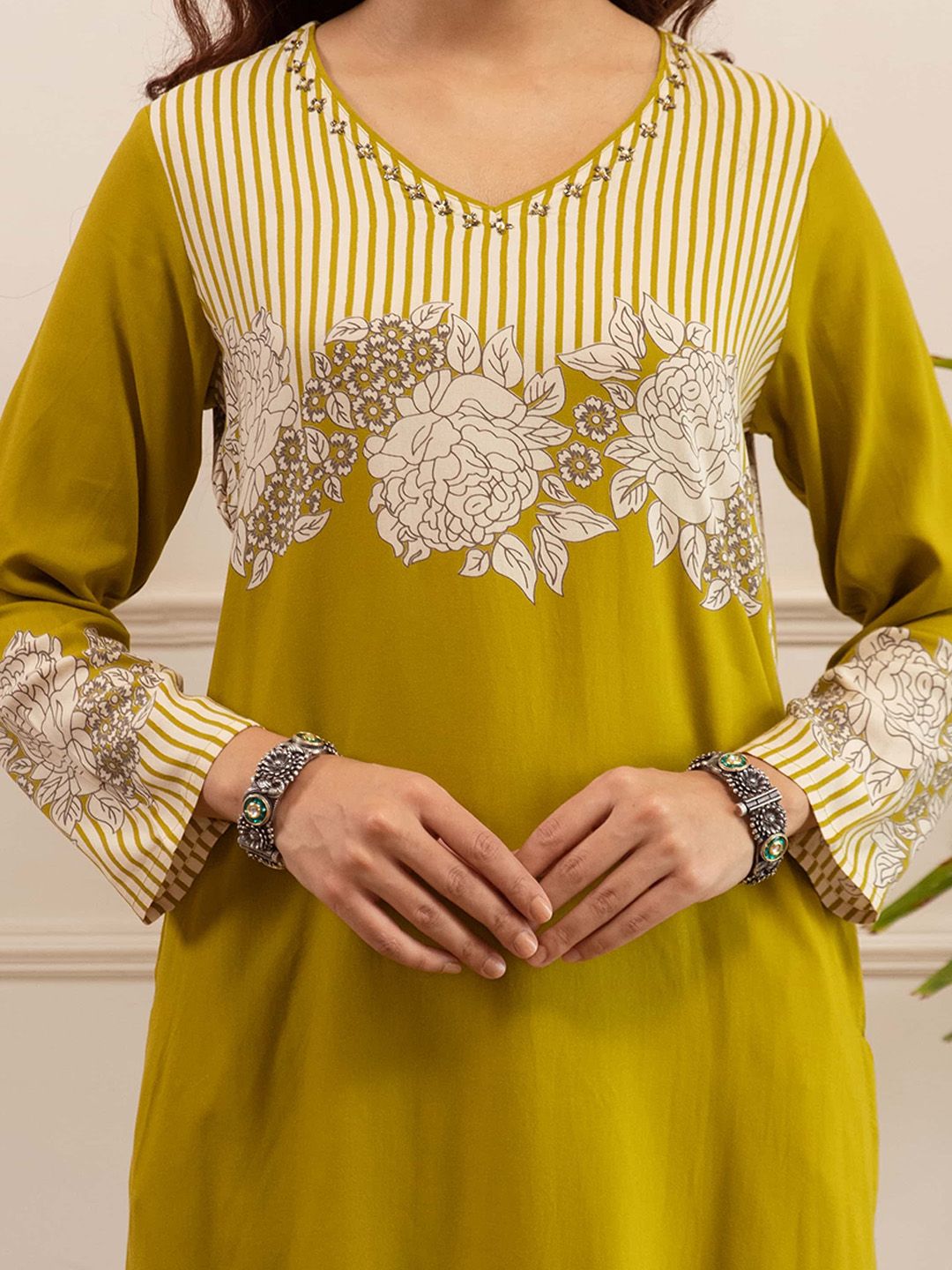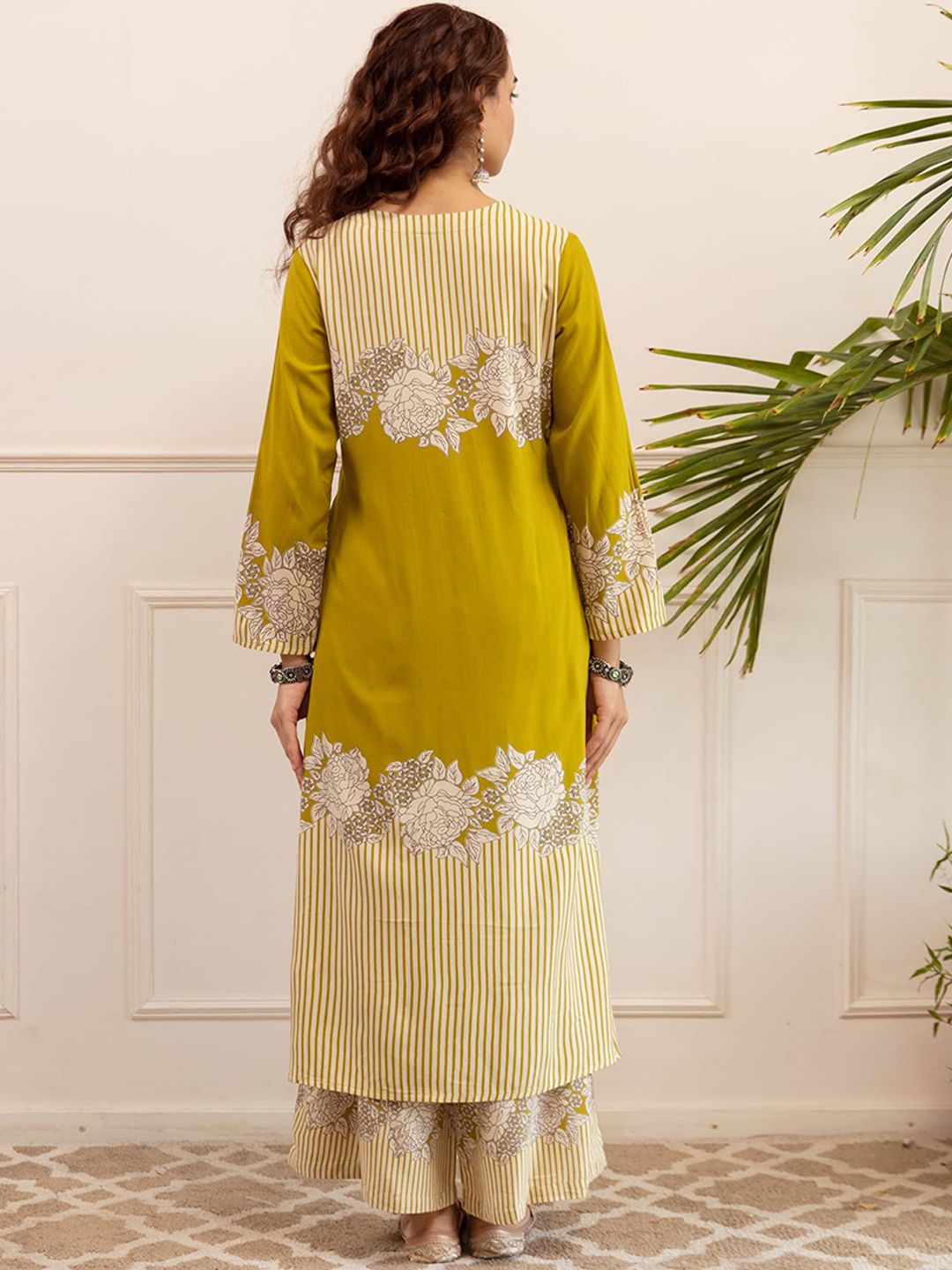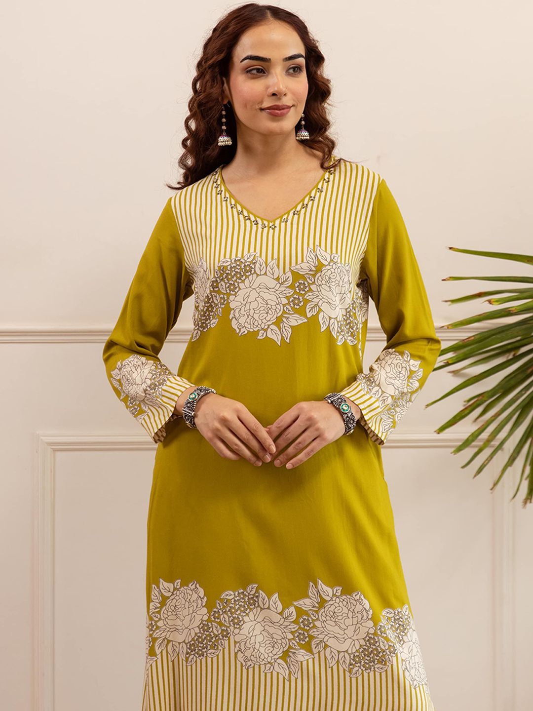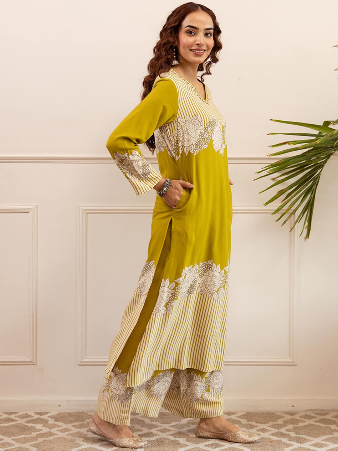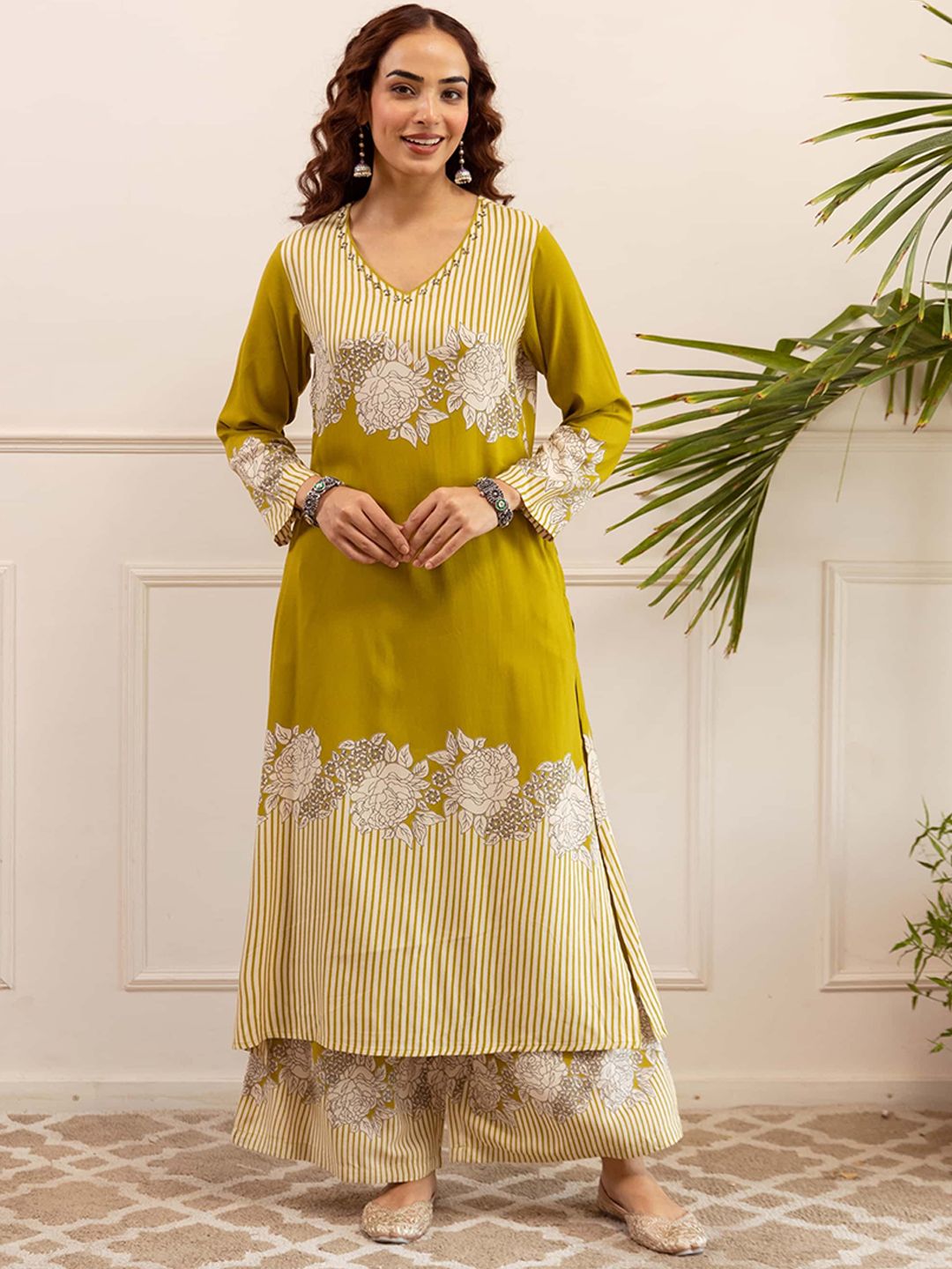 KALINI Floral Printed V-Neck Straight Kurta With Palazzos