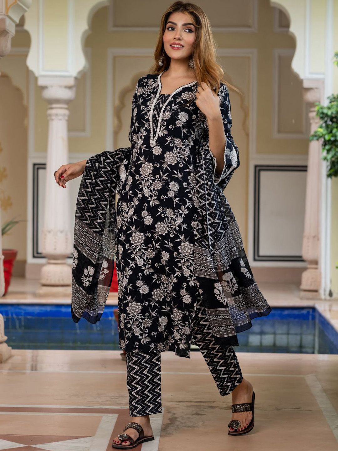KALINI Floral Printed V-Neck Thread Work Pure Cotton Kurta With Trousers & Dupatta