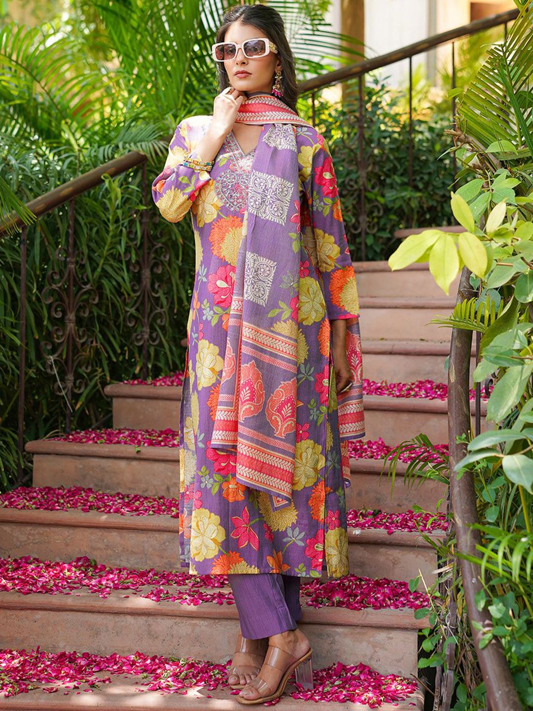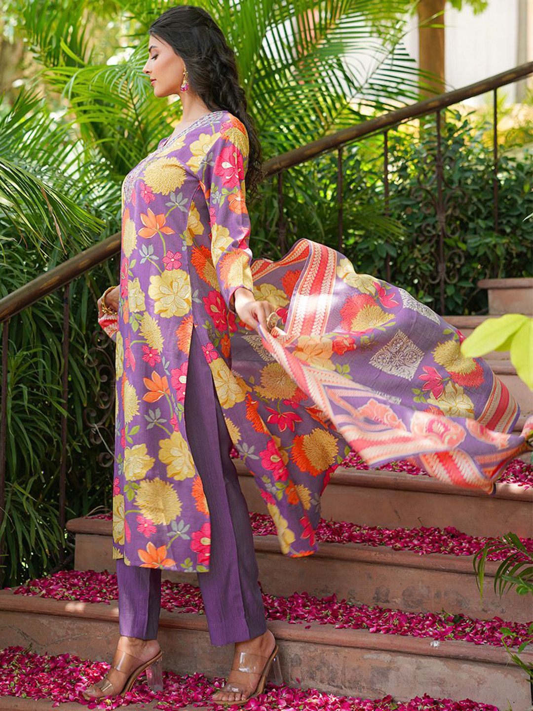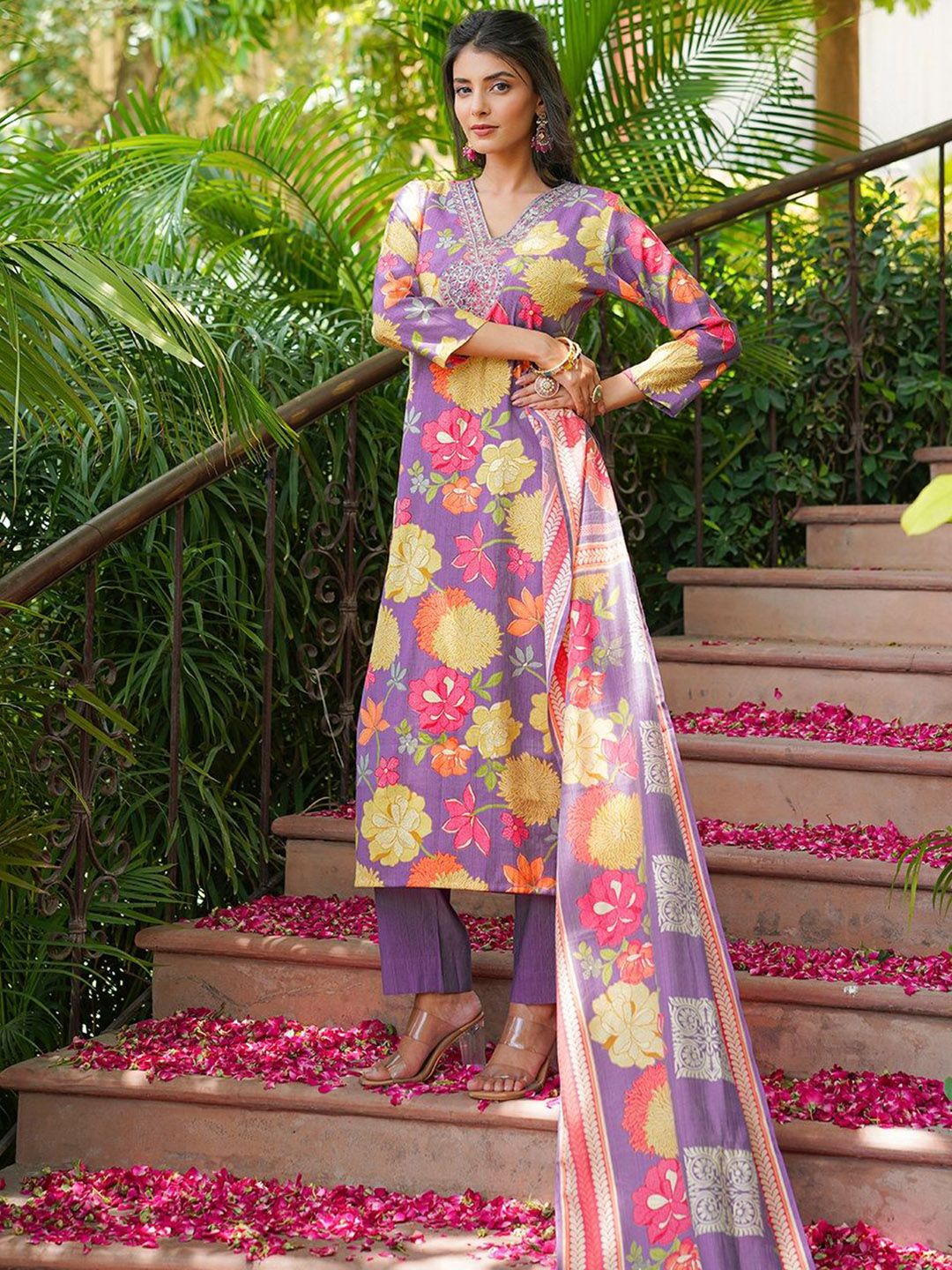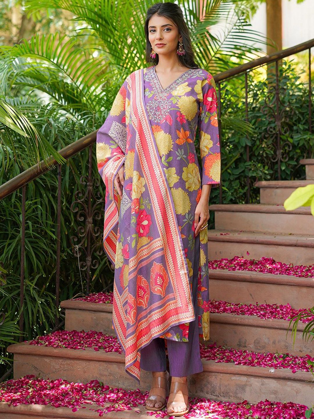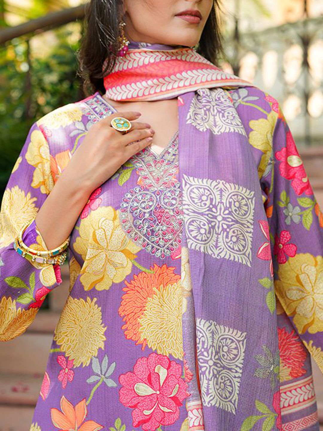 KALINI Floral Printed V-Neck Thread Work Straight Kurta With Trousers & Dupatta