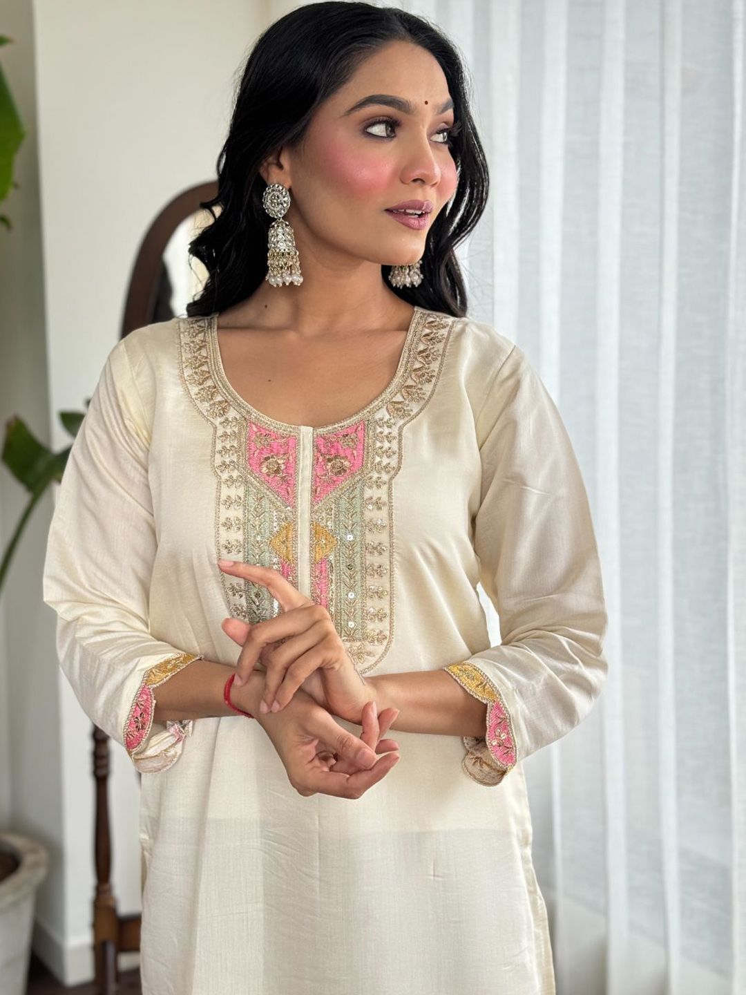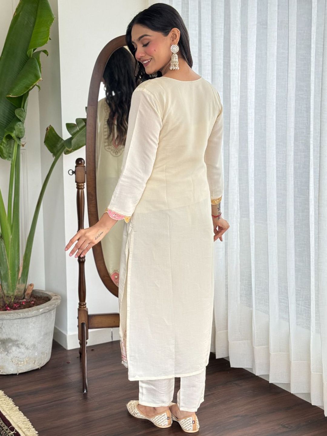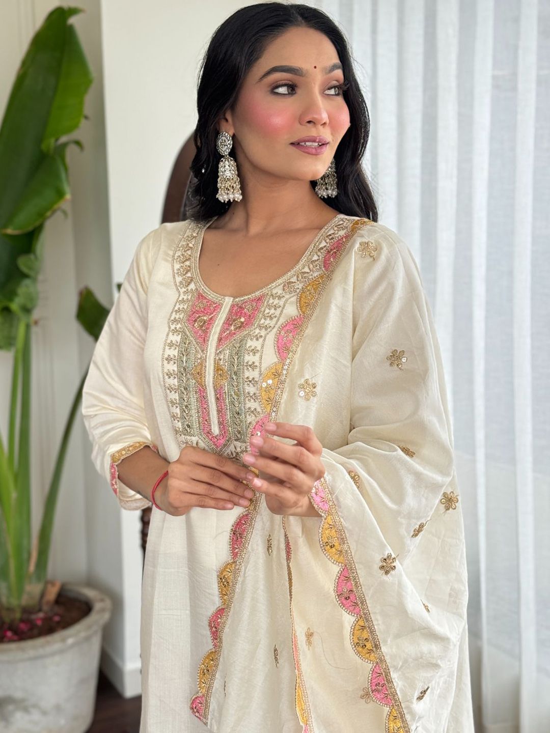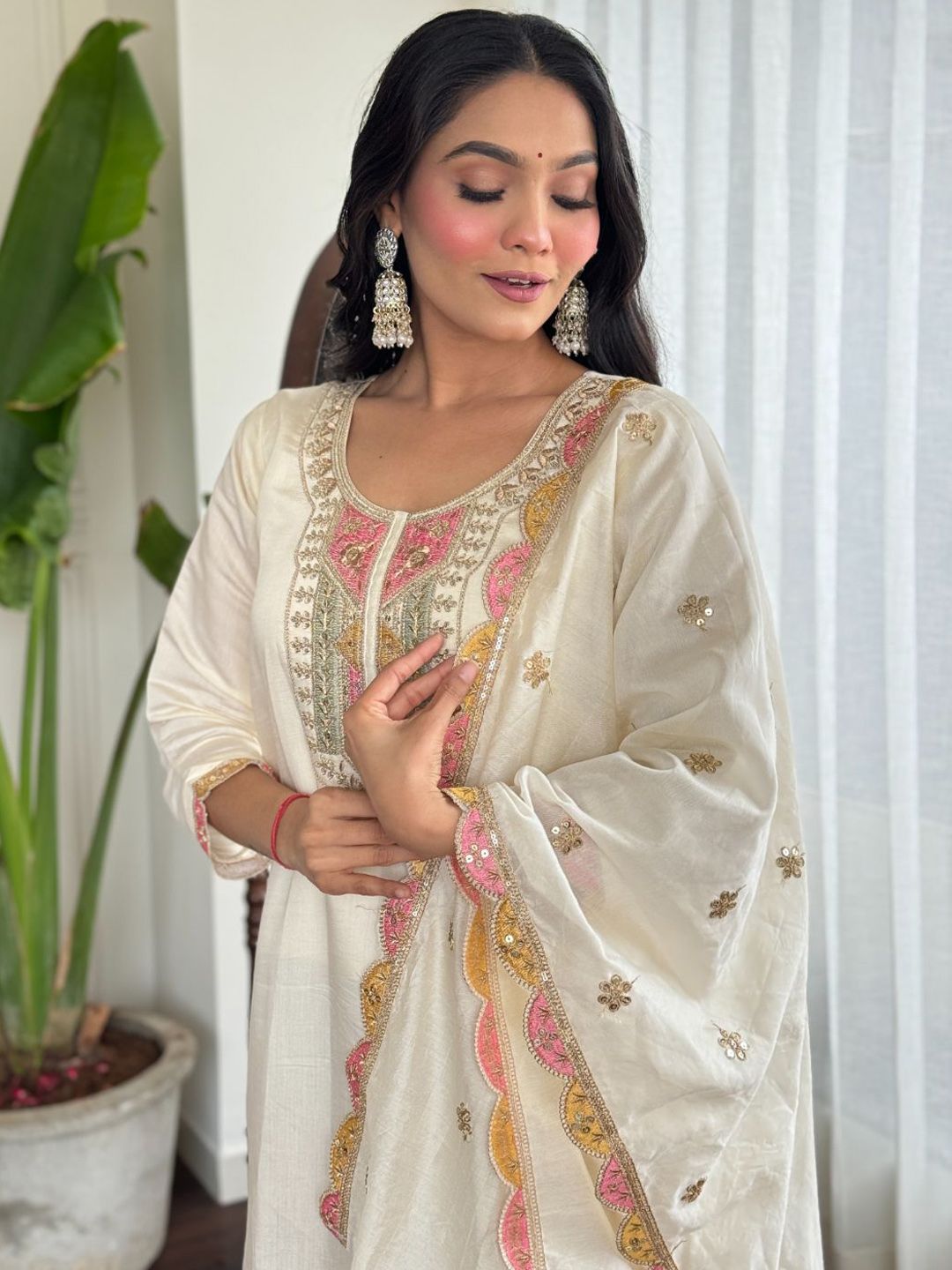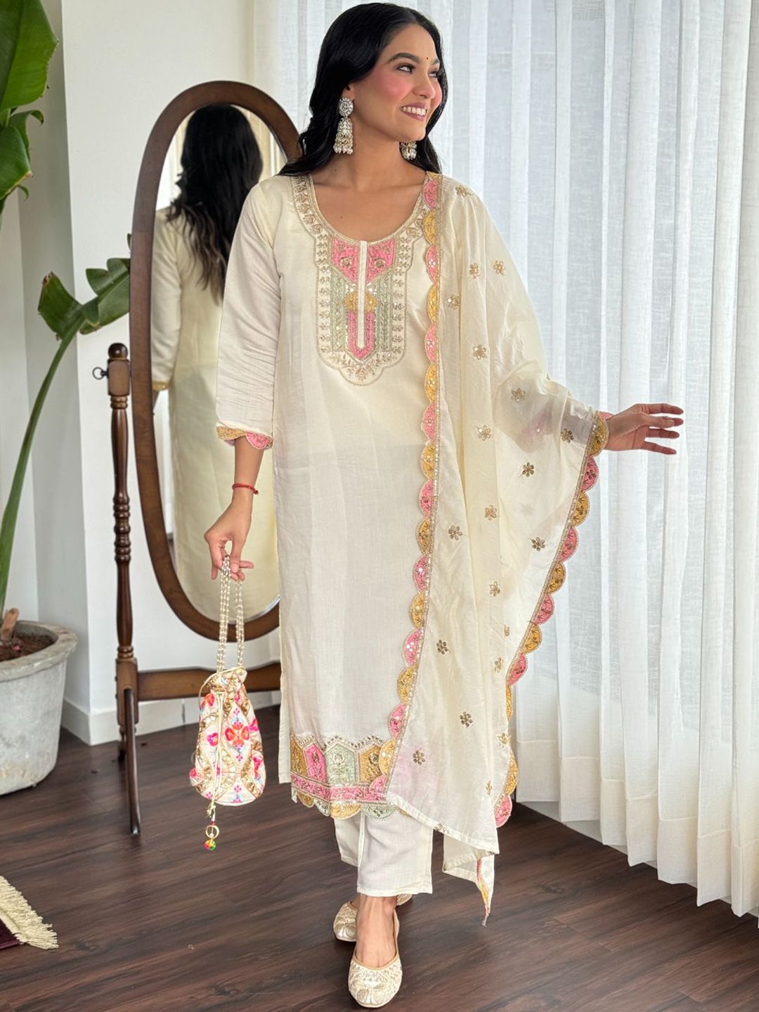 KALINI Floral Yoke Design Sequnnied Chanderi Silk Straight Kurta With Trousers & Dupatta