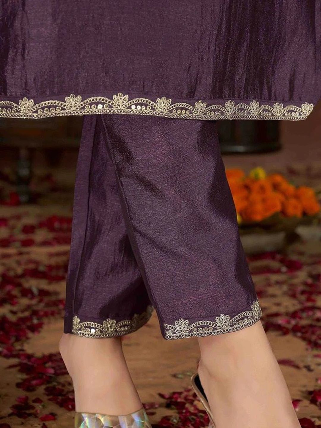 KALINI Floral Yoke Design V-Neck Thread Work Straight Kurta With Trouser & Dupatta