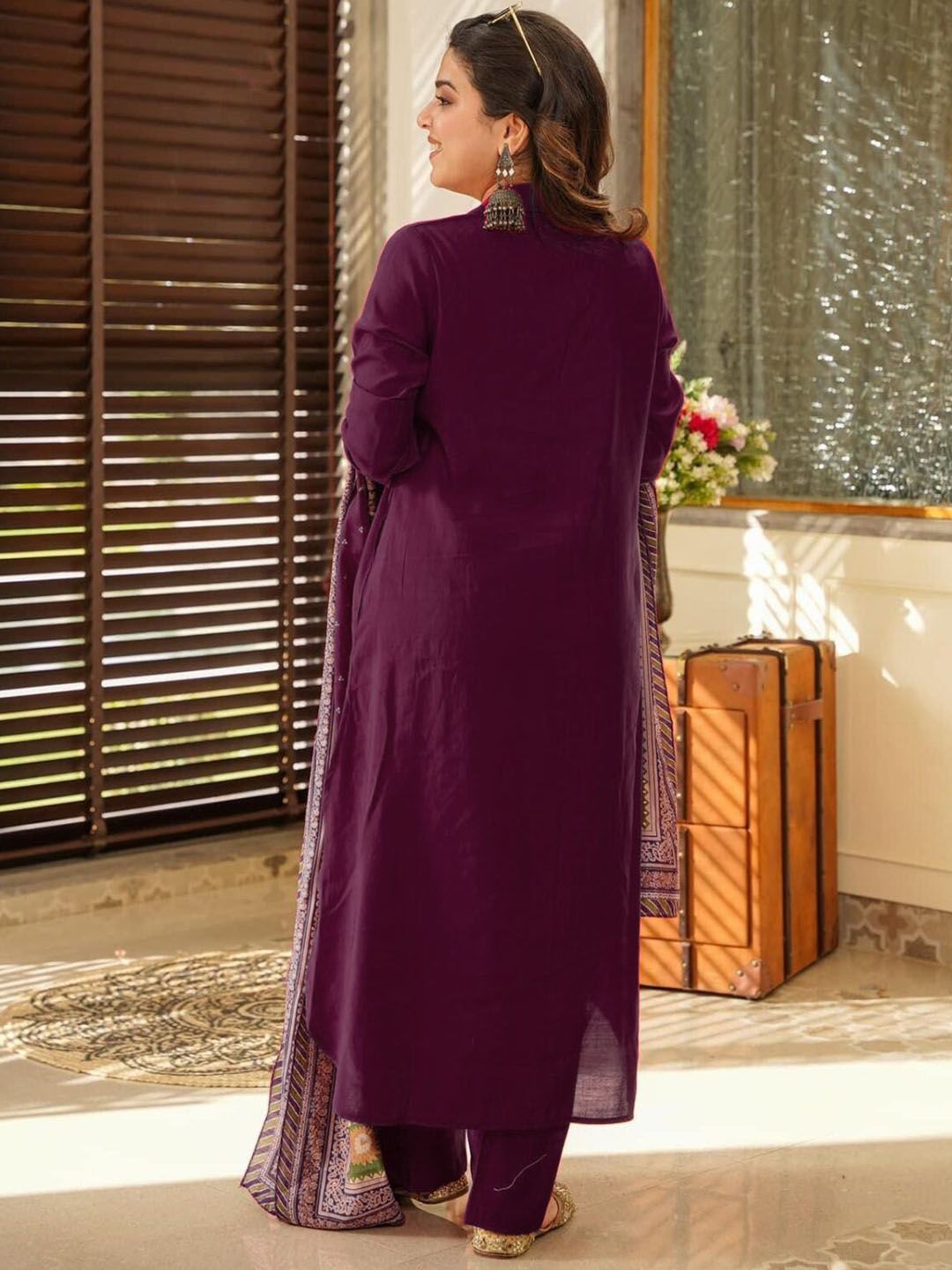 KALINI Three-Quarter Sleeves Shirt Collar Thread Work A-Line Kurta With Trousers & Dupatta