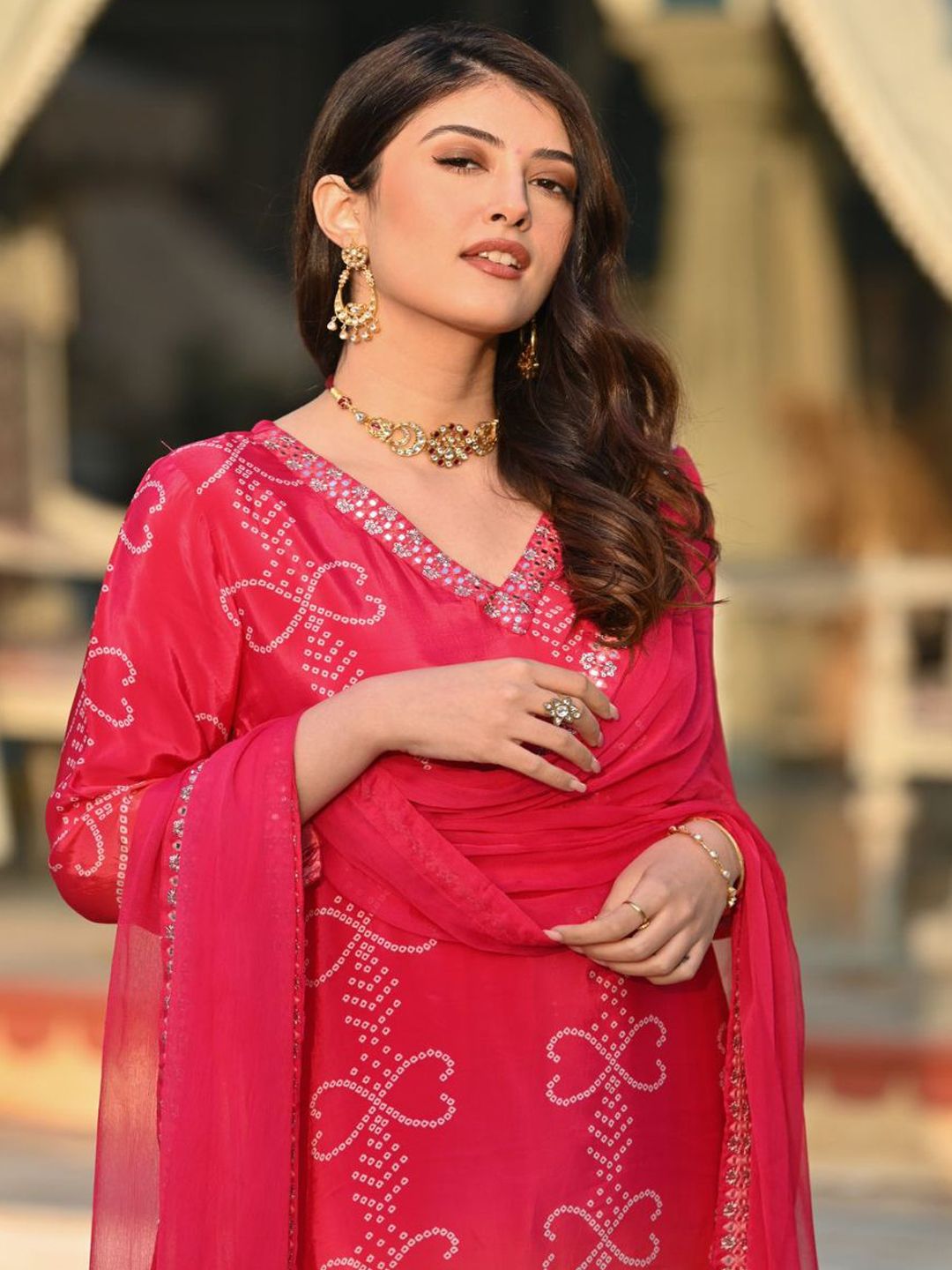 KALINI Women Bandhani Embroidered Regular Mirror Work Kurta & Trousers With Dupatta