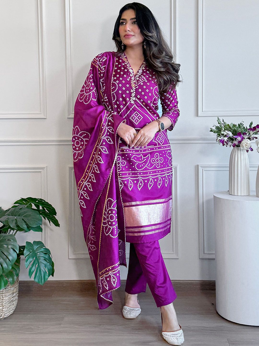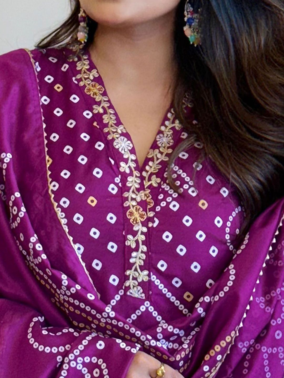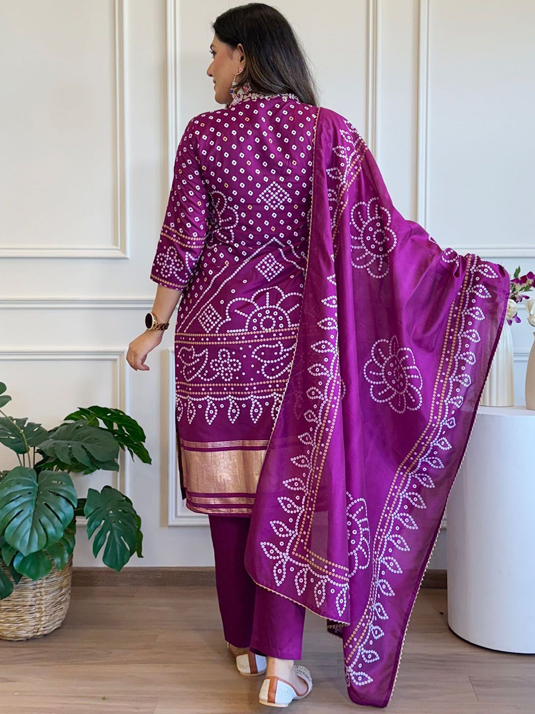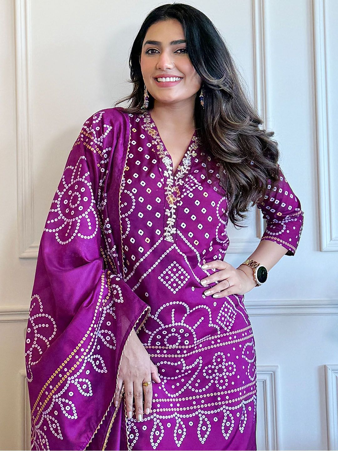 KALINI Women Bandhani Printed Regular Thread Work Kurta with Trousers & Dupatta