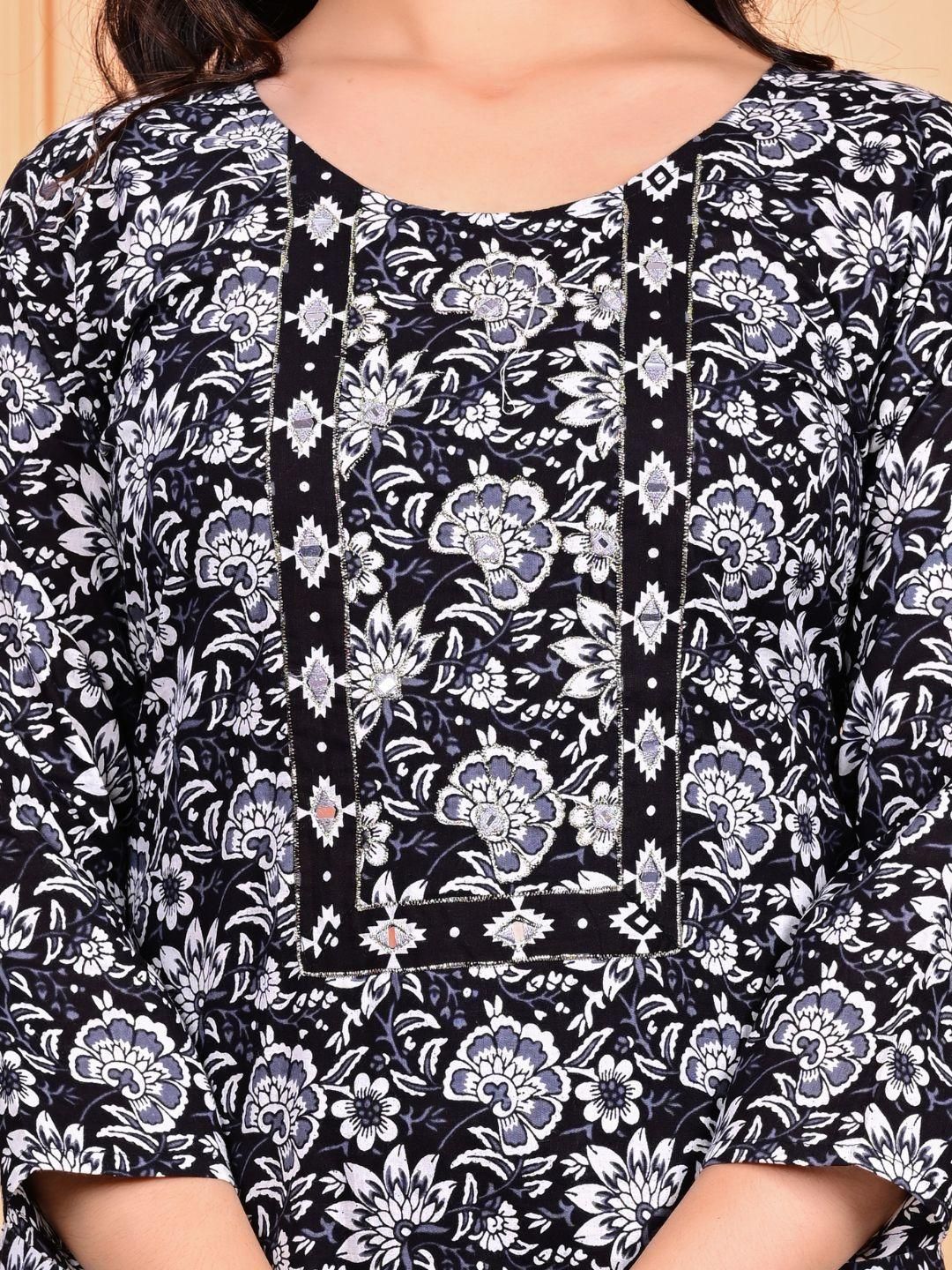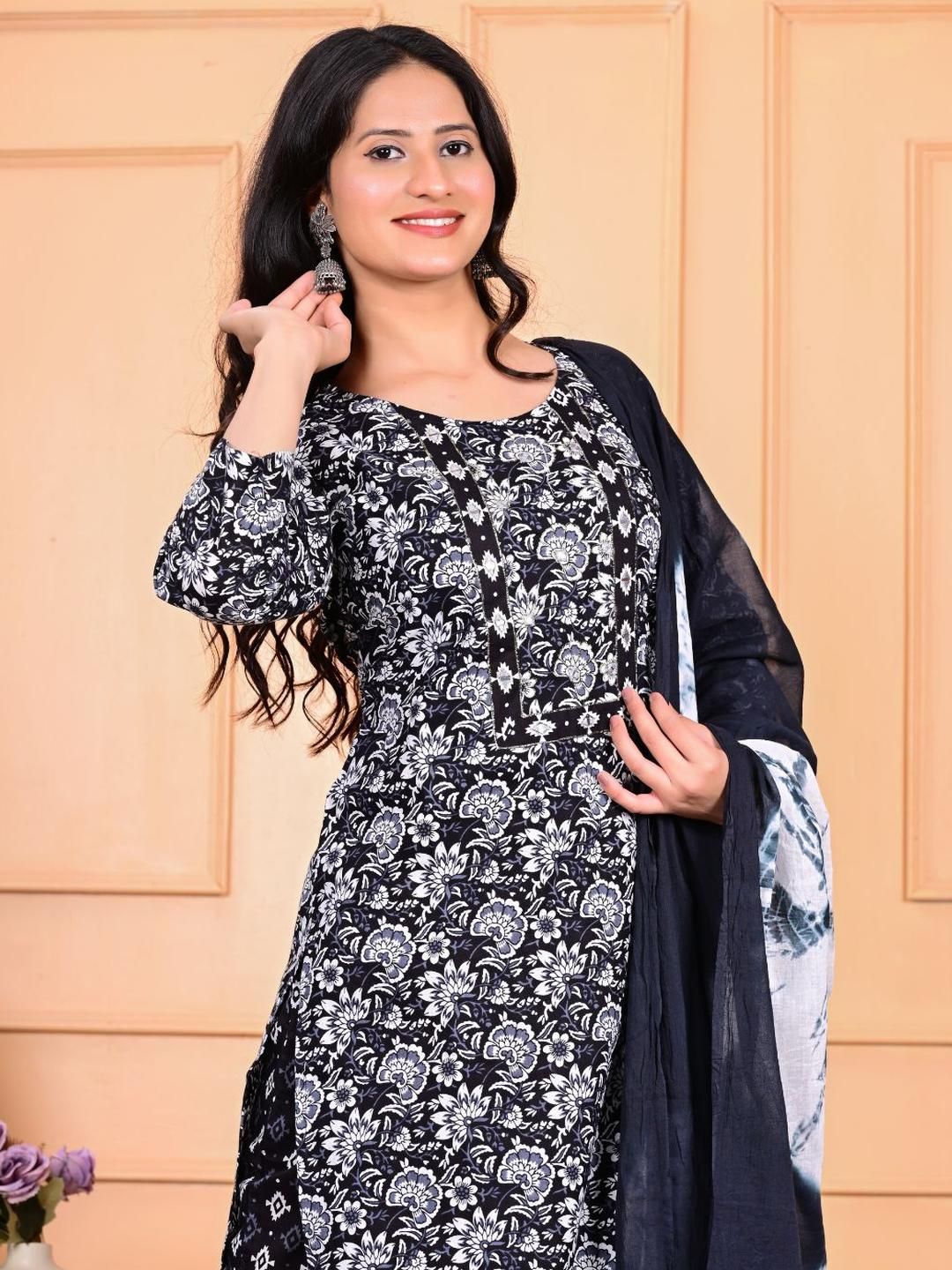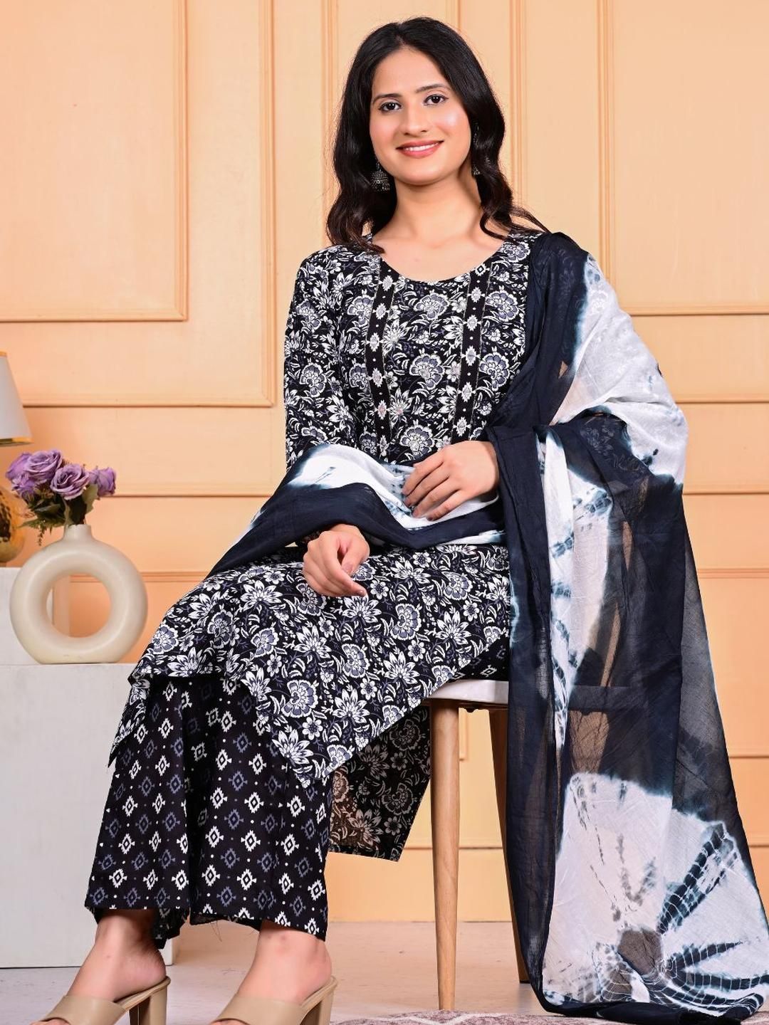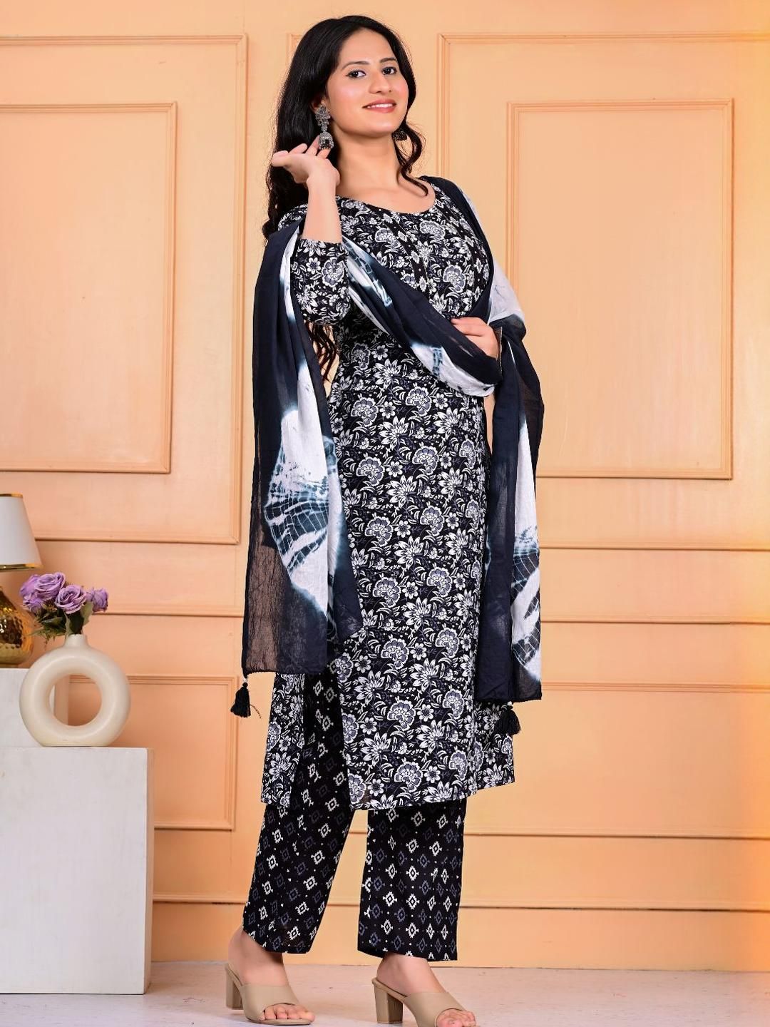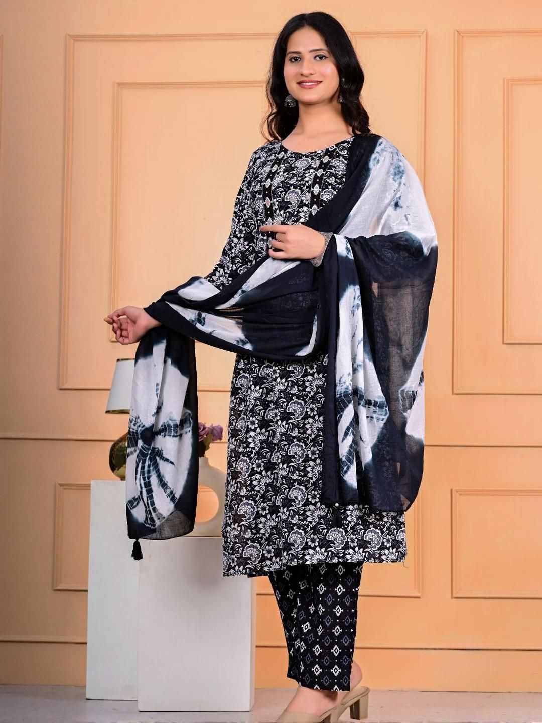 KALINI Women Black Pure Cotton Round Neck Kurta with Trousers & Dupatta