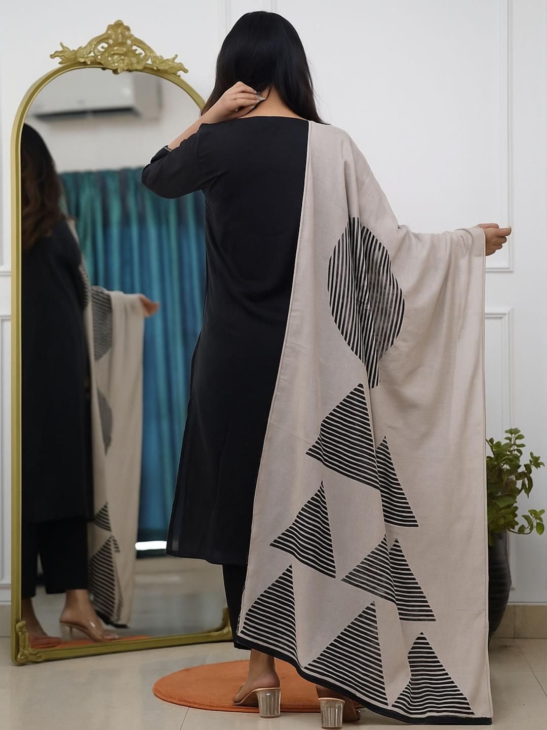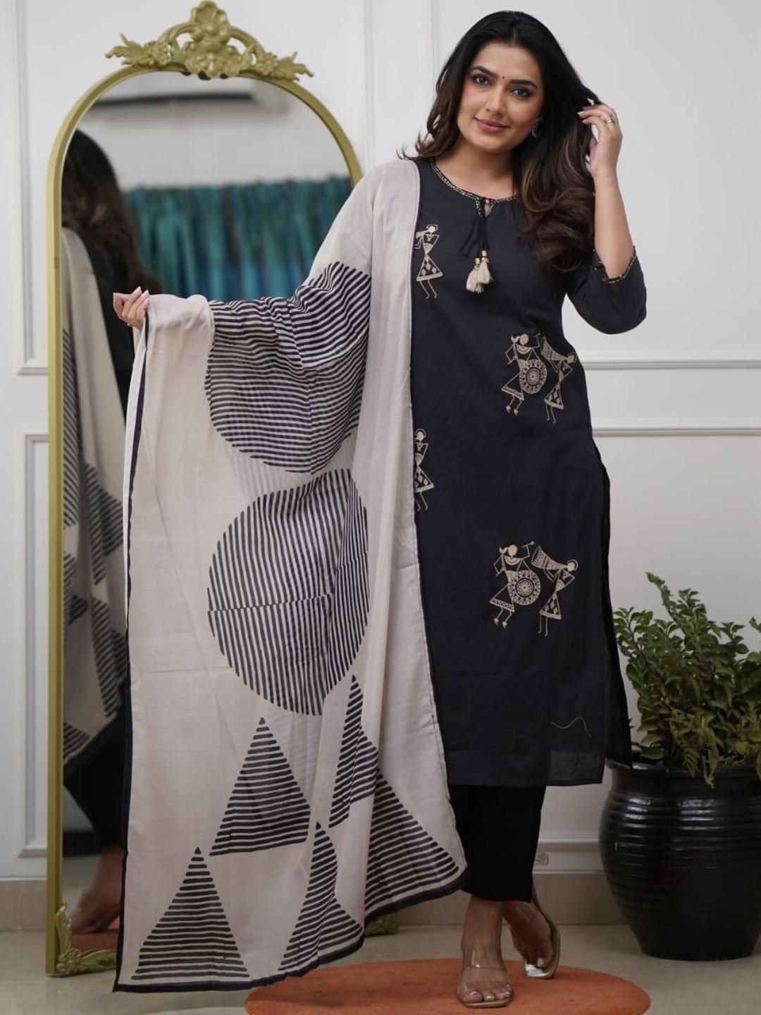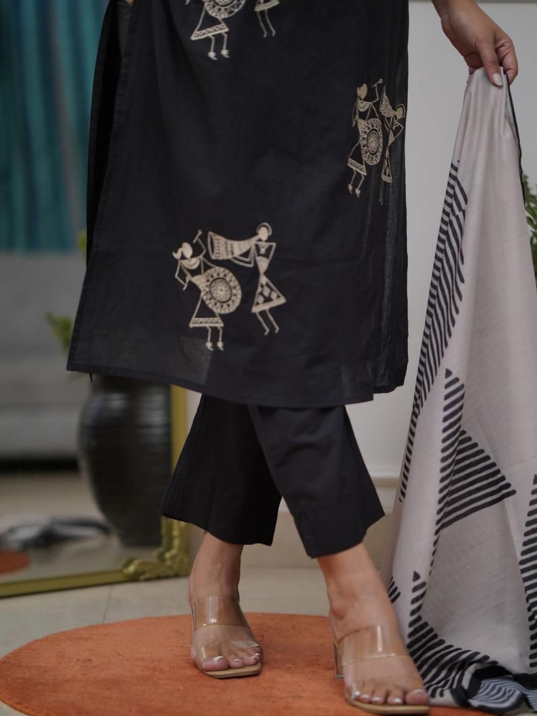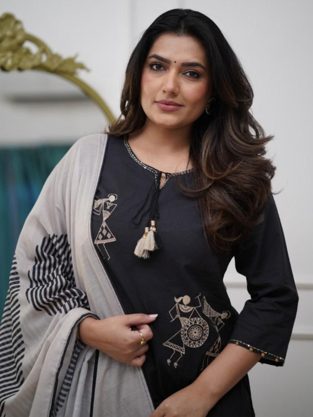 KALINI Women Black Pure Silk Round Neck Straight Embroidery Kurta Sets