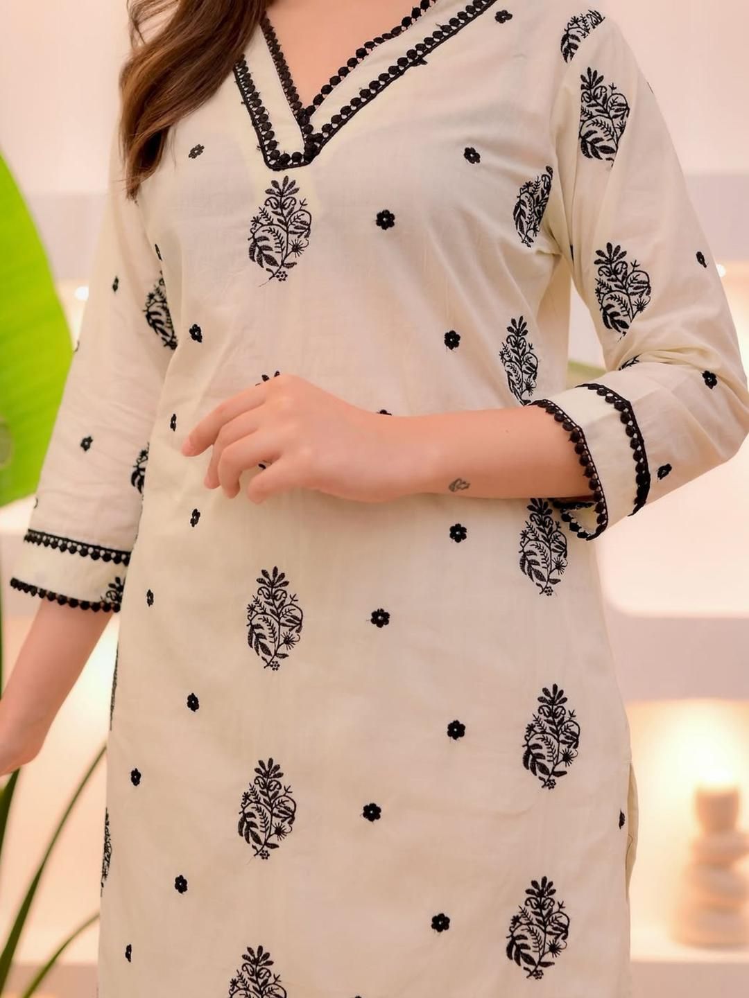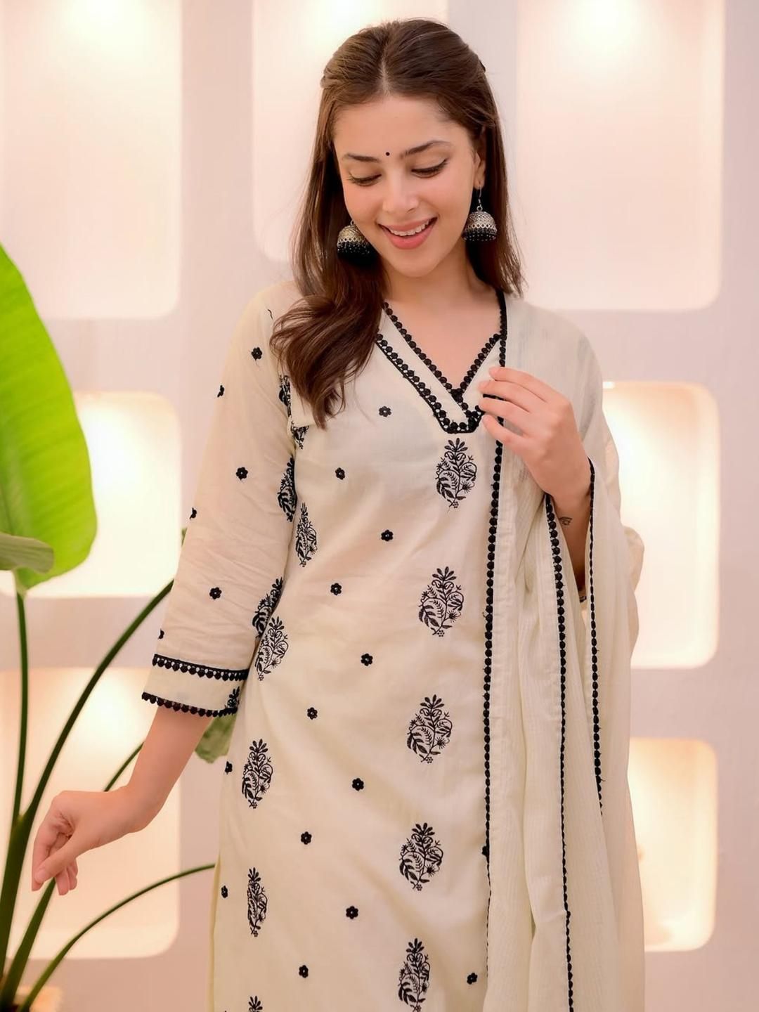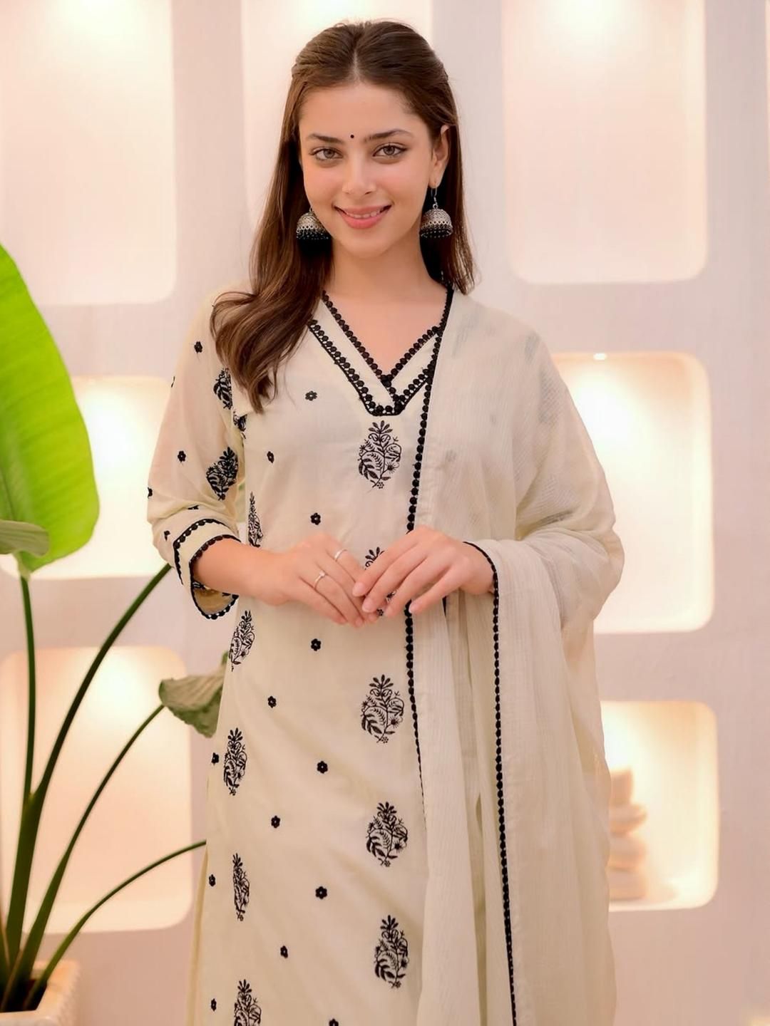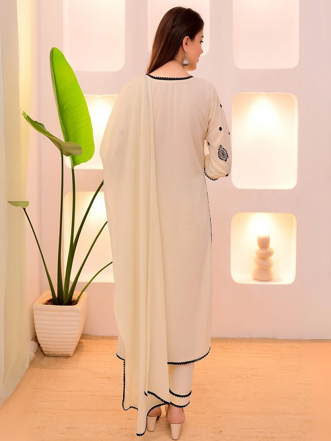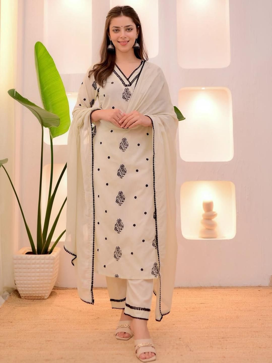 KALINI Women Cream Floral Embroidered Kurta With Trousers & Dupatta