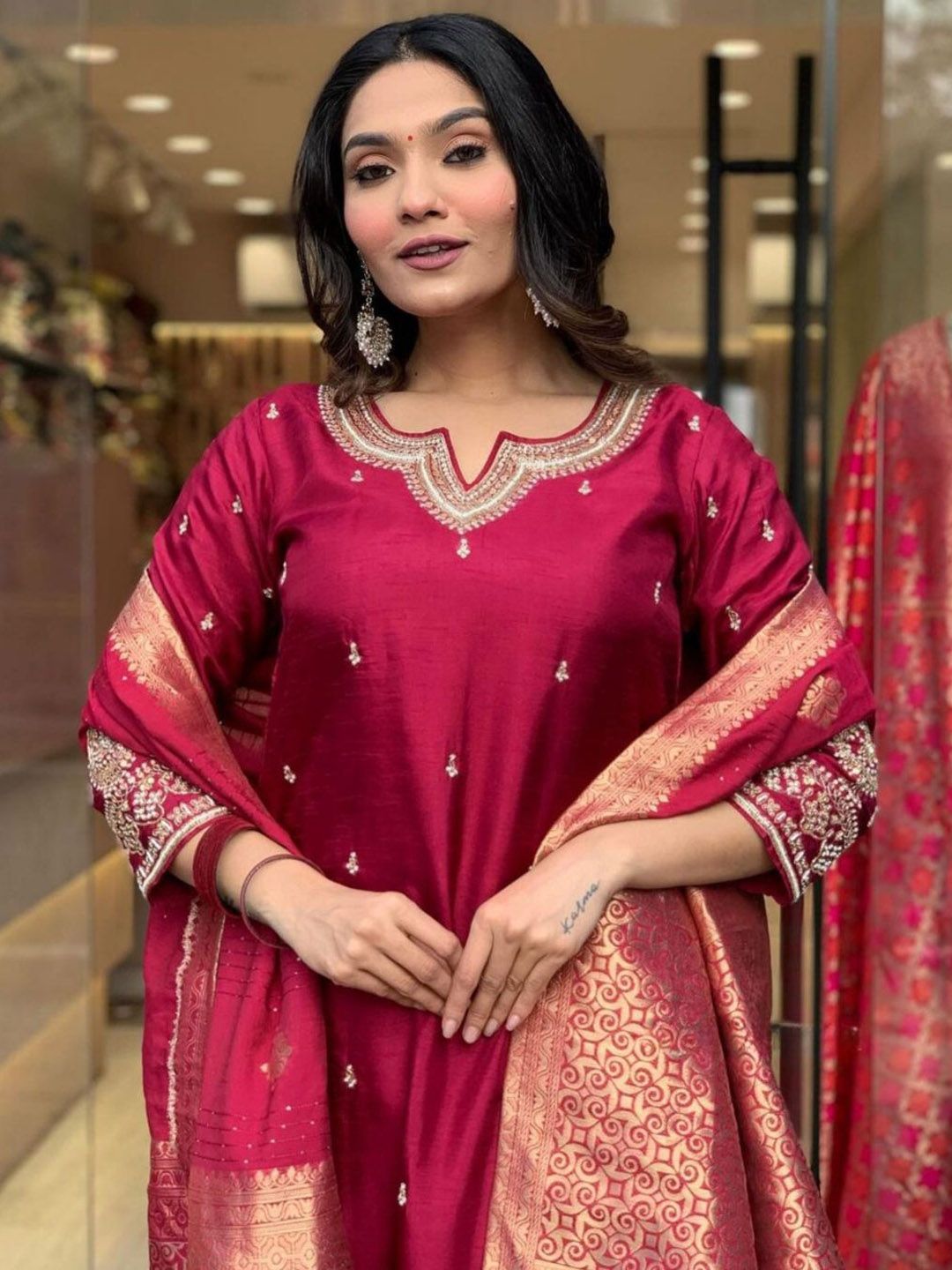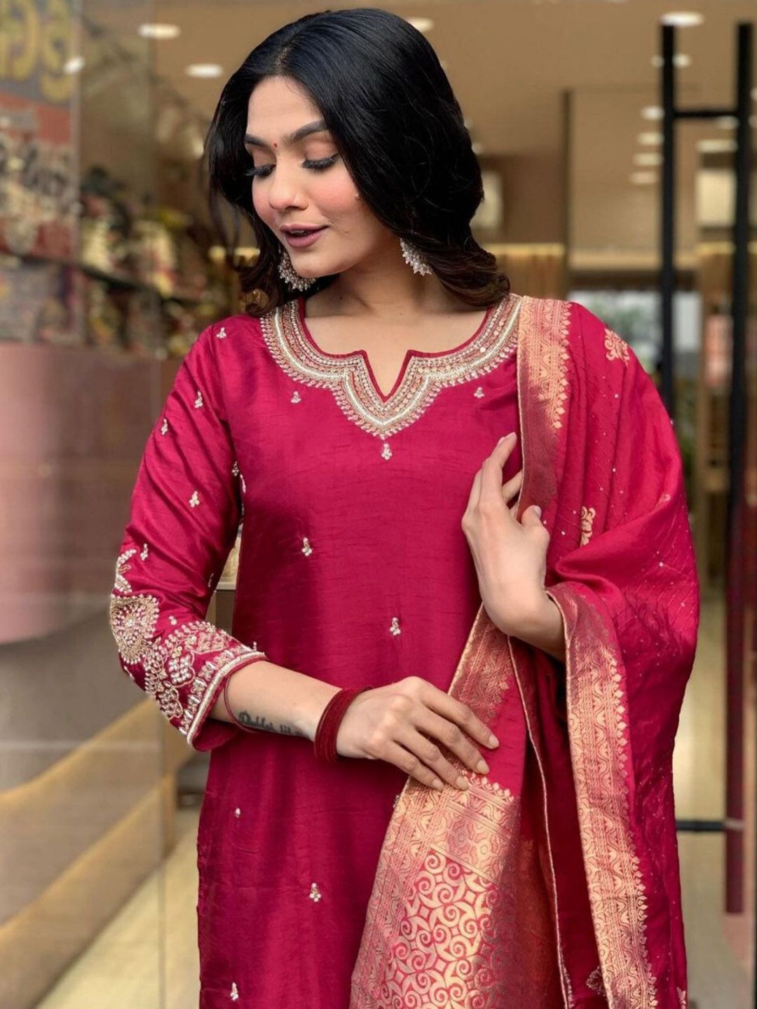 KALINI Women Embroidered Thread Work Chanderi Silk Kurta with Trousers & With Dupatta