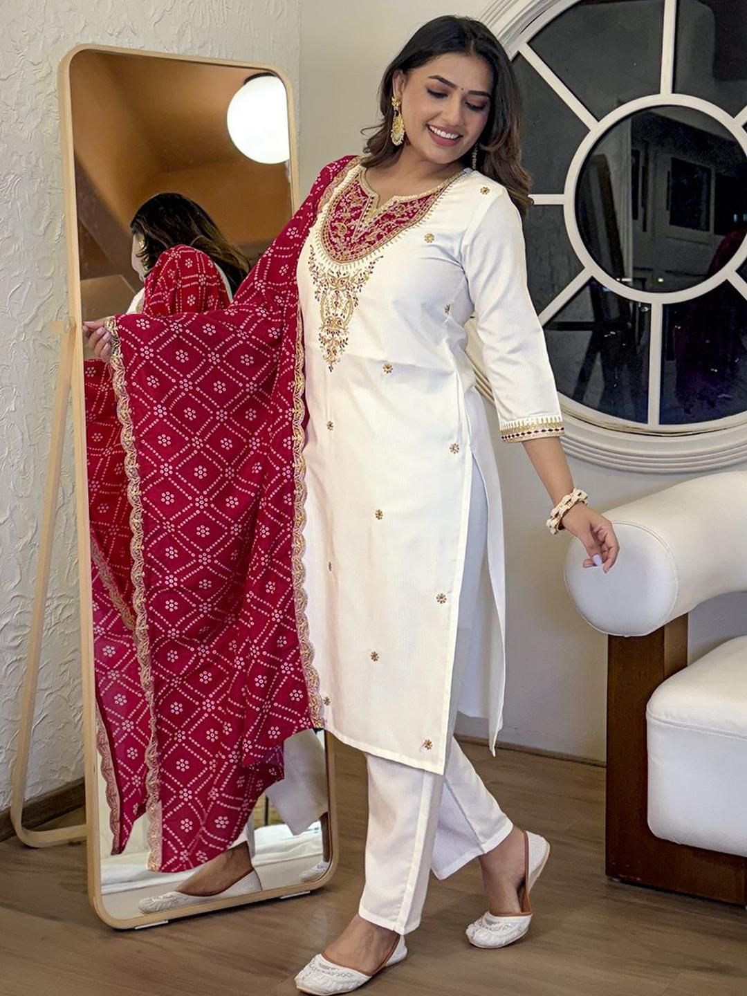 Buy this stylish KALINI Women Ethnic Motifs Embroidered Regular Thread Work Kurta with Trousers & Dupatta at Marincart Nepal. This product offers great quality and value. Perfect for those looking for the latest trends in fashion. Get yours now at unbeatable prices.