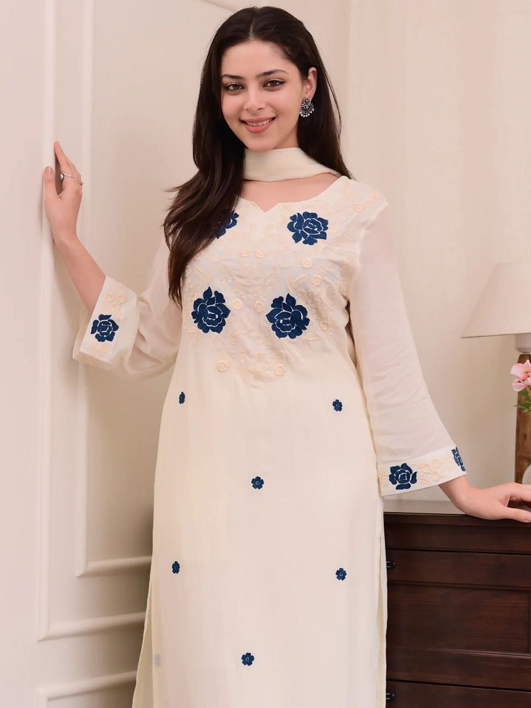 Buy this stylish KALINI Women Floral Embroidered Thread Work Pure Cotton Kurta with Trousers & Dupatta at Marincart Nepal. This product offers great quality and value. Perfect for those looking for the latest trends in fashion. Get yours now at unbeatable prices.