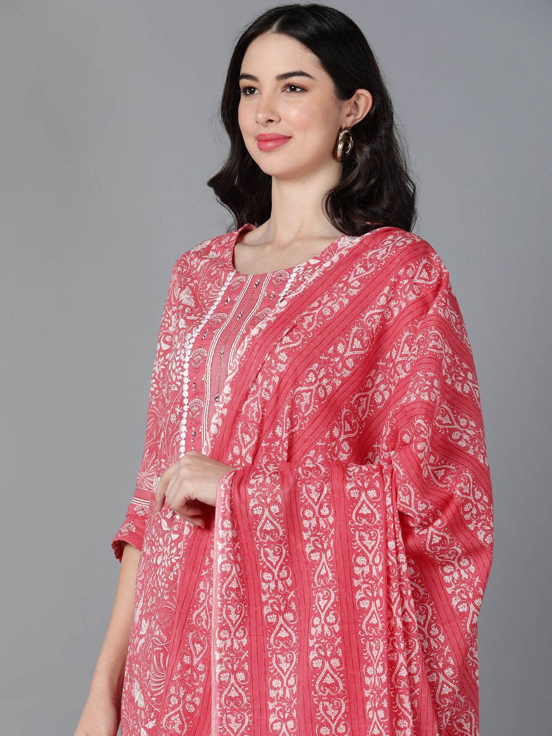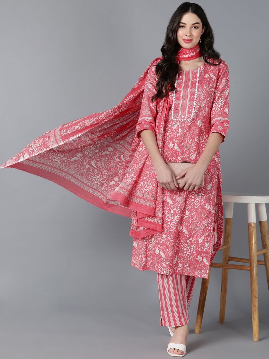 KALINI Women Floral Printed Pure Cotton Straight Kurta with Trousers & Dupatta