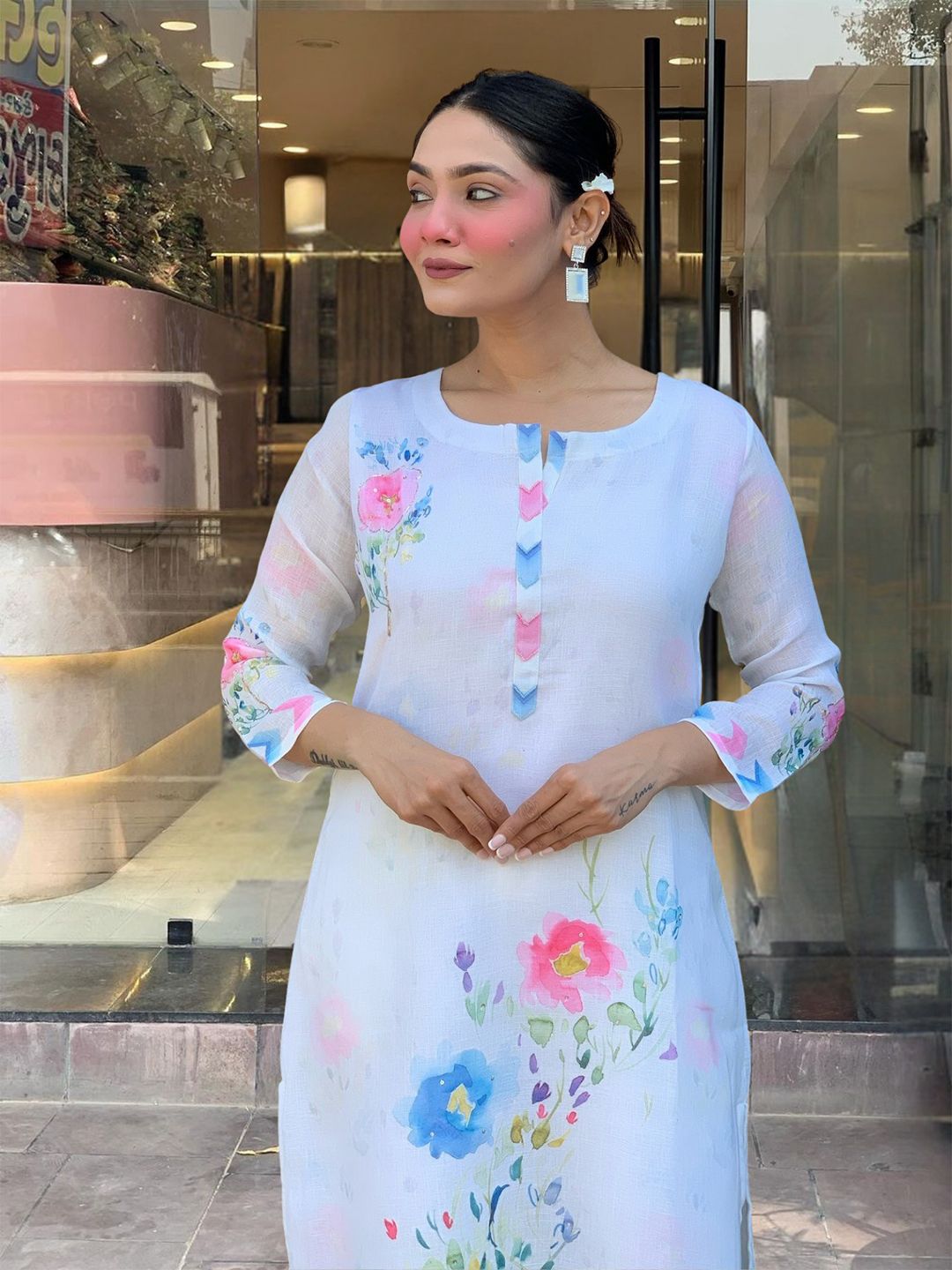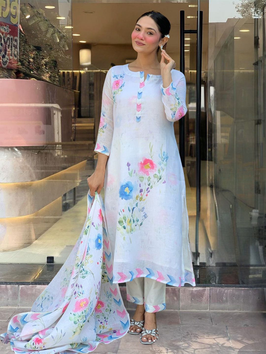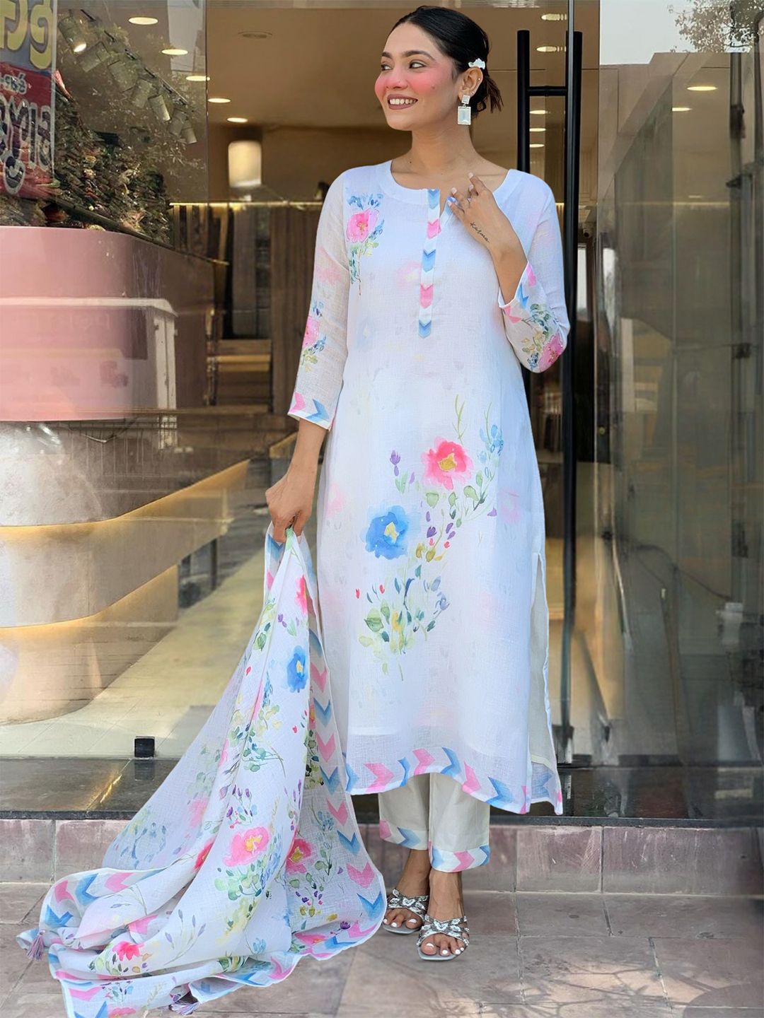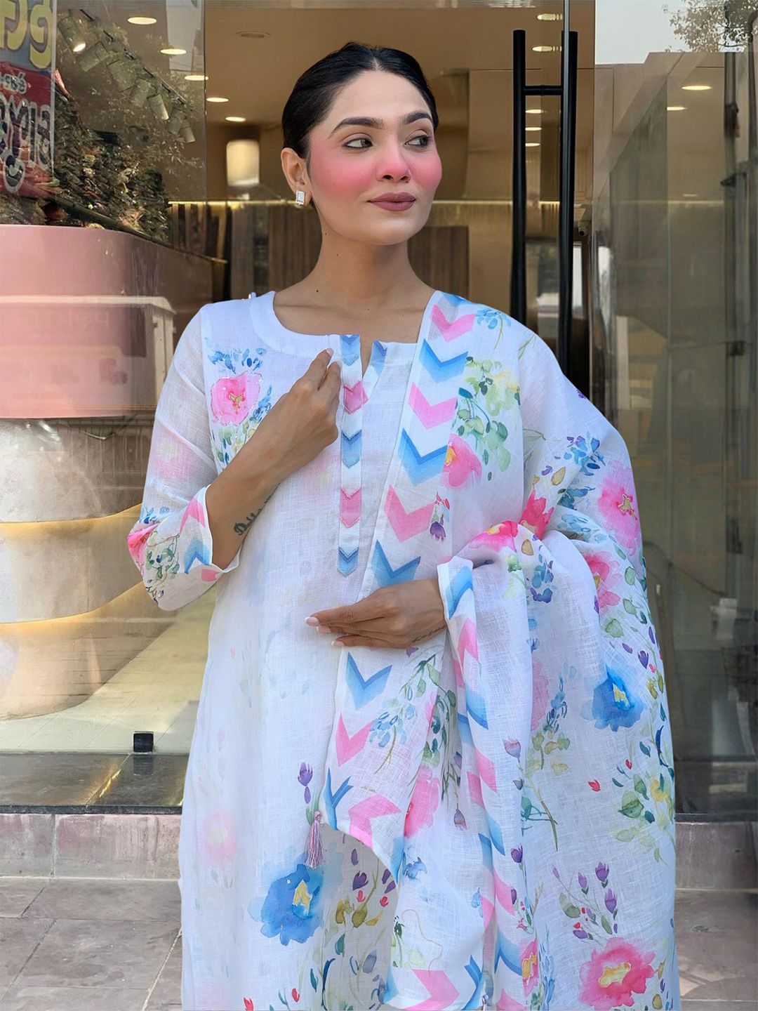 KALINI Women Floral Printed Regular Linen Kurta with Trousers & Dupatta