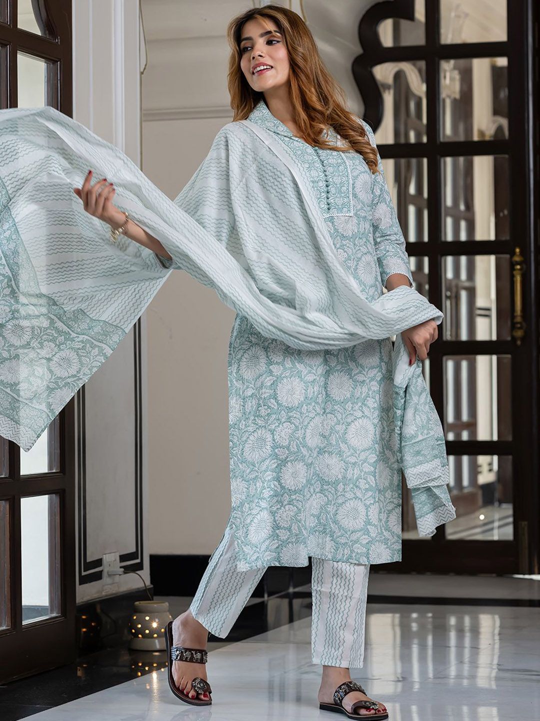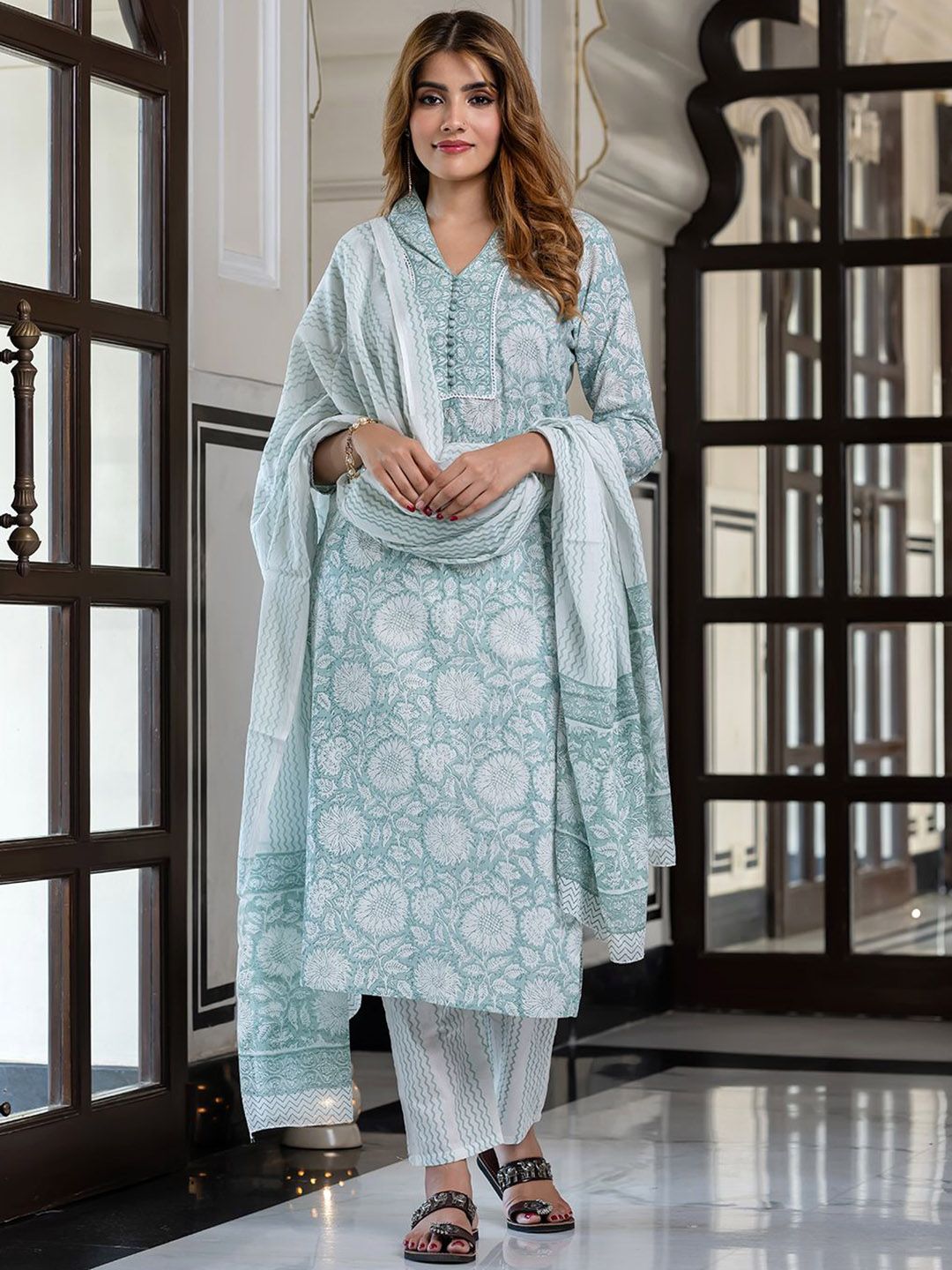 KALINI Women Floral Printed Regular Pure Cotton Kurta with Trousers & Dupatta