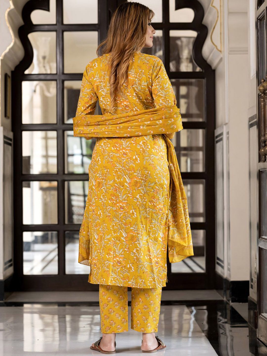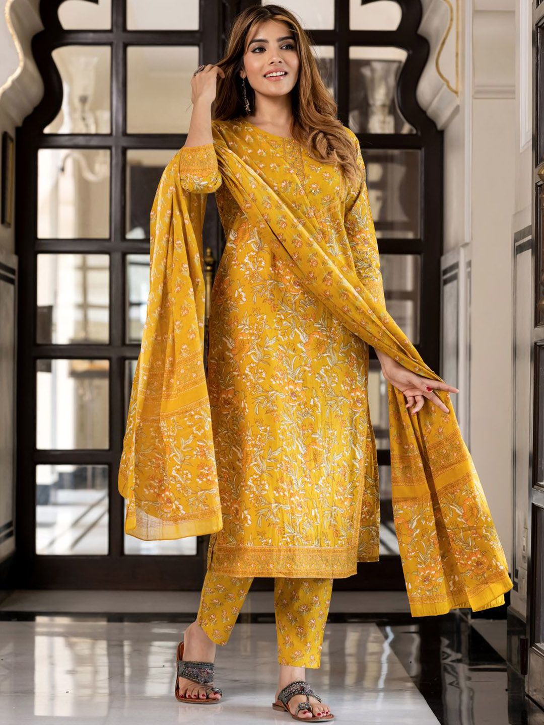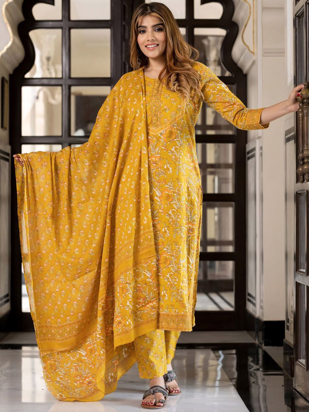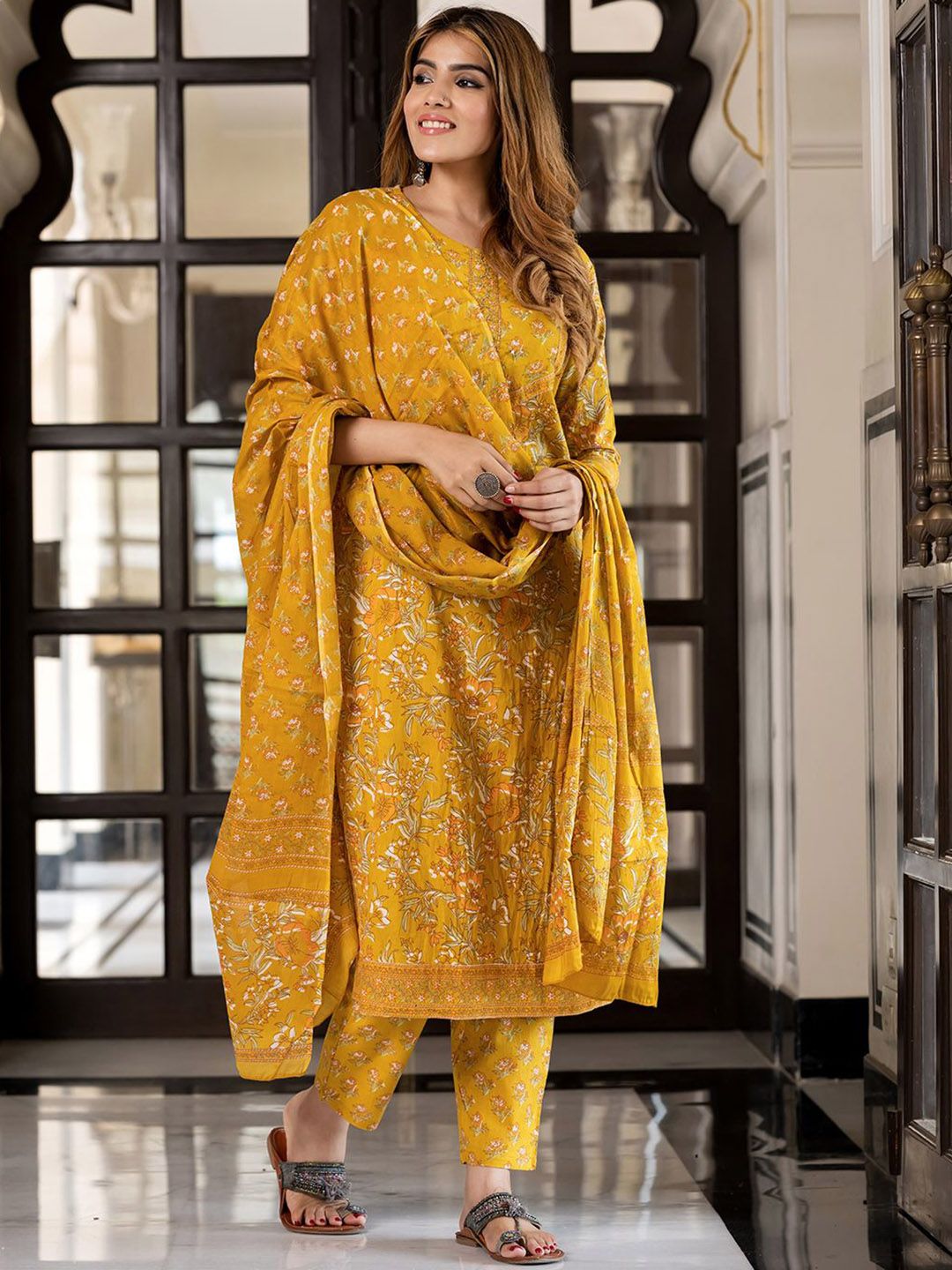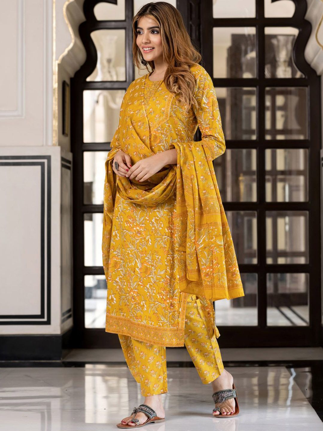 Buy this stylish KALINI Women Floral Printed Sequinned Pure Cotton Kurta with Trousers & Dupatta at Marincart Nepal. This product offers great quality and value. Perfect for those looking for the latest trends in fashion. Get yours now at unbeatable prices.