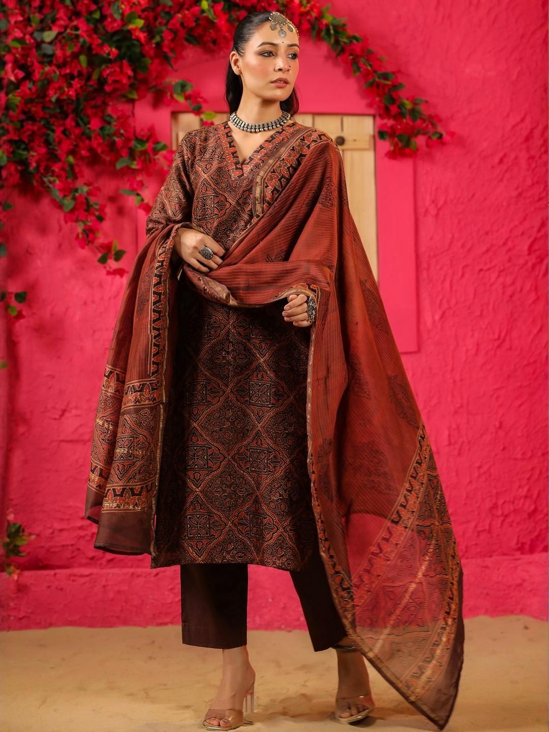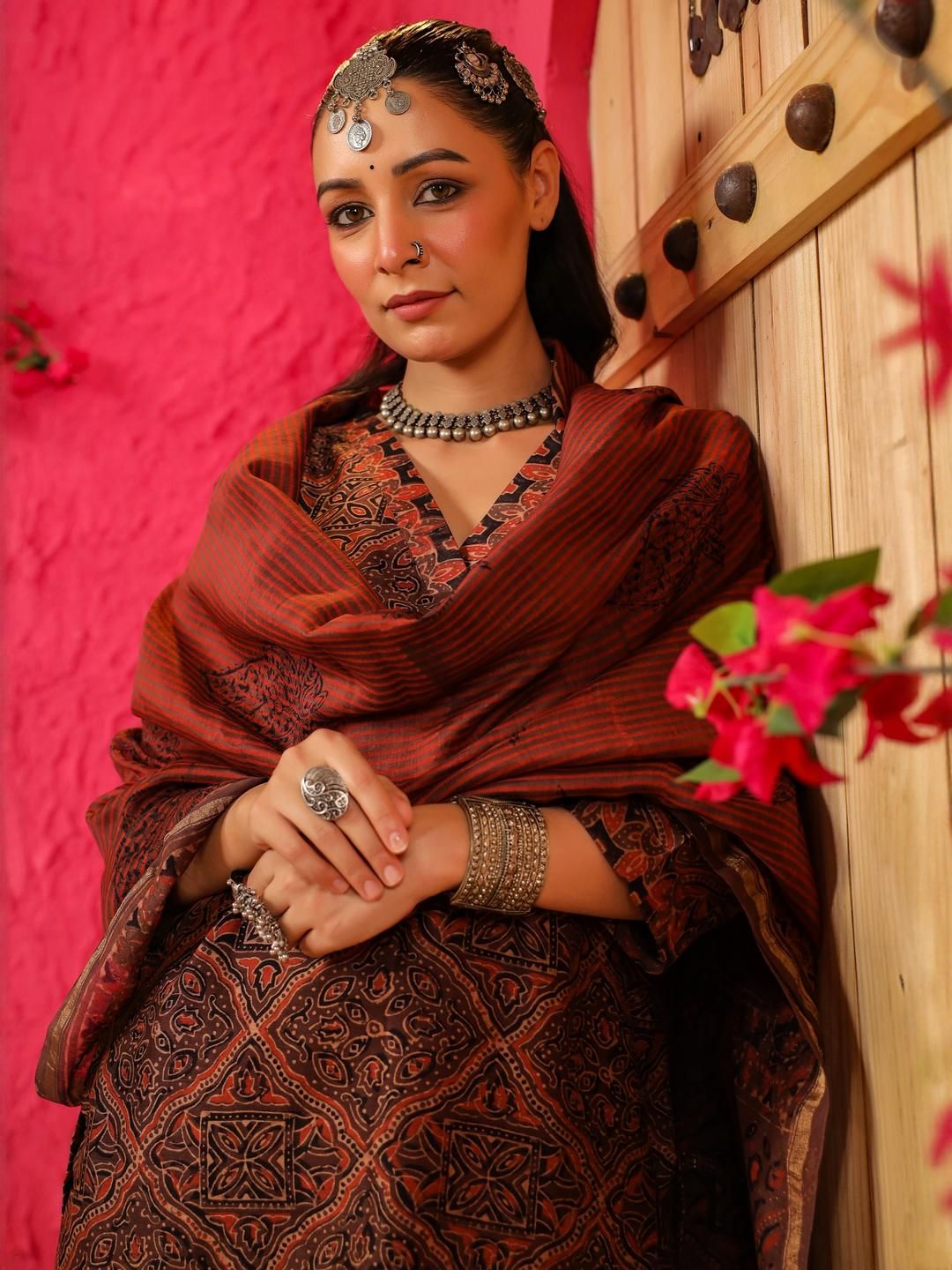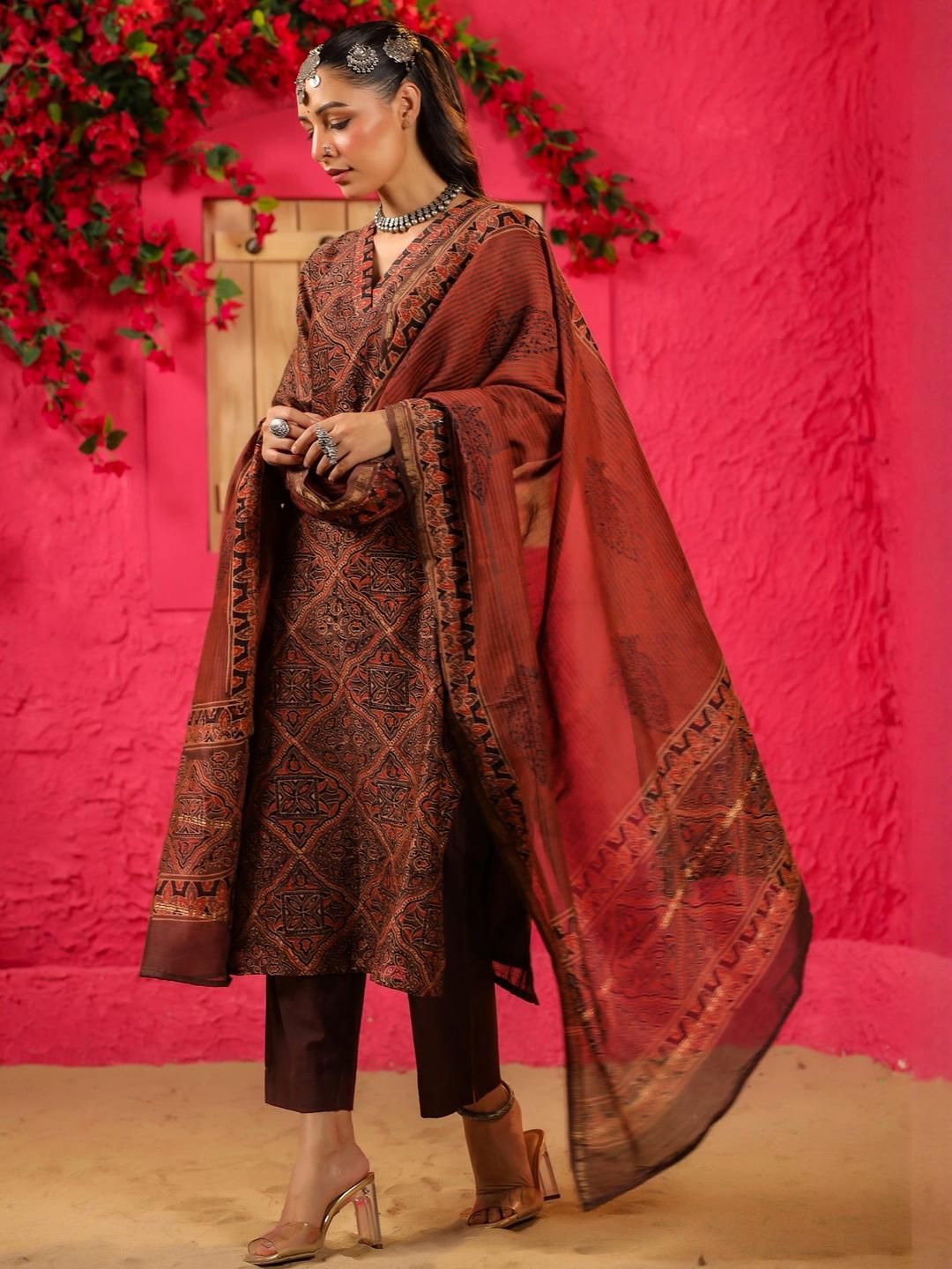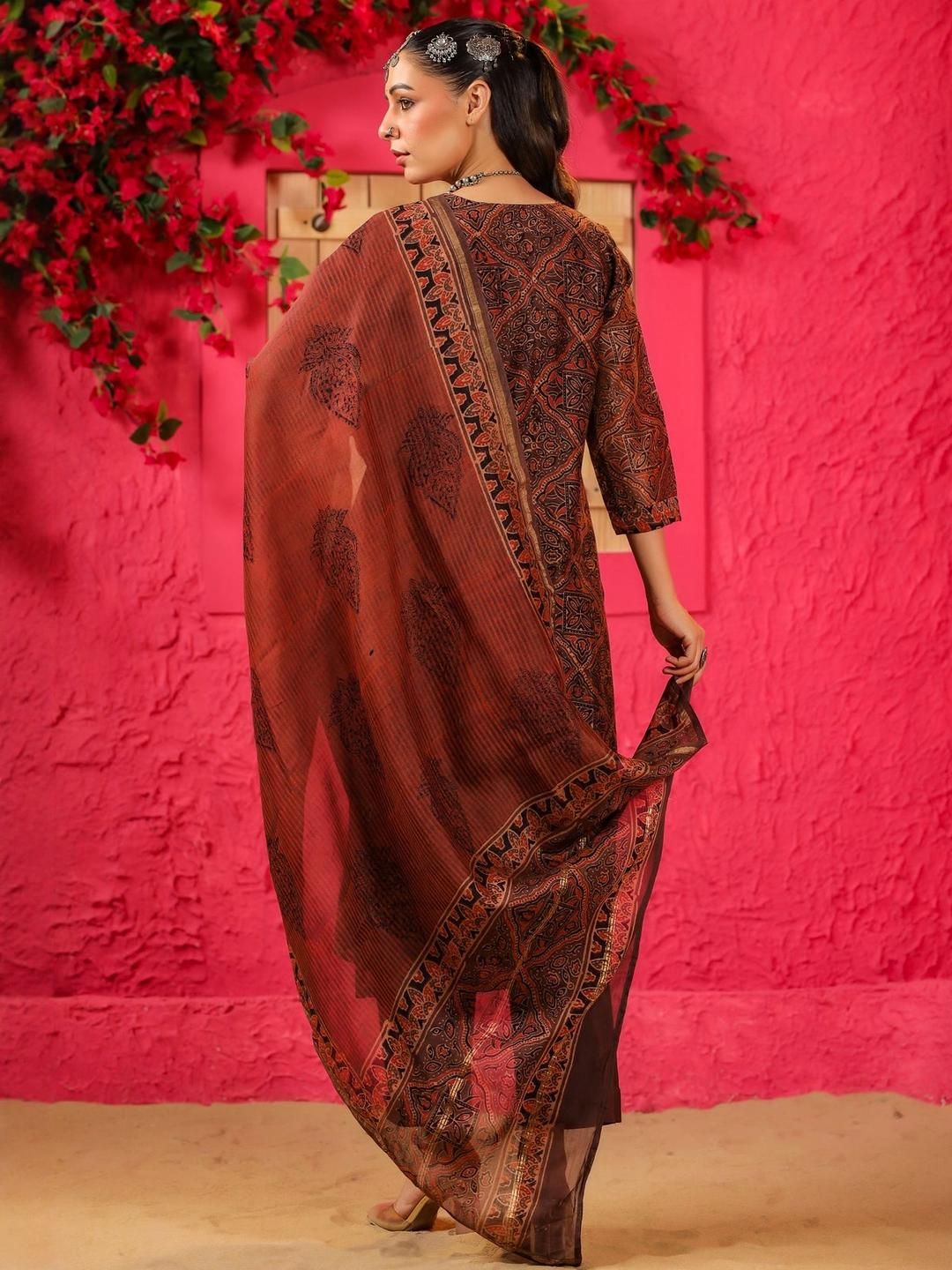 KALINI Women Rust Viscose Rayon Printed Kurta Sets