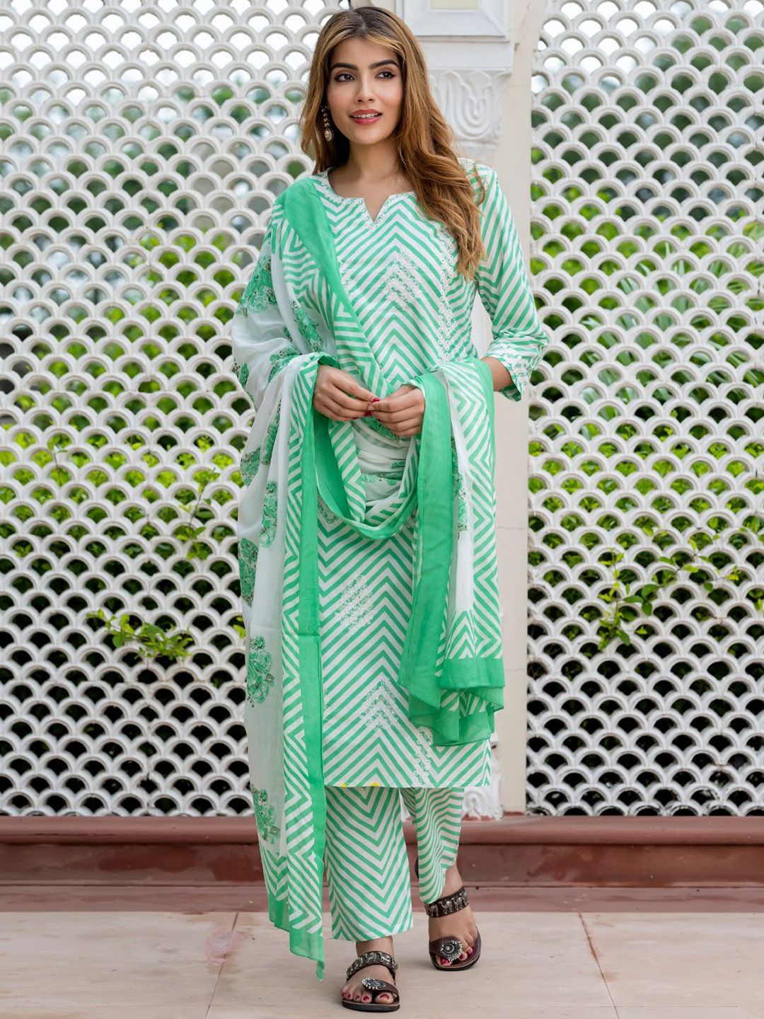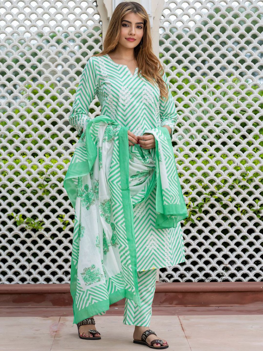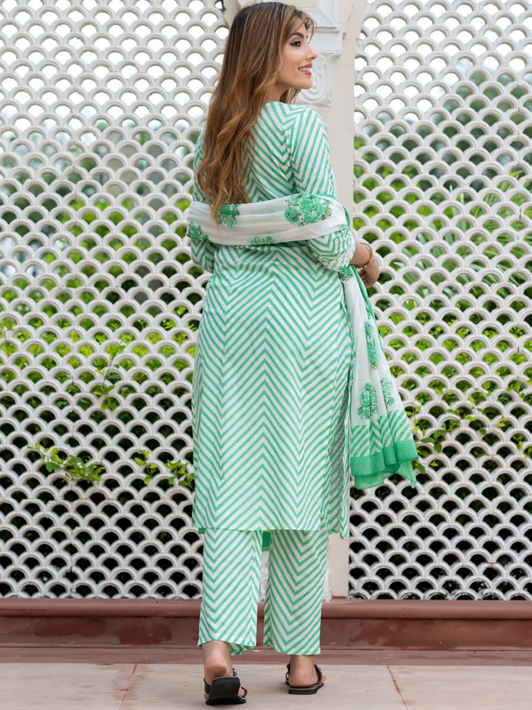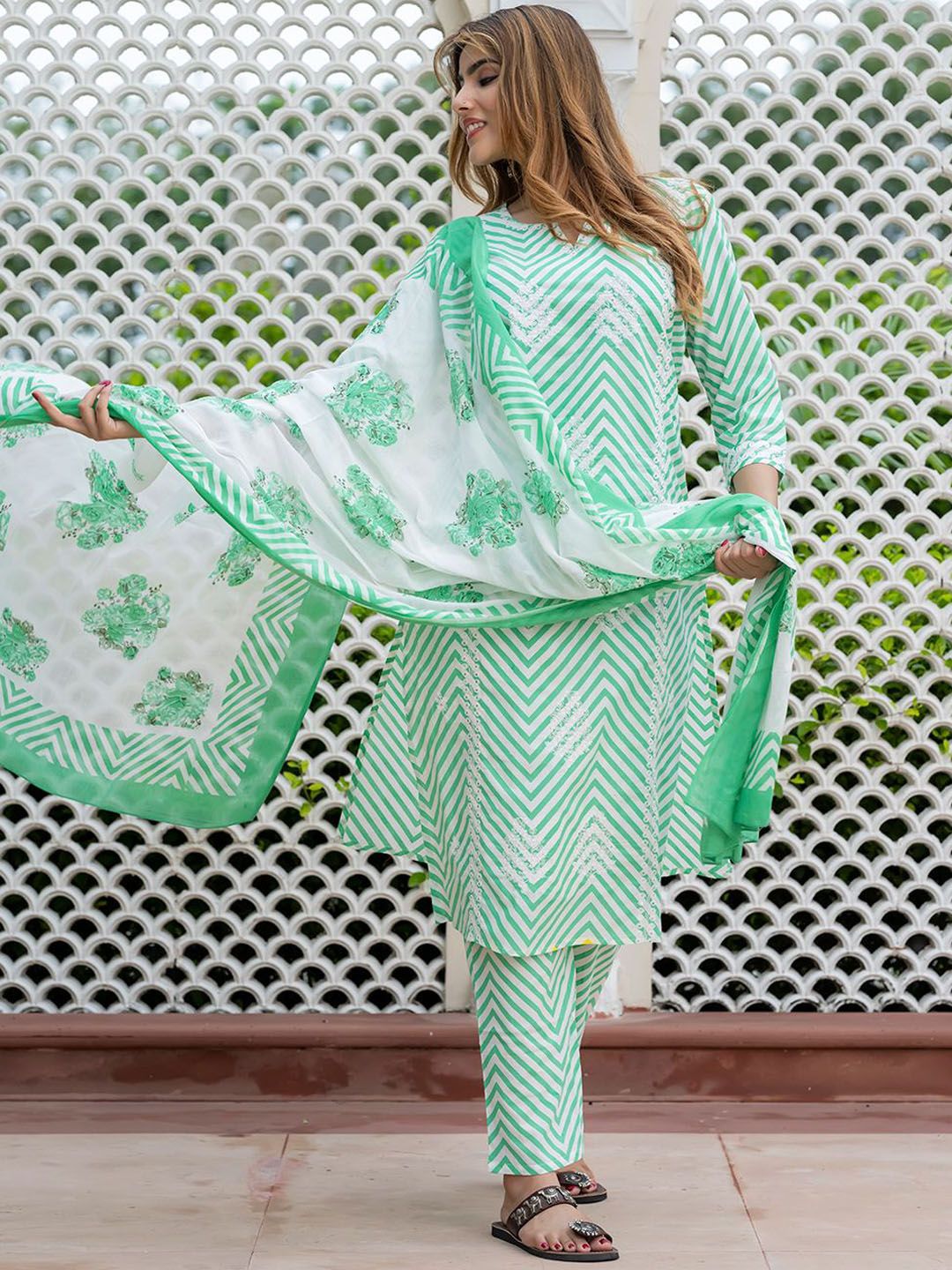 KALINI Women Striped Printed Round Neck Pure Cotton Kurta with Trousers & Dupatta